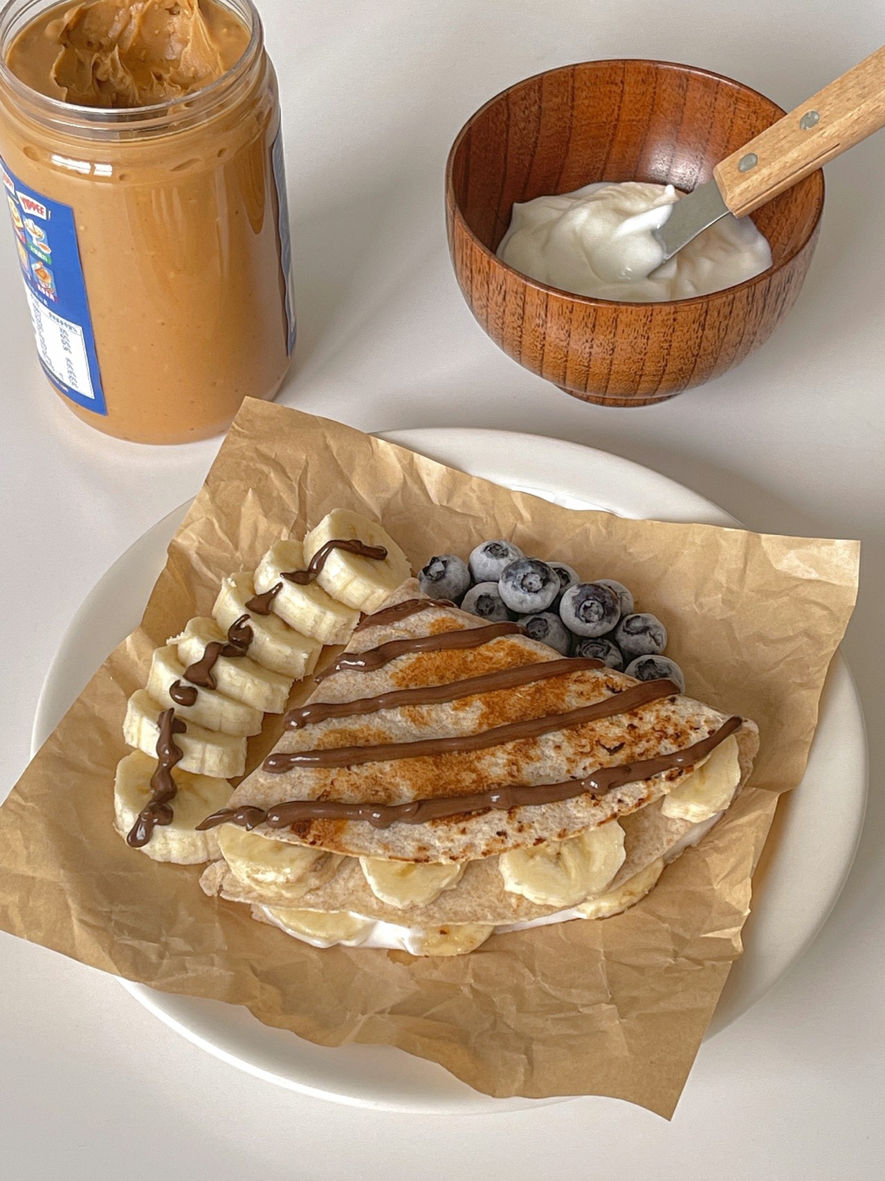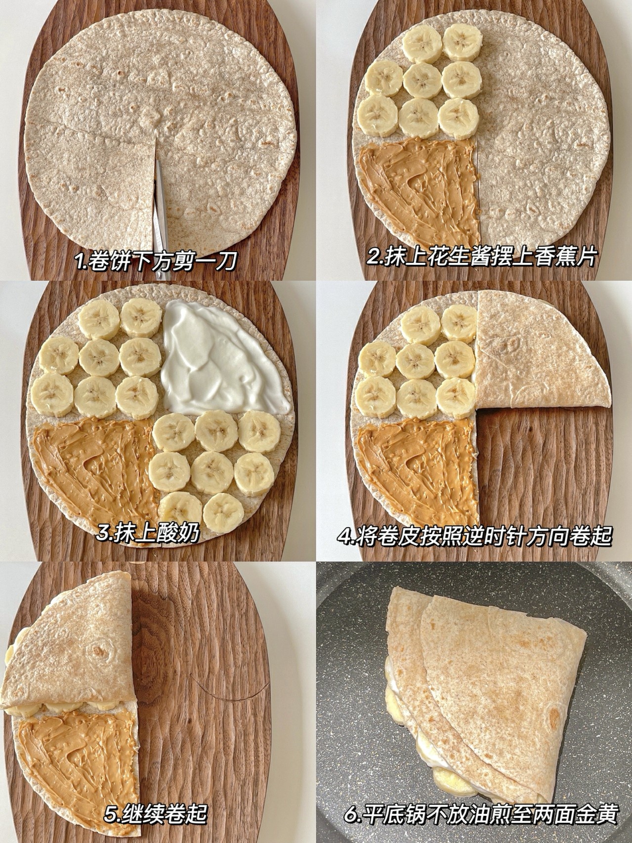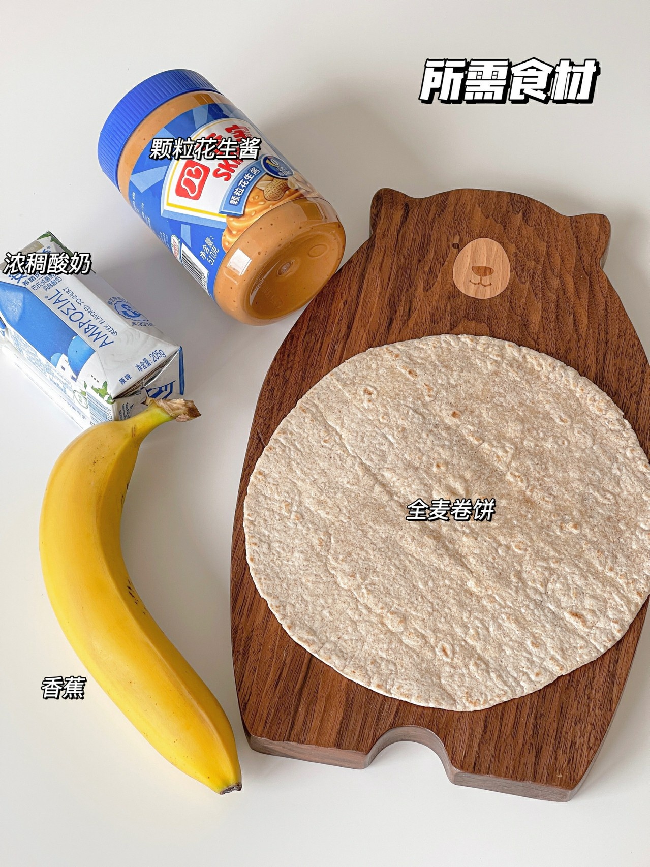 低脂花生酱、无糖酸奶、香蕉、全麦卷饼