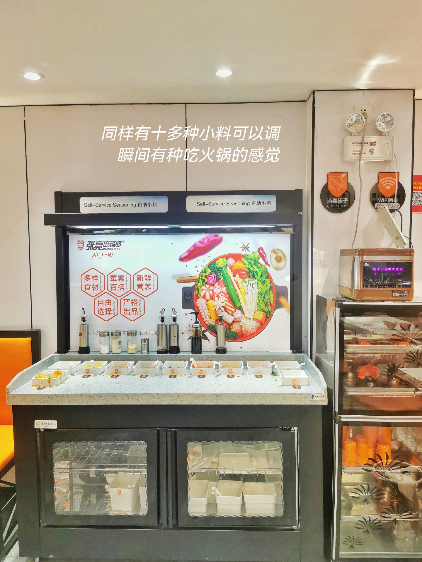 对了,调料也是DIY的,麻汁酱、蒜泥、葱段、辣椒酱等,同样有十多种调料,和吃火锅一样,想吃啥调啥呗。