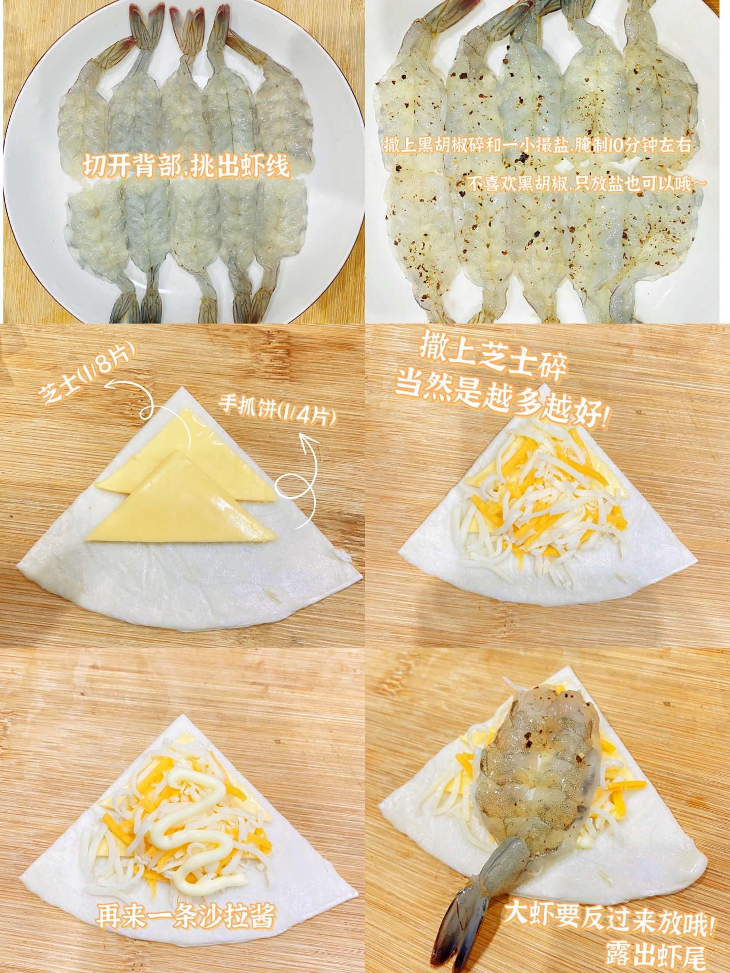 ③按图示顺序依次放手抓饼、芝士片、芝士碎、沙拉酱、虾,捏起来后翻面