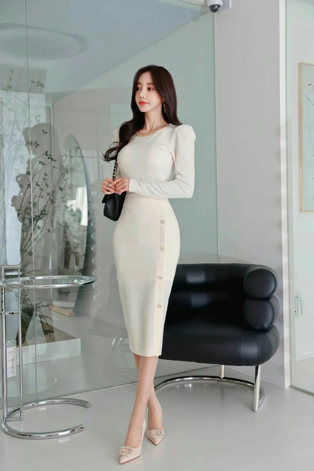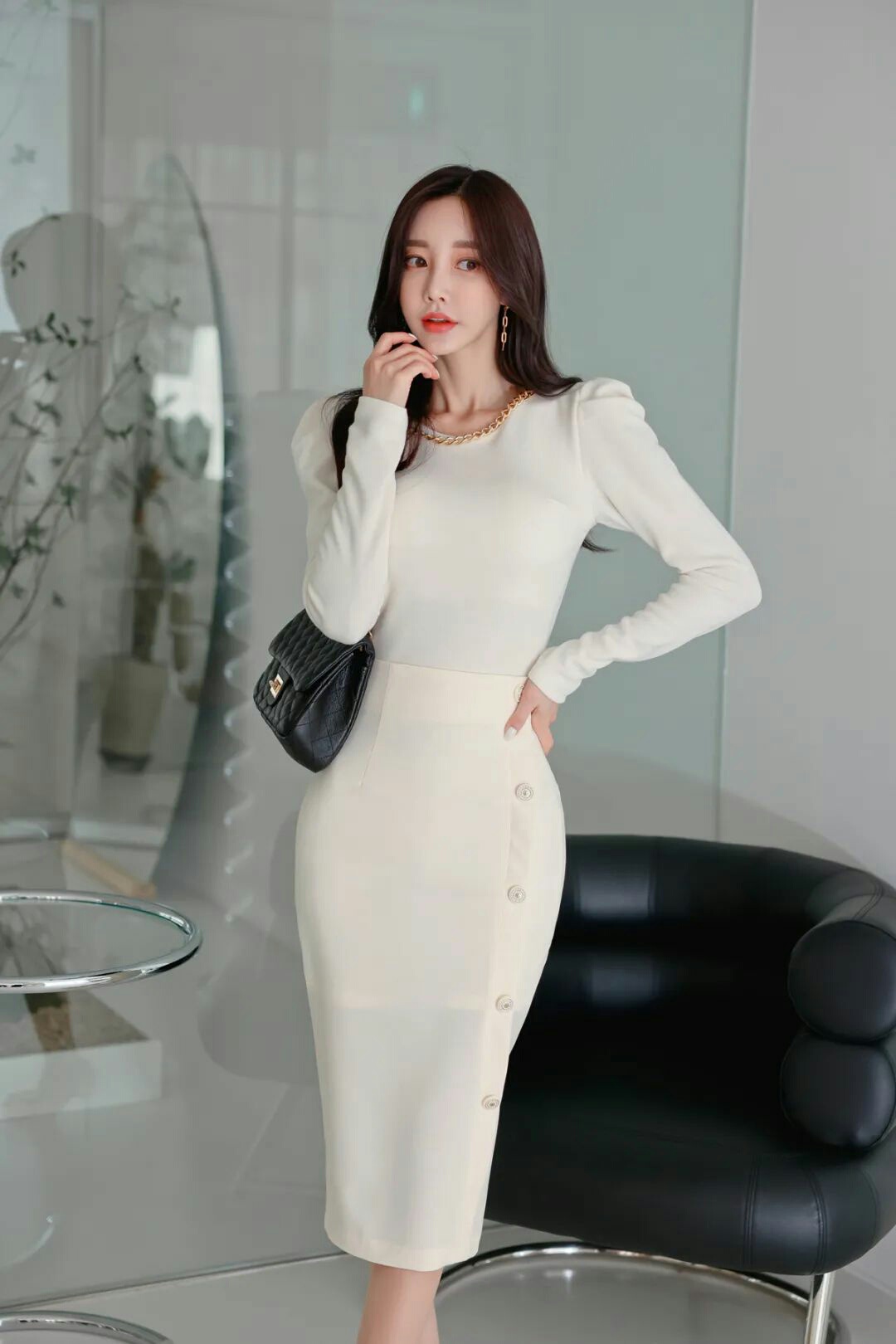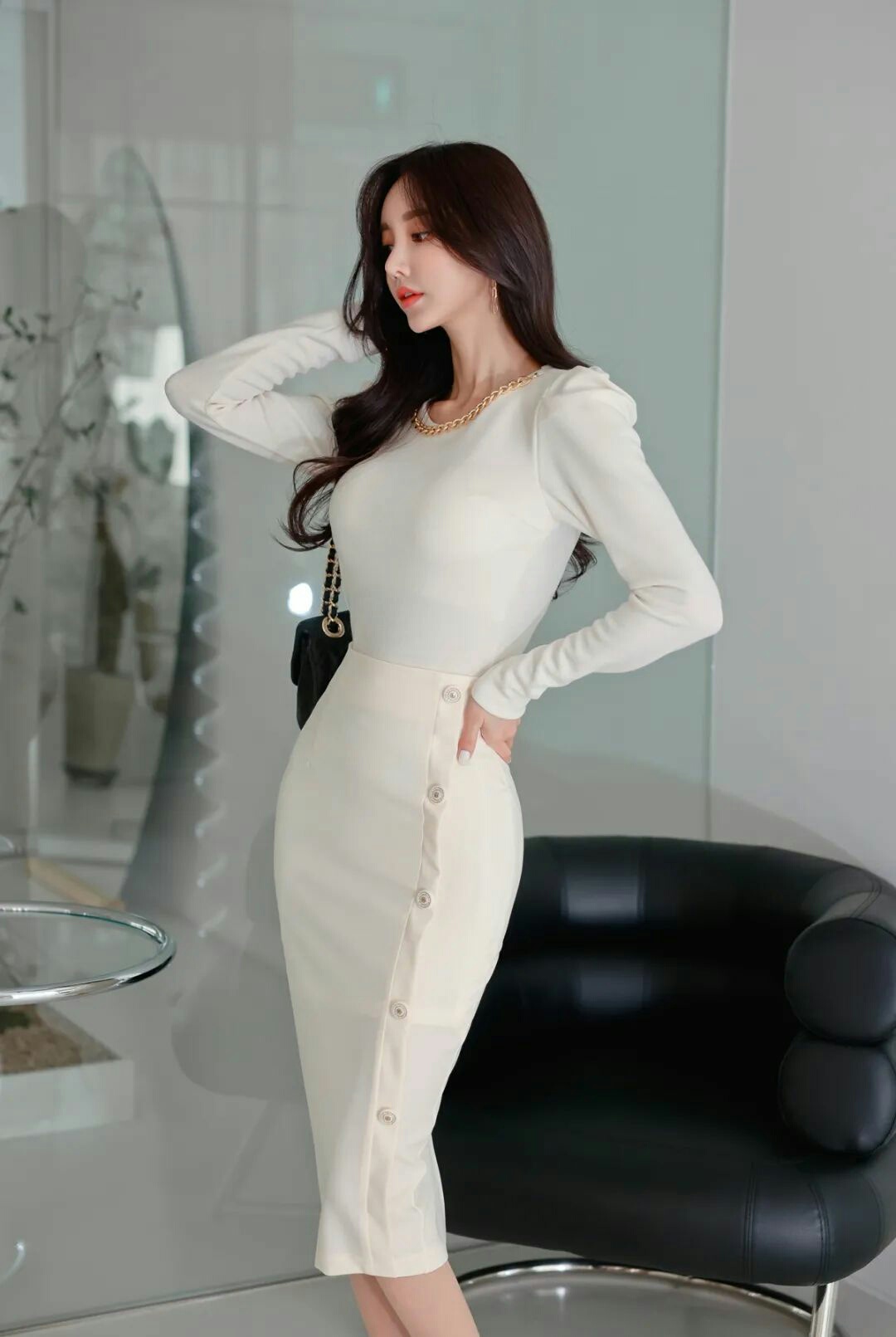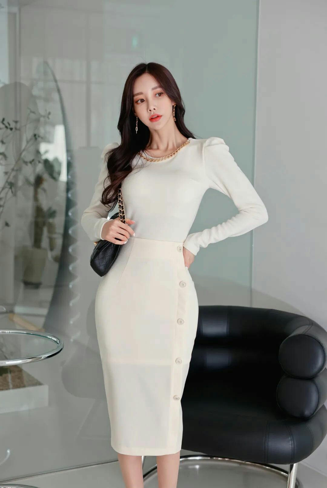 美女时尚写真:链条白色紧身上衣搭配纽扣鱼尾裙-美图社区-美图秀秀