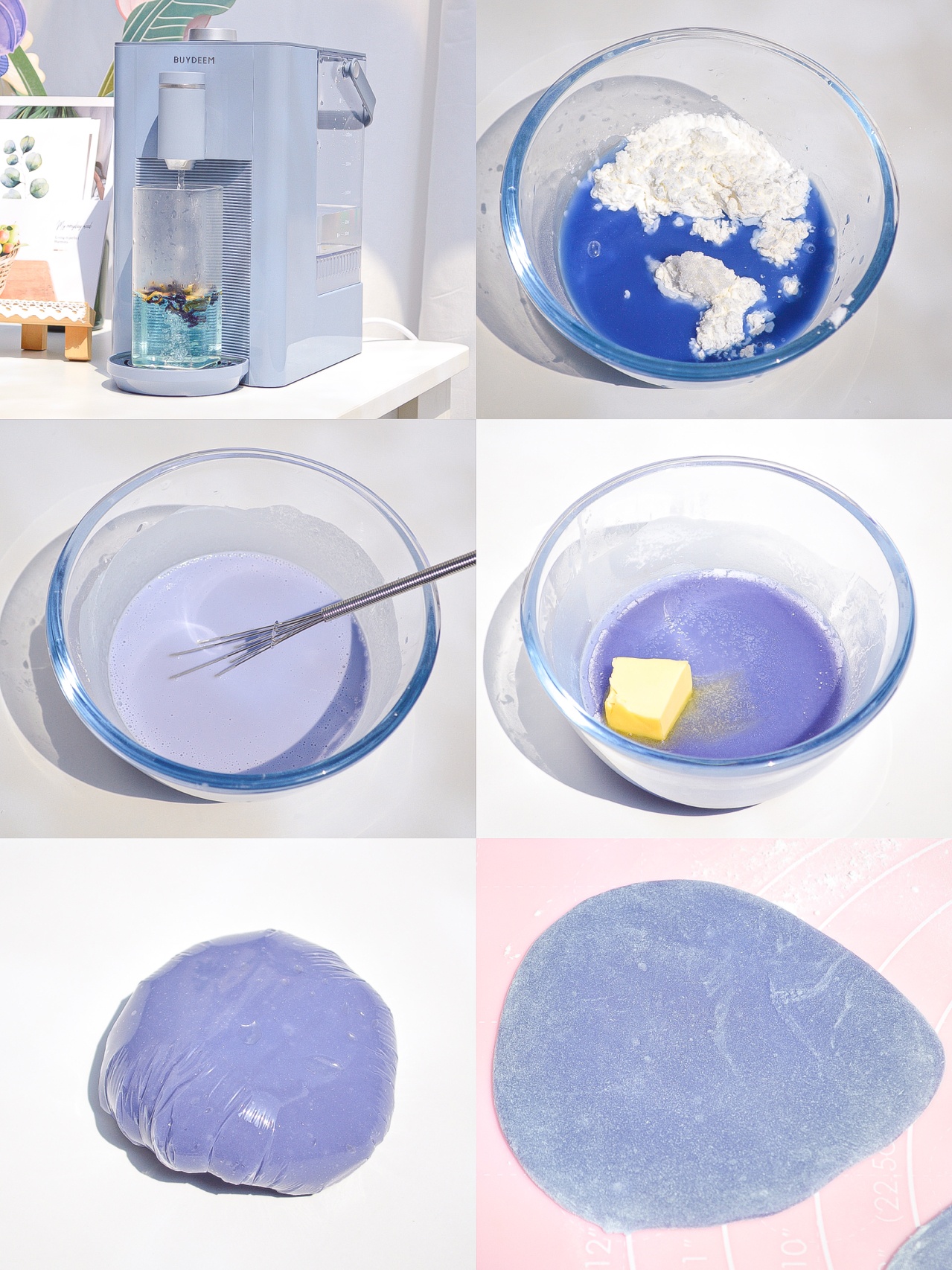 糯米粉50g,玉米淀粉15g,糖20g,蝶豆花水85g,黄油12g