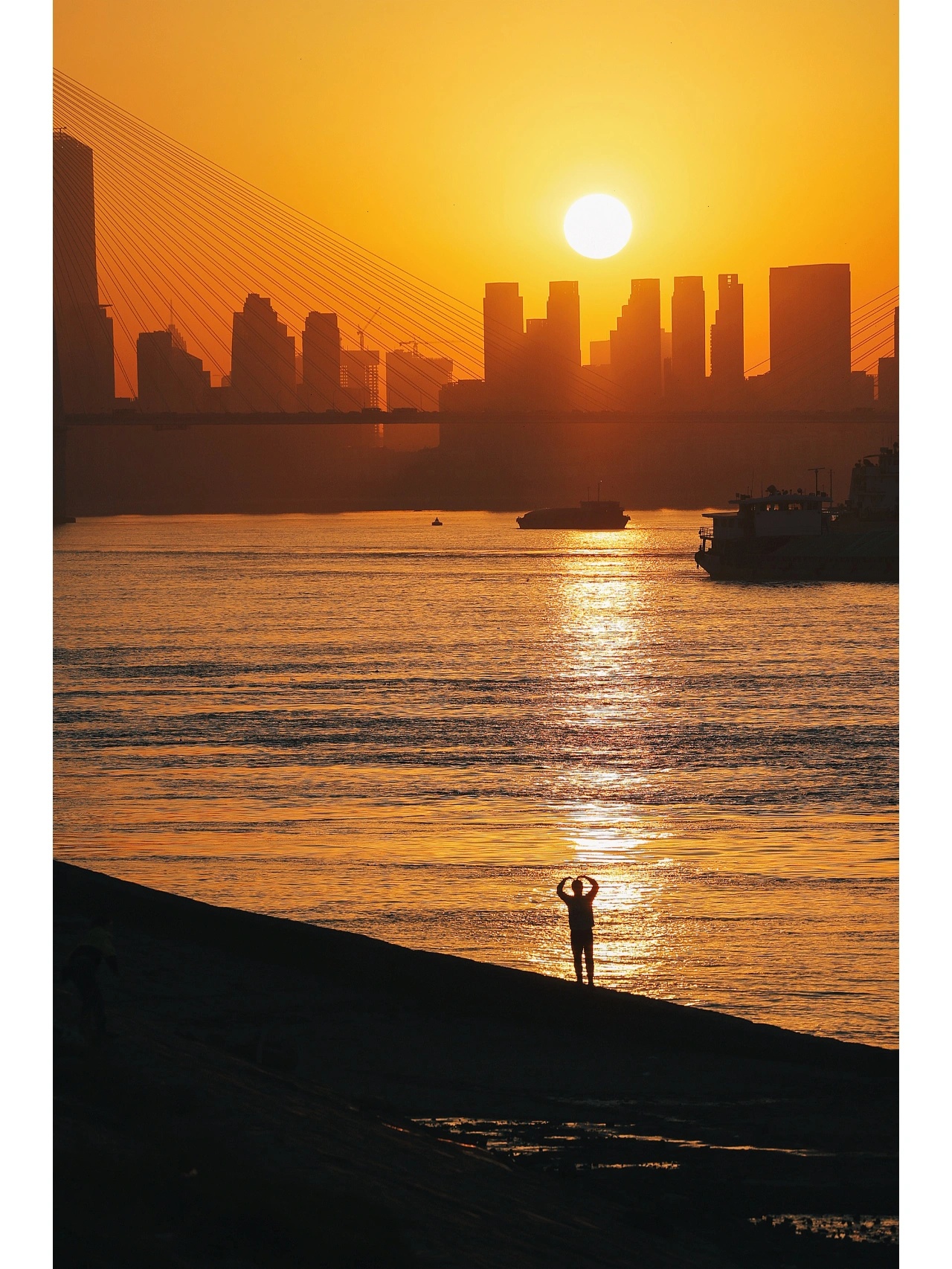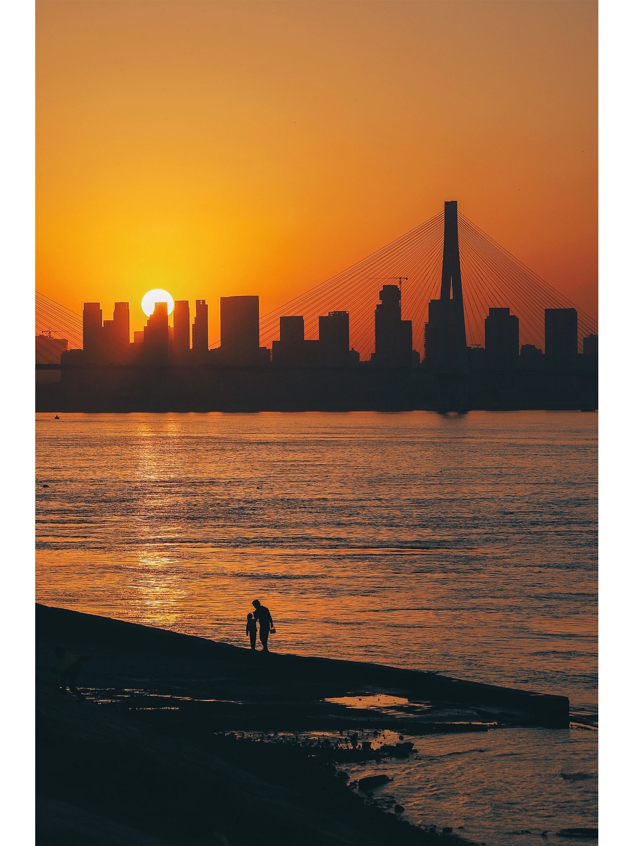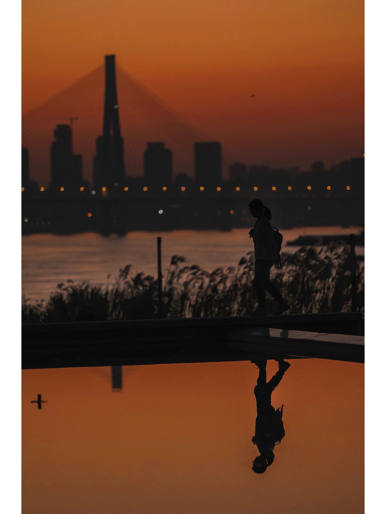 又到了长江枯水期,“看海”的季节没有“海”的青山江滩,周末人也不多。而黄昏来临,这里却有从二七桥和高楼落下的悬日夕阳。在亲水小路上,看眼前的江面粼粼波光,完全不输海边日落。