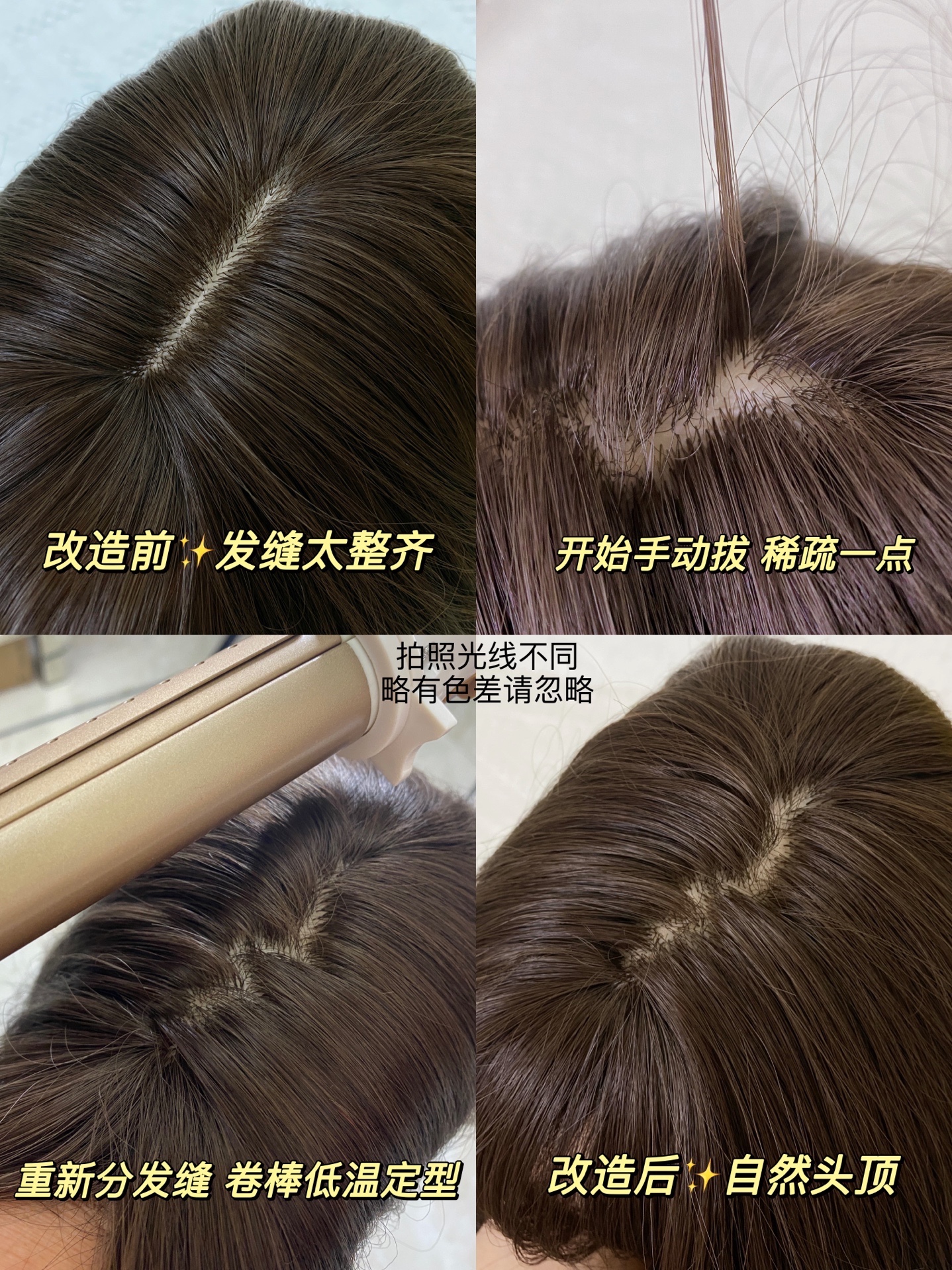 炒鸡自然!发缝原本是整整齐齐的,我把它重新分缝之后,头顶拔稀疏,头顶的很好拔,拔出自己心仪的样子,左右分几缕,低温夹板,往反方向压一下,打造凌乱的头顶更自然。