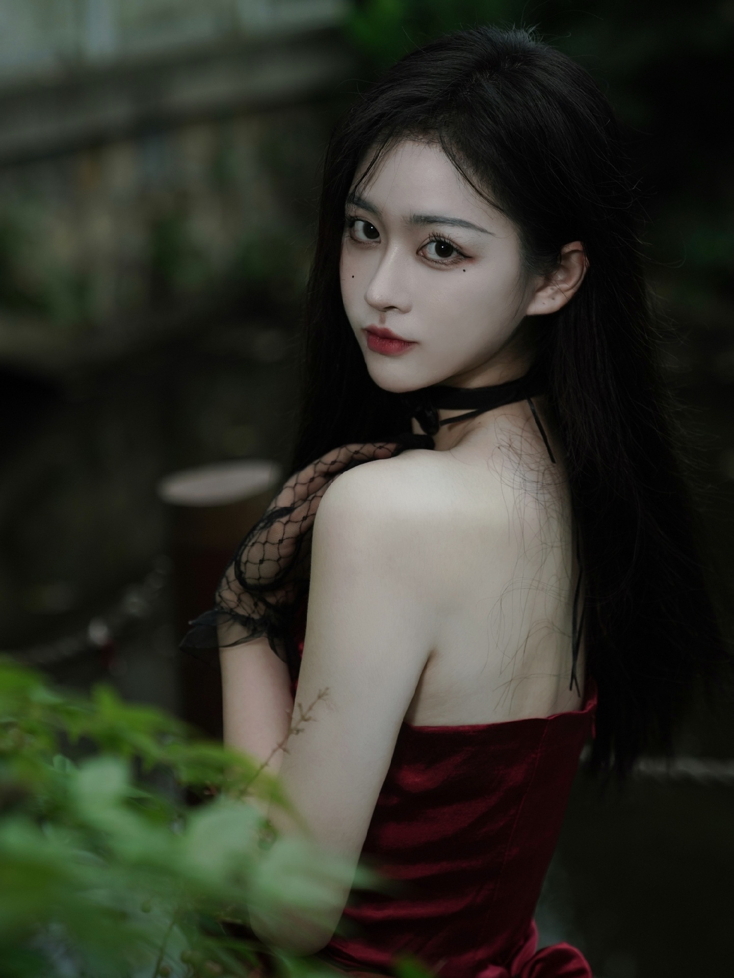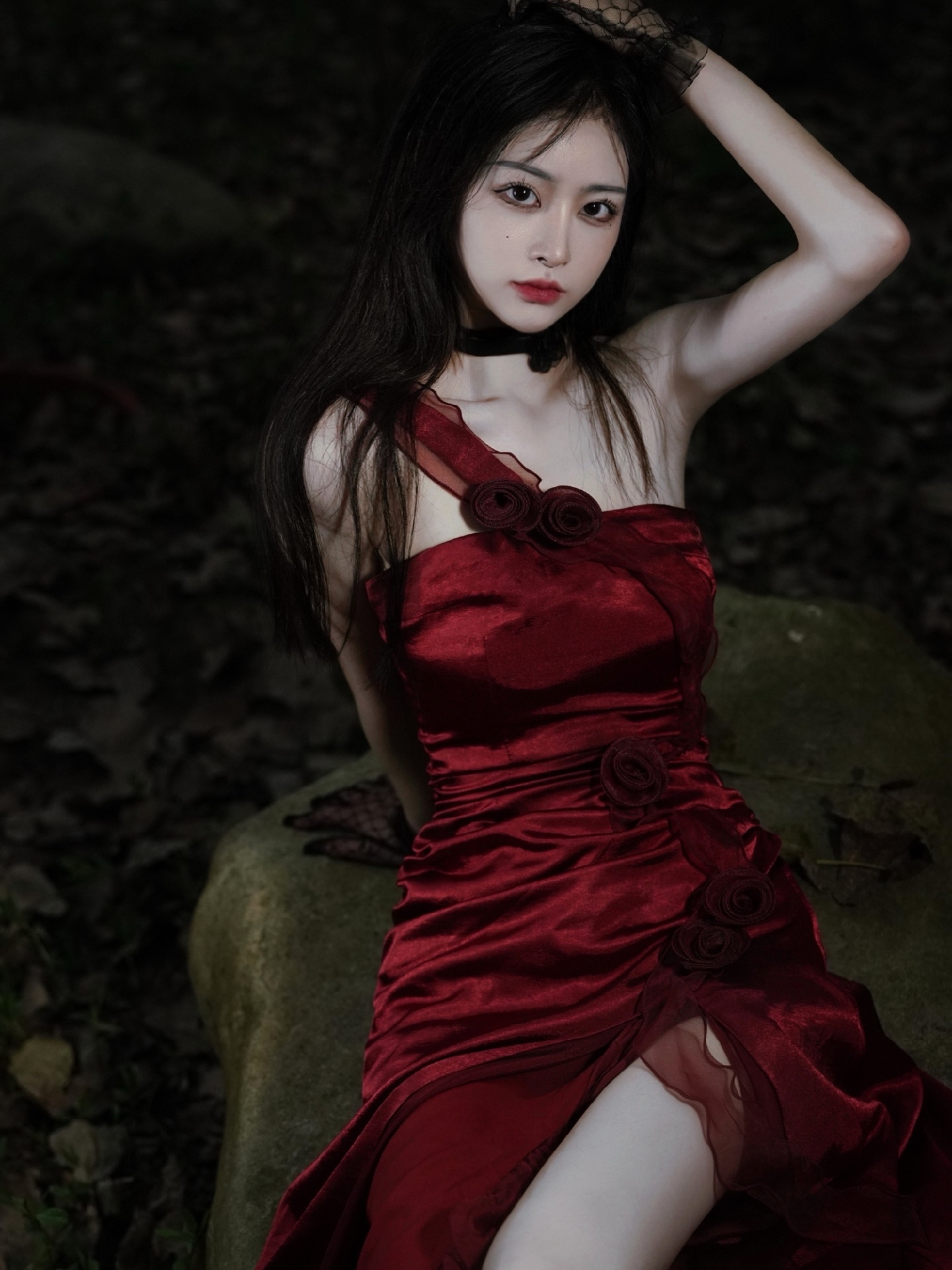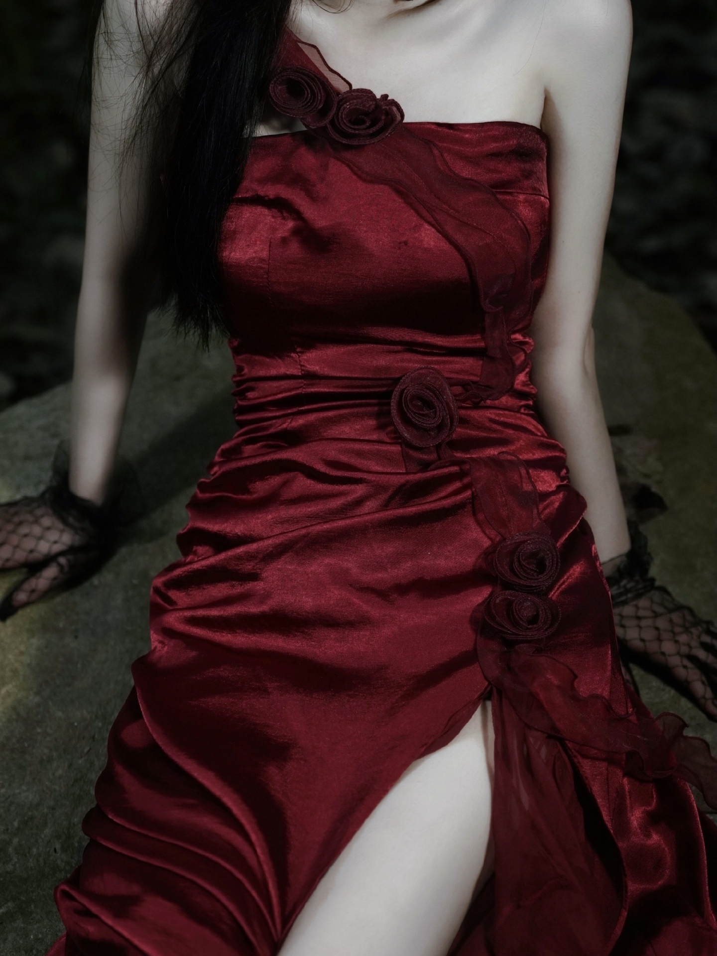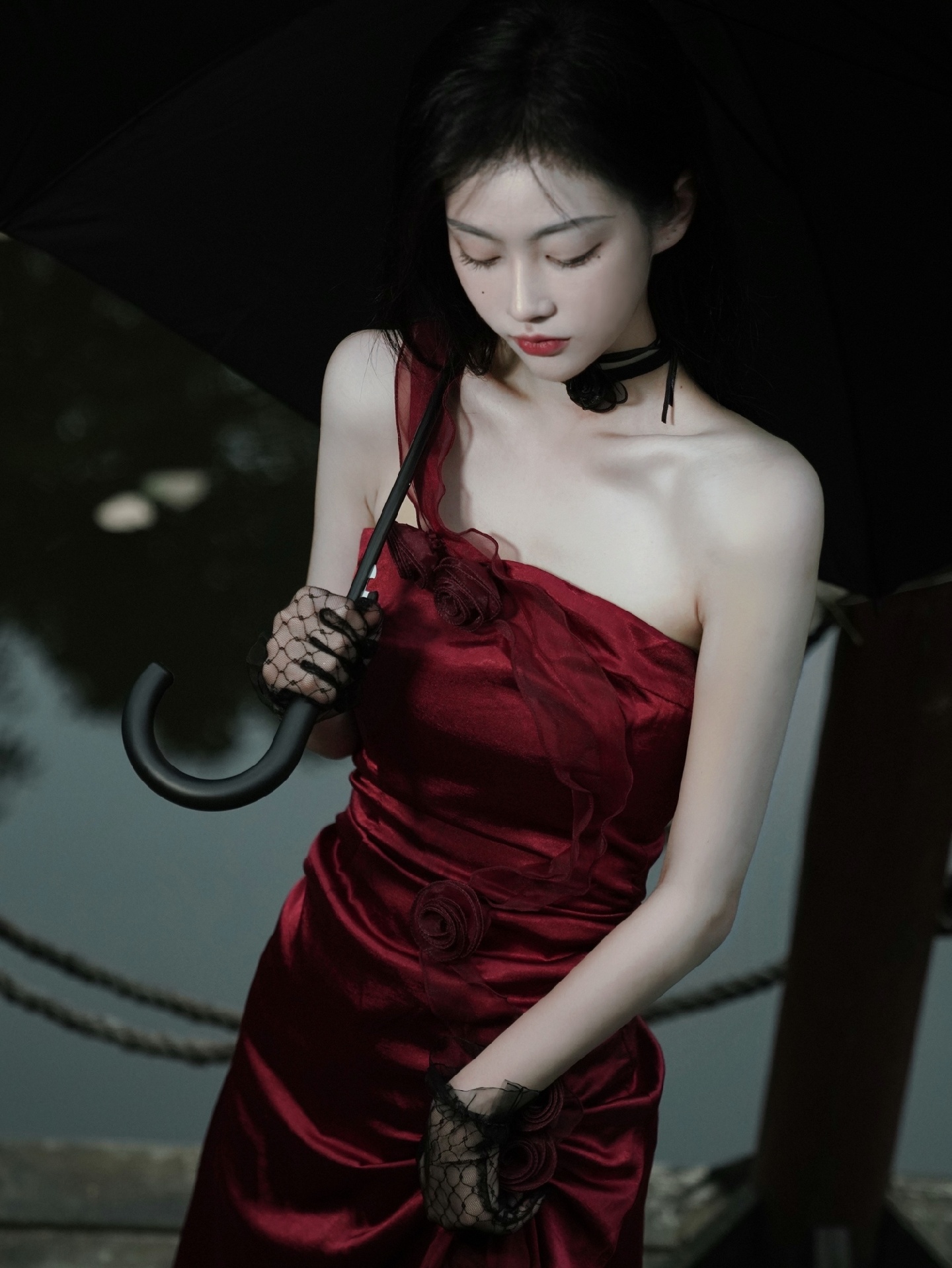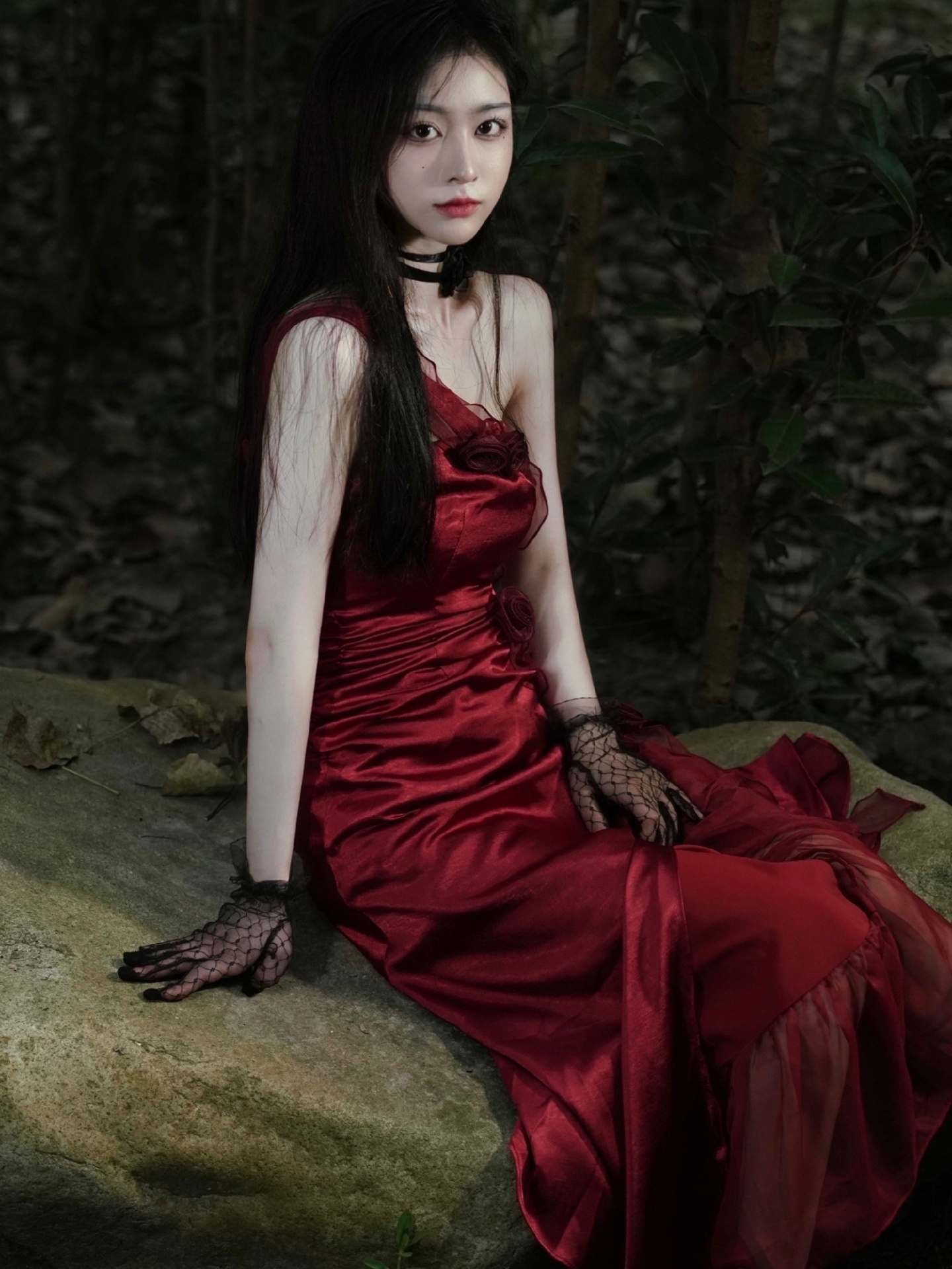 暗夜玫瑰红轻礼服裙,美艳动人,醋酸料丝滑有光泽,质感高级,做敬酒服穿也可~