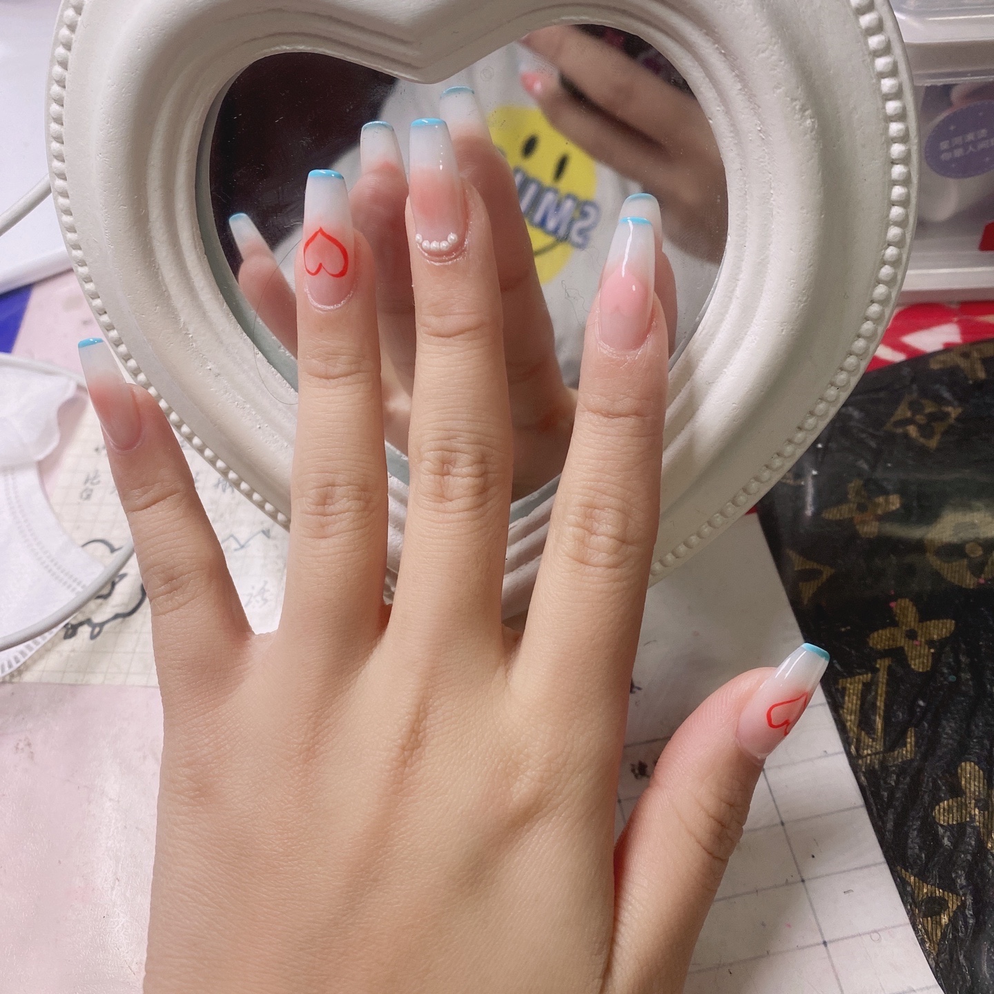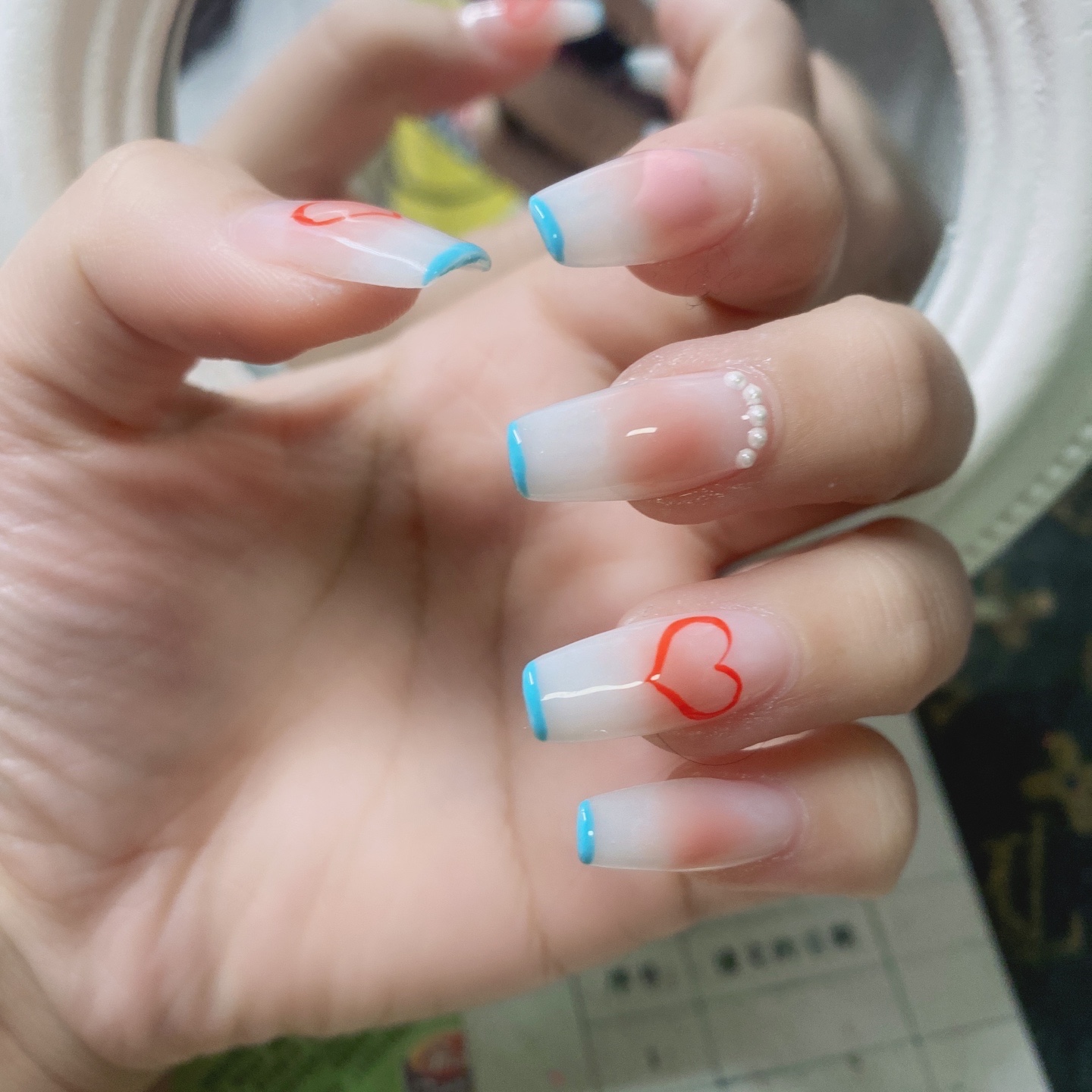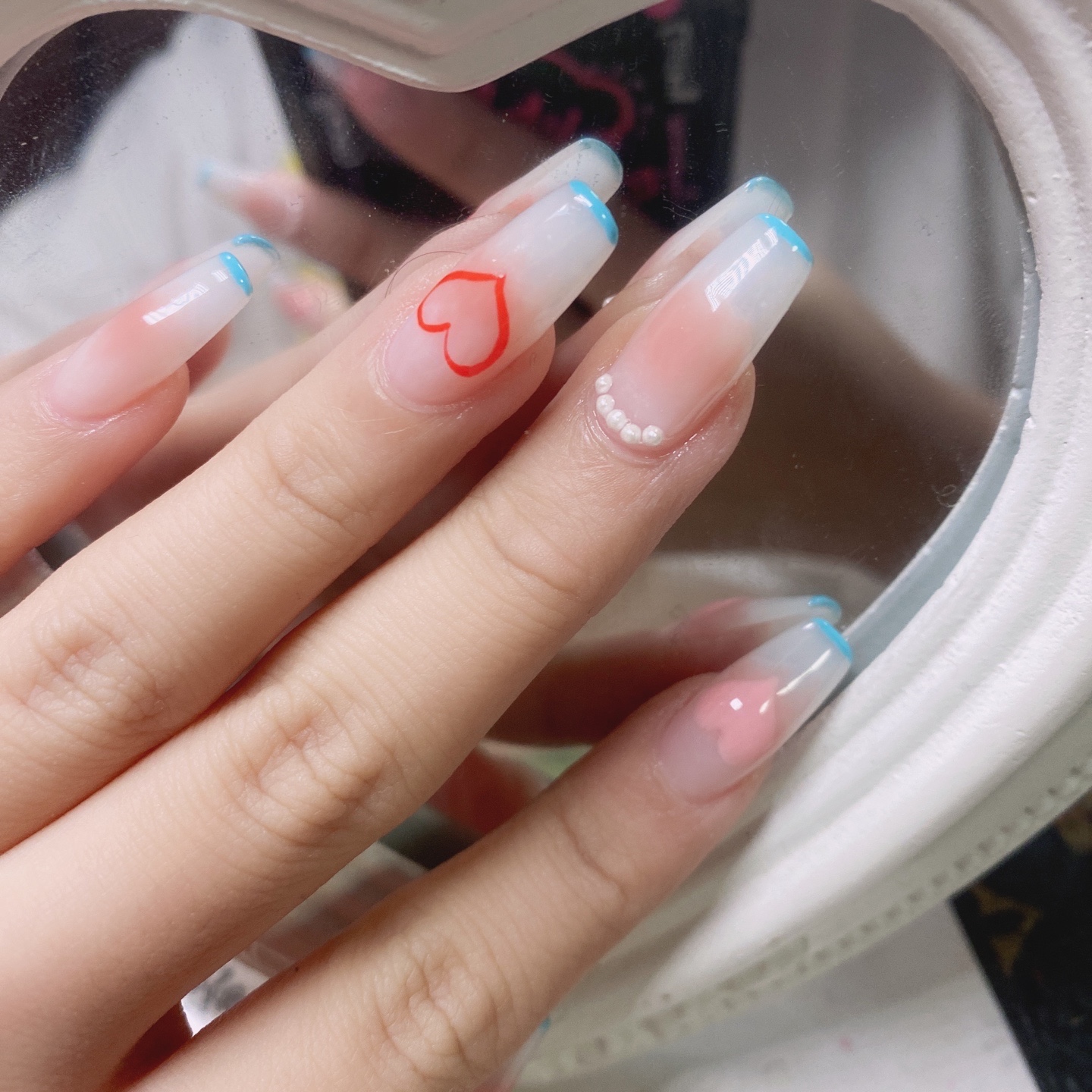 这比较属于腮红美甲,淡淡的粉色,画个小爱心,配上小珍珠,蓝色-美图社区-美图秀秀