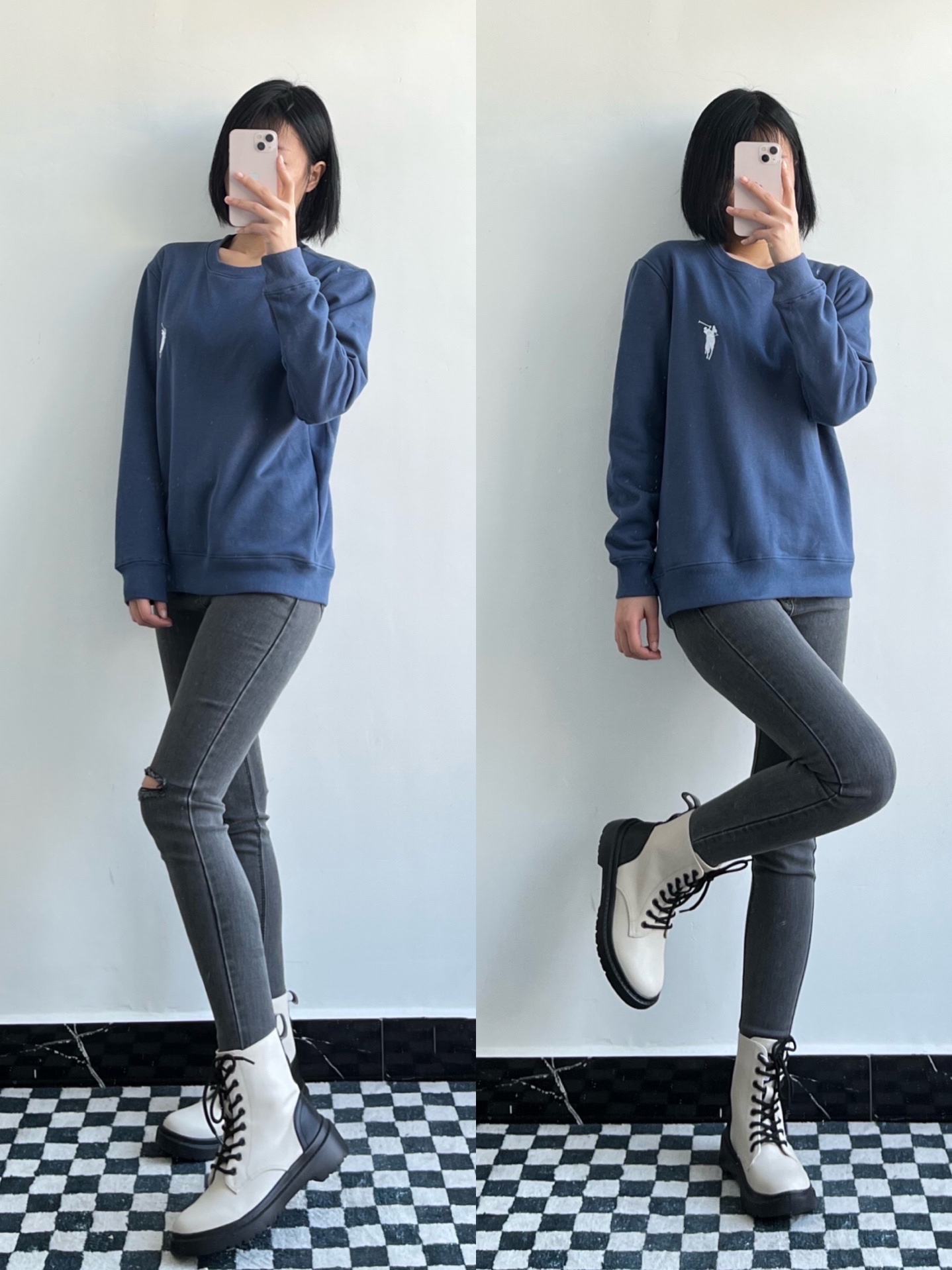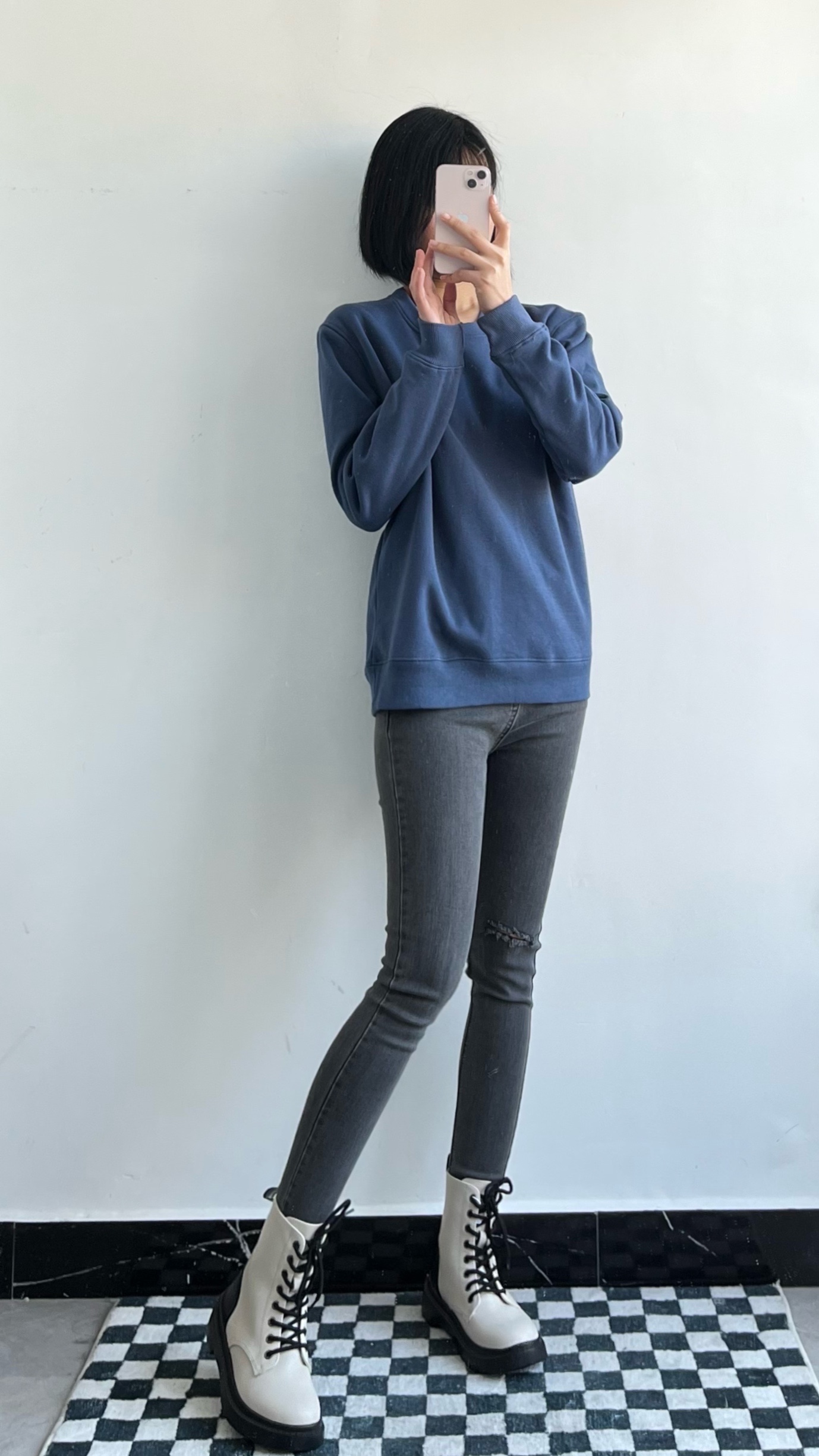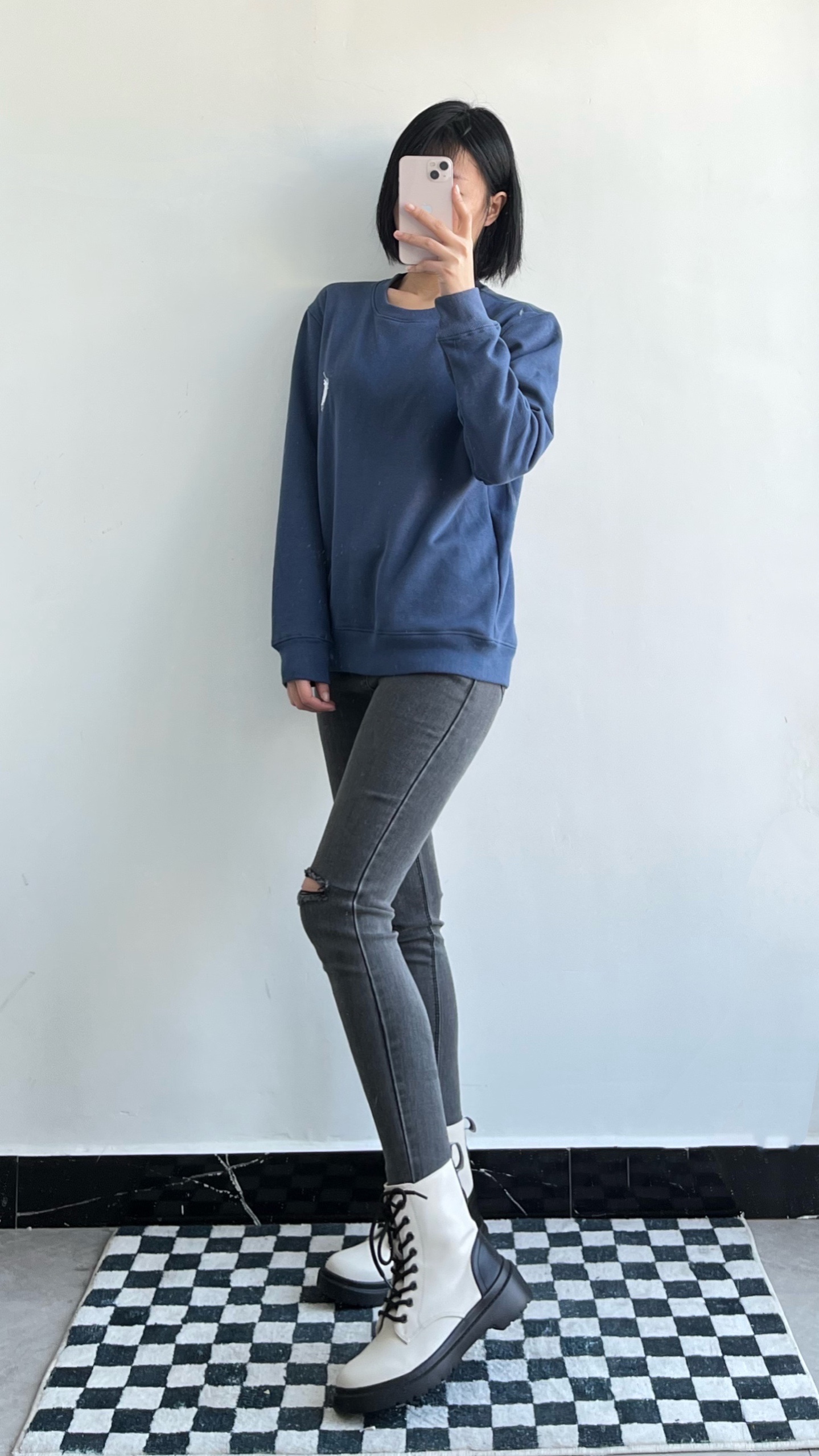 卫衣搭配牛仔裤,绝呀!搭配靴子妥妥的,蓝色我超爱,深蓝色怎么搭配都没问题。