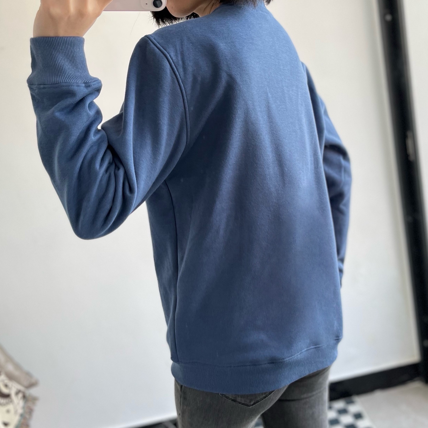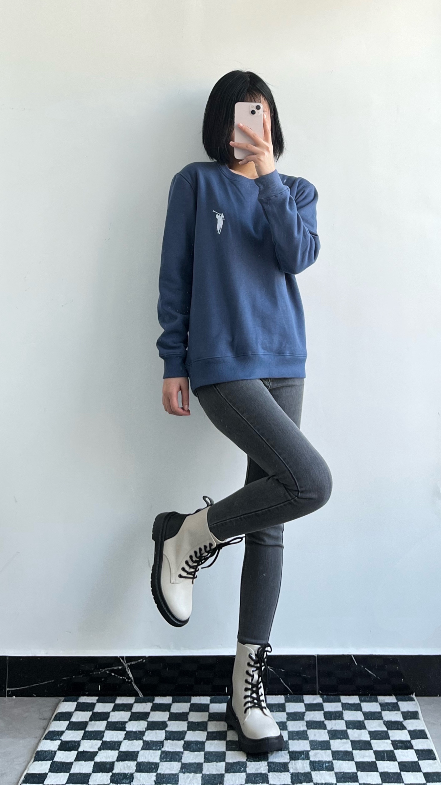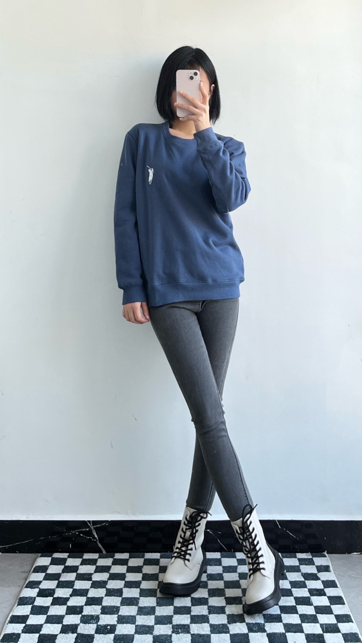 卫衣搭配牛仔裤,绝呀!搭配靴子妥妥的,蓝色我超爱,深蓝色怎么搭配都没问题。