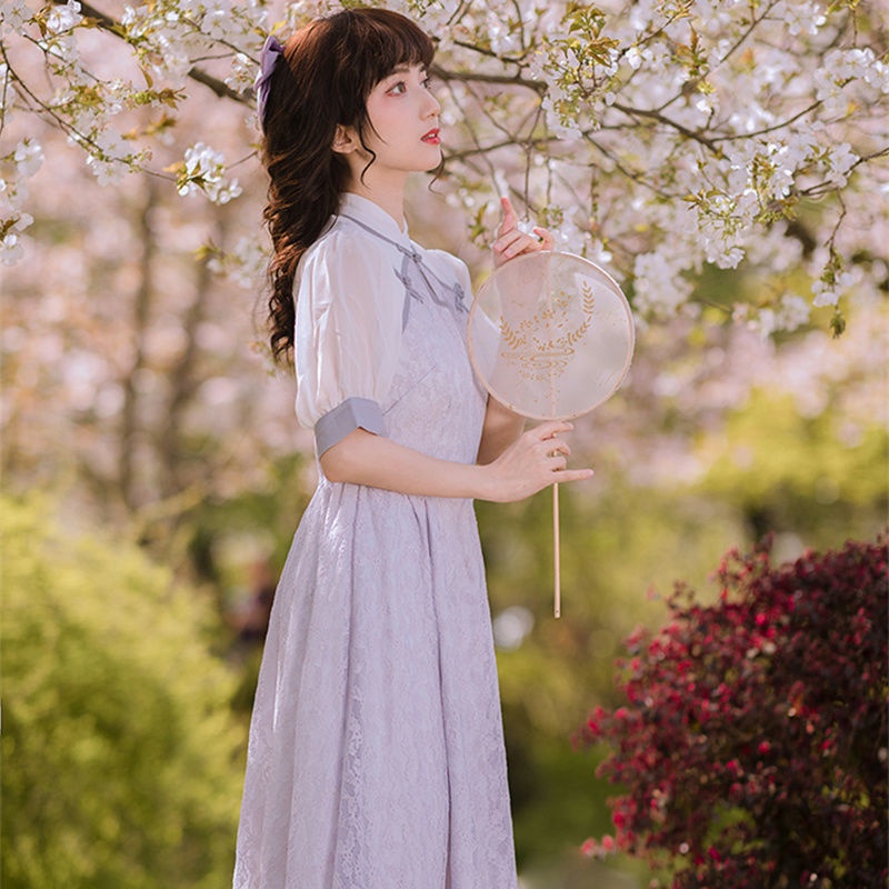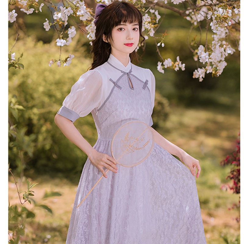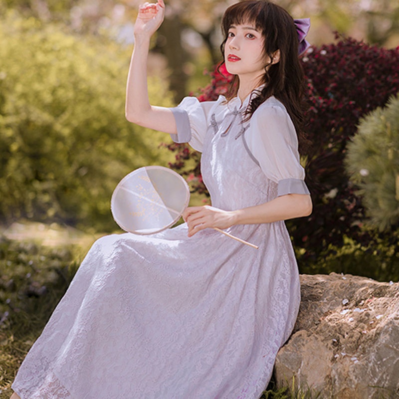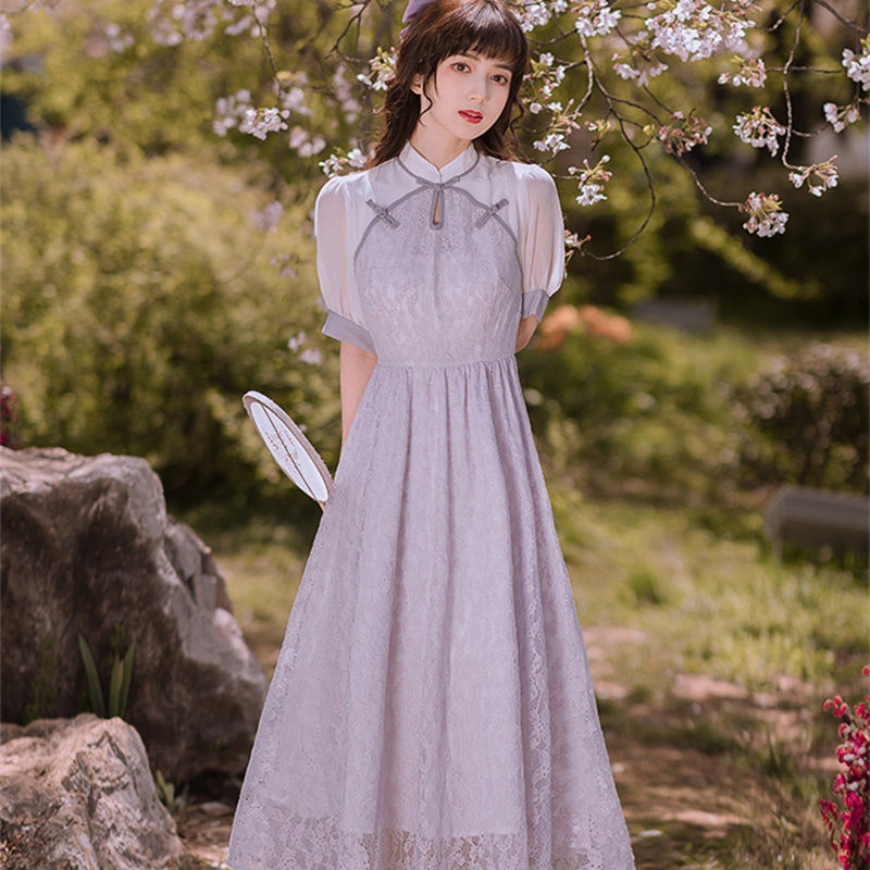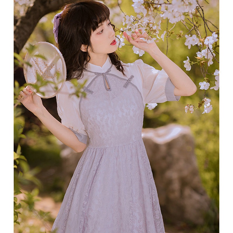 紫色改良版旗袍蕾丝淑女气质连衣裙女夏季新款中长款短袖优雅裙子