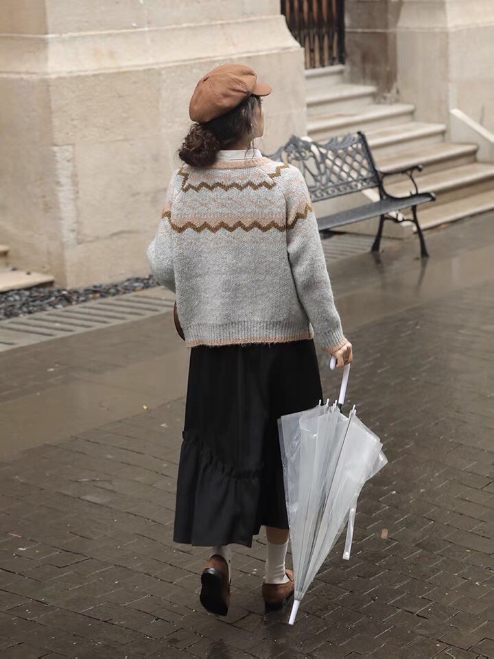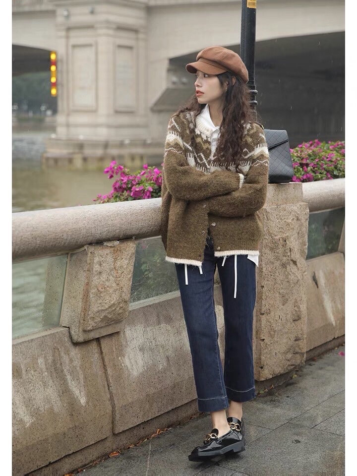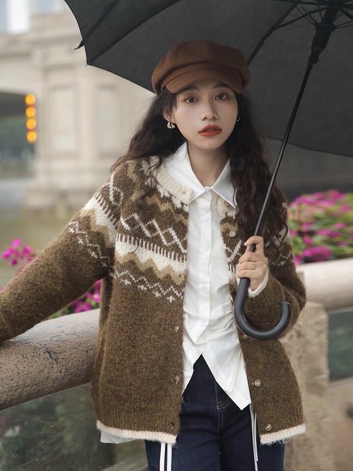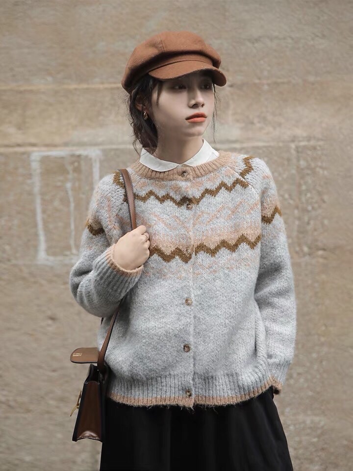 费尔岛软糯提花针织毛衣女秋冬新款单排扣气质圆领开衫外套