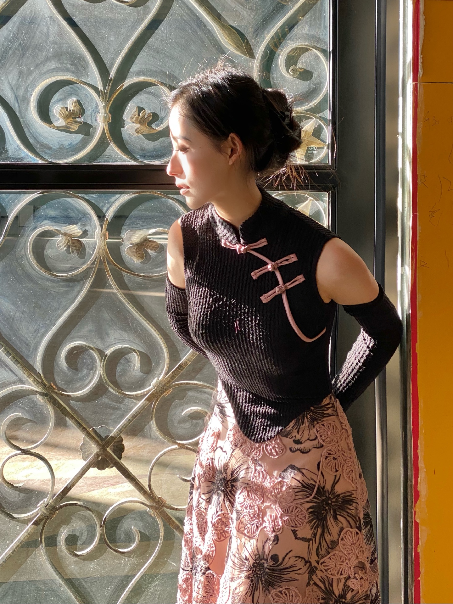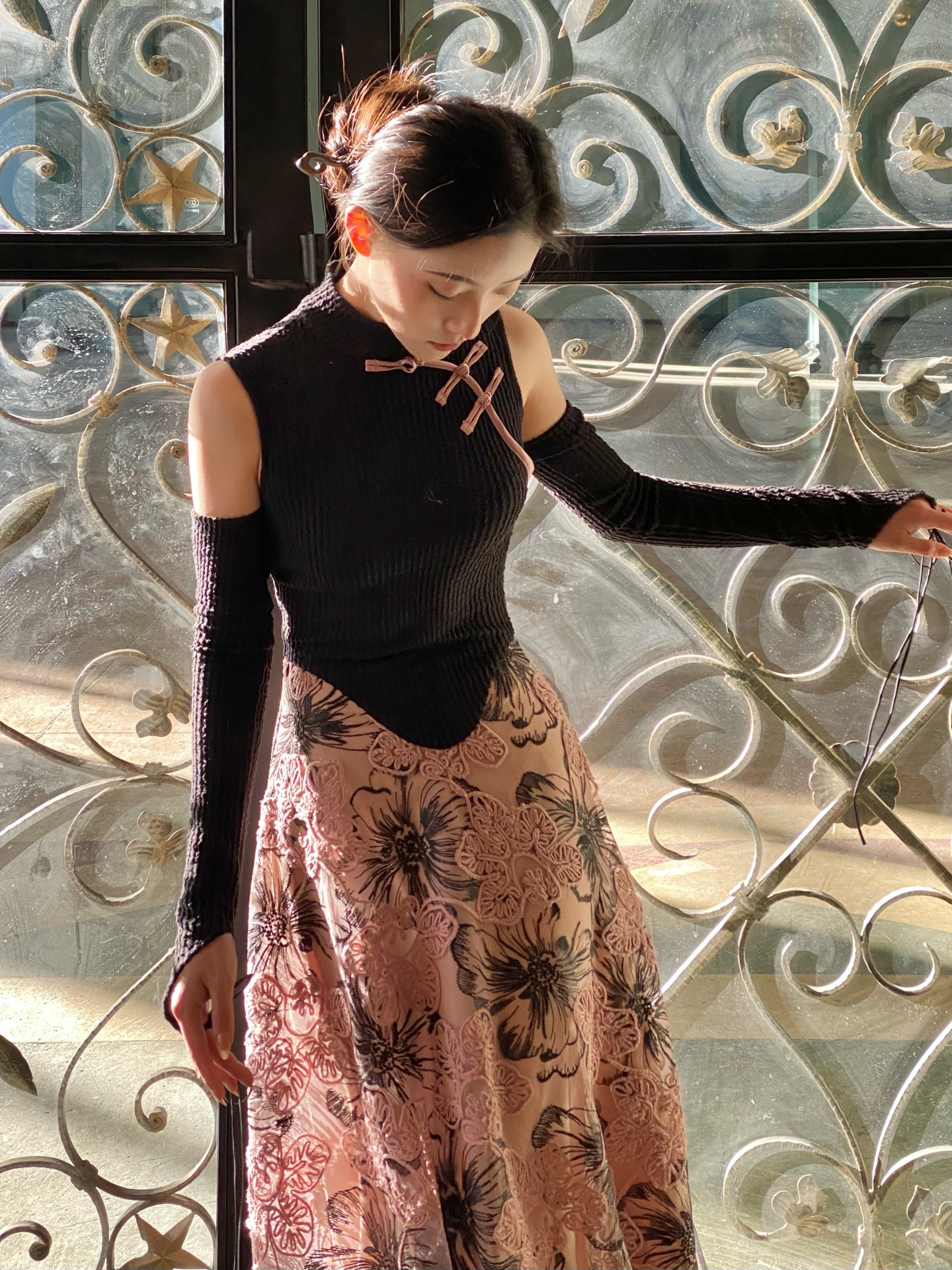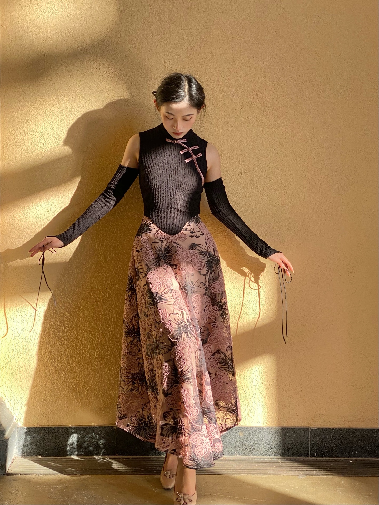 新中式改良旗袍裙,黑粉撞色,浪漫A字大摆