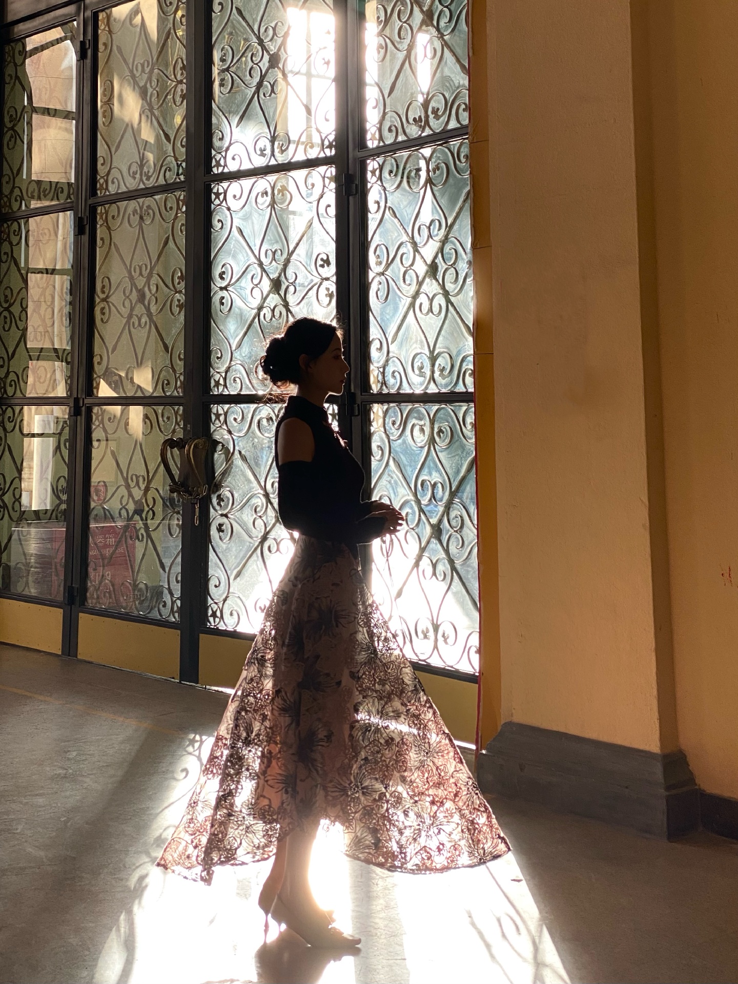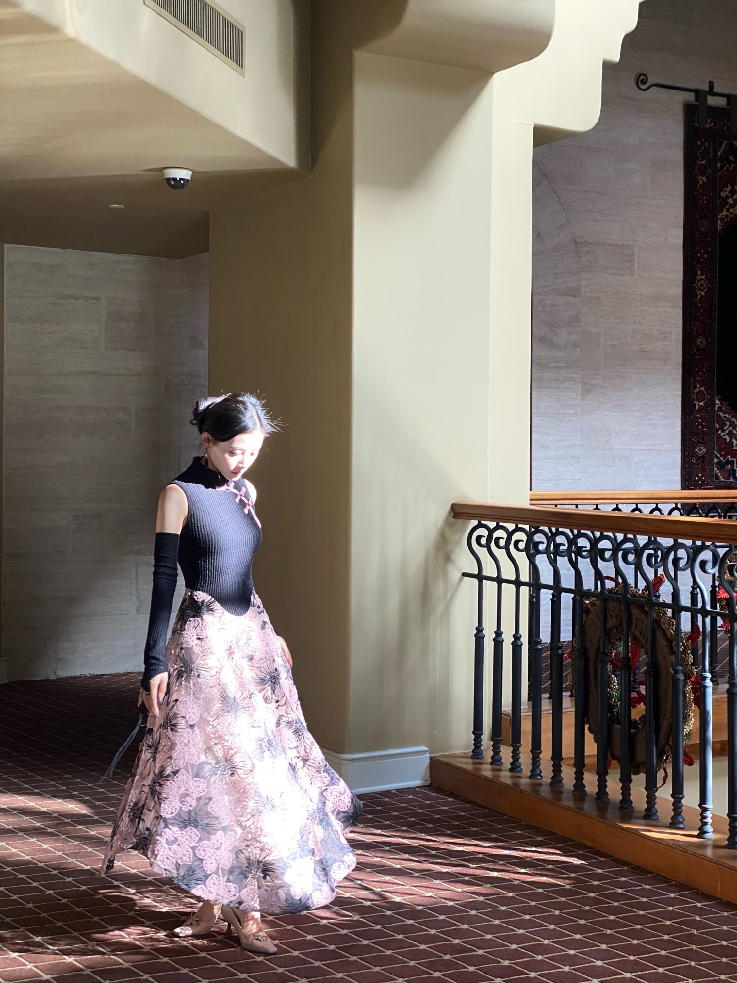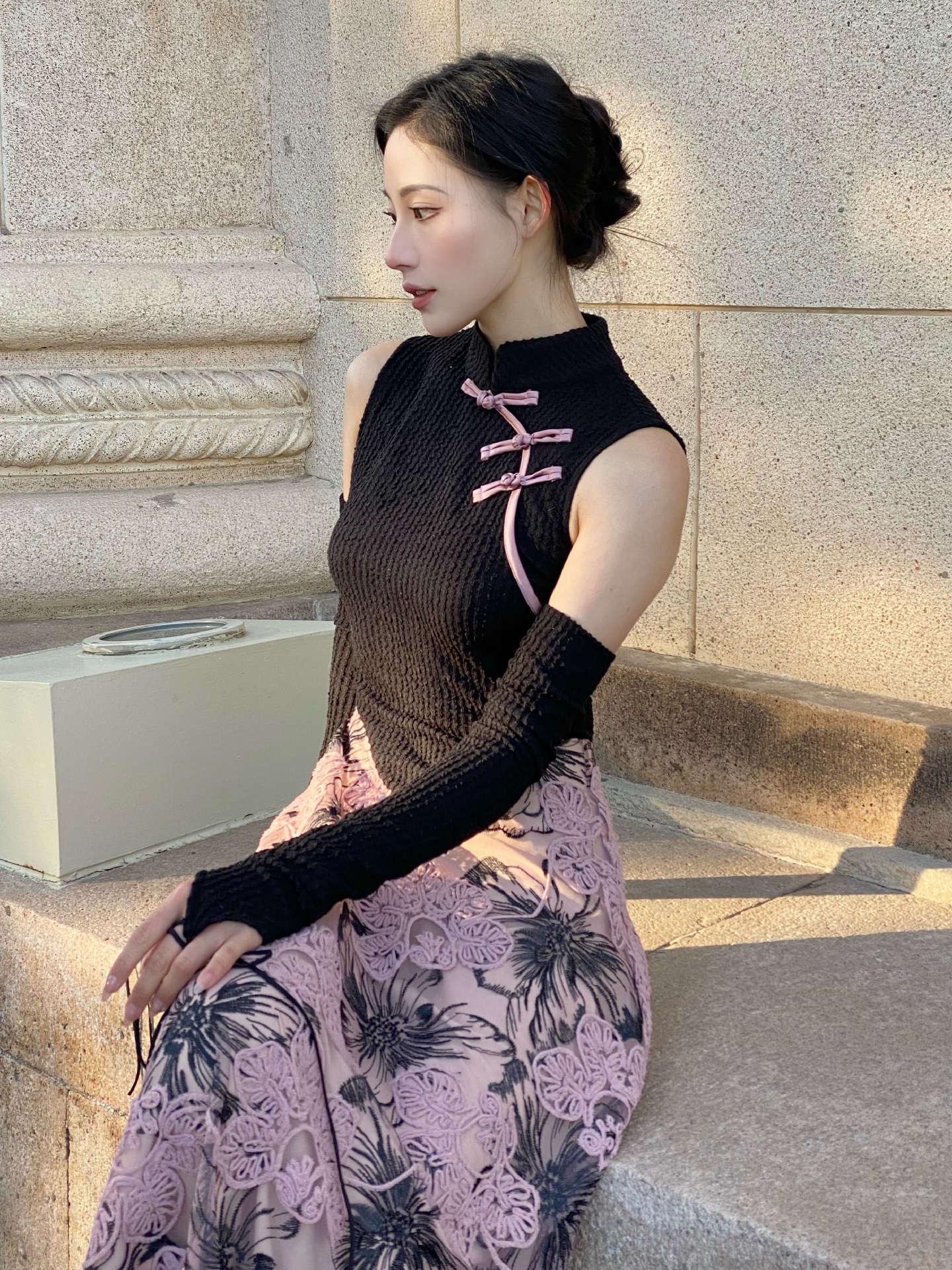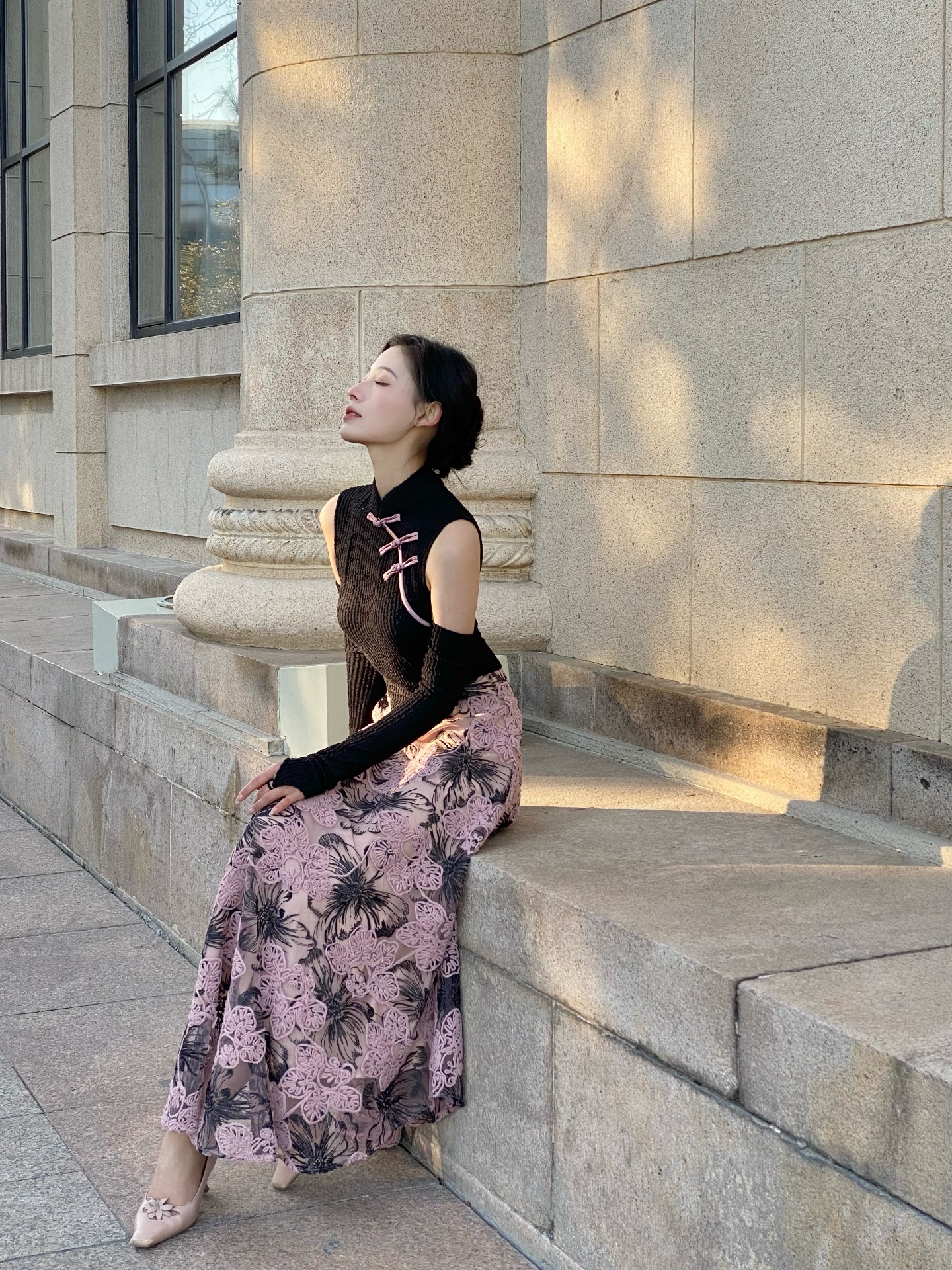 新中式改良旗袍裙,黑粉撞色,浪漫A字大摆