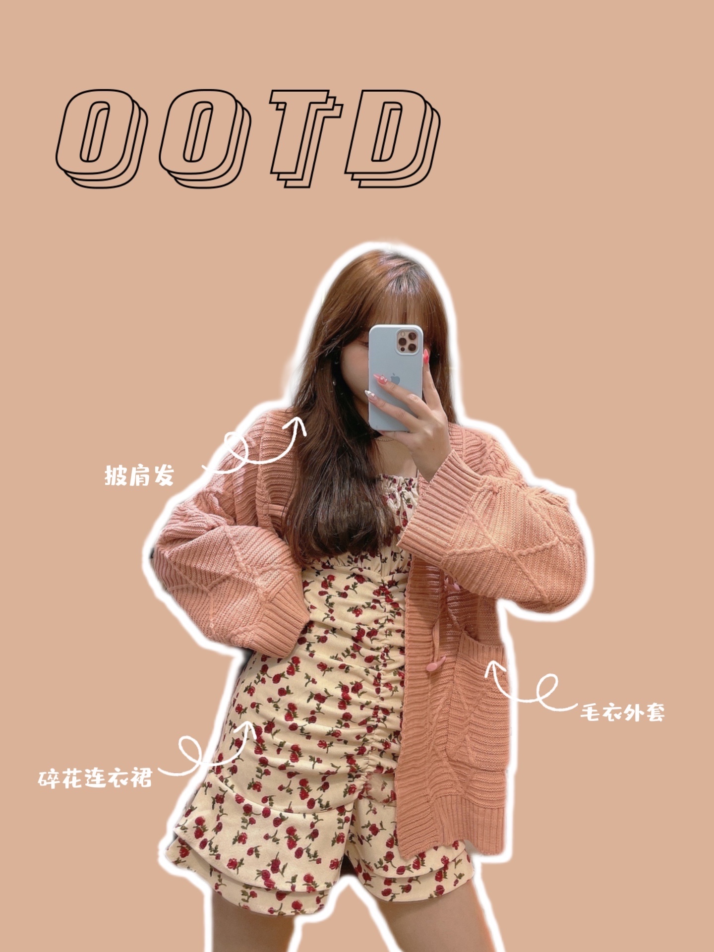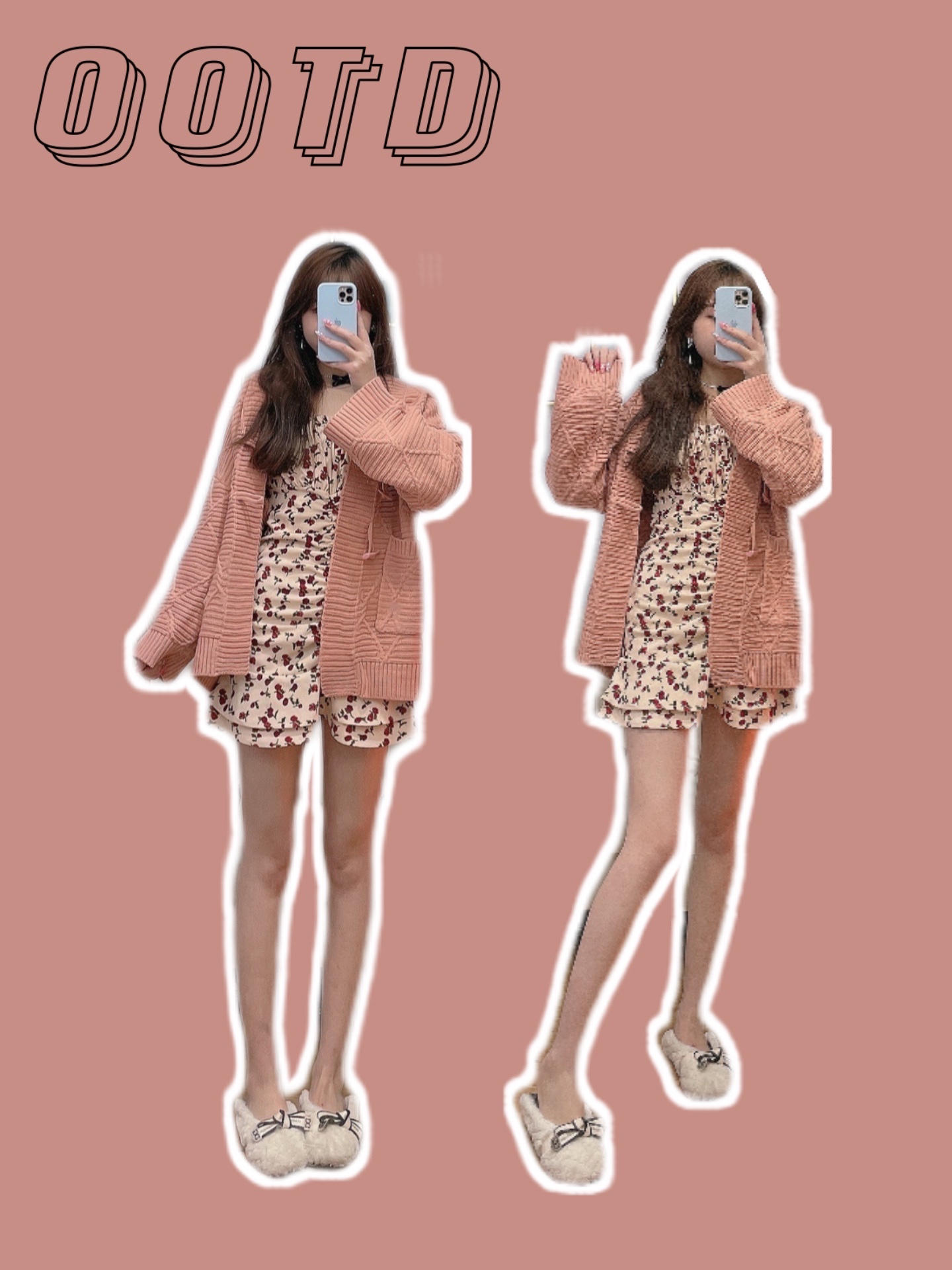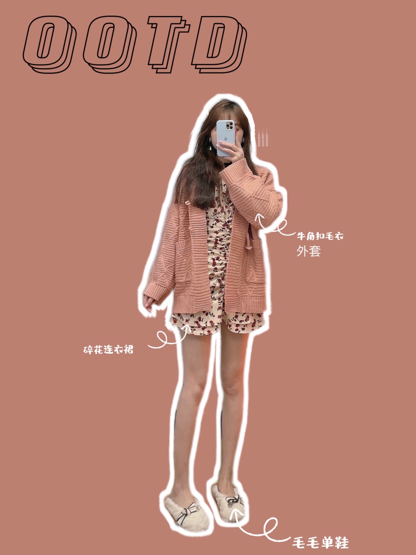 橘粉色毛衣外套➕碎花连衣裙➕毛毛单鞋