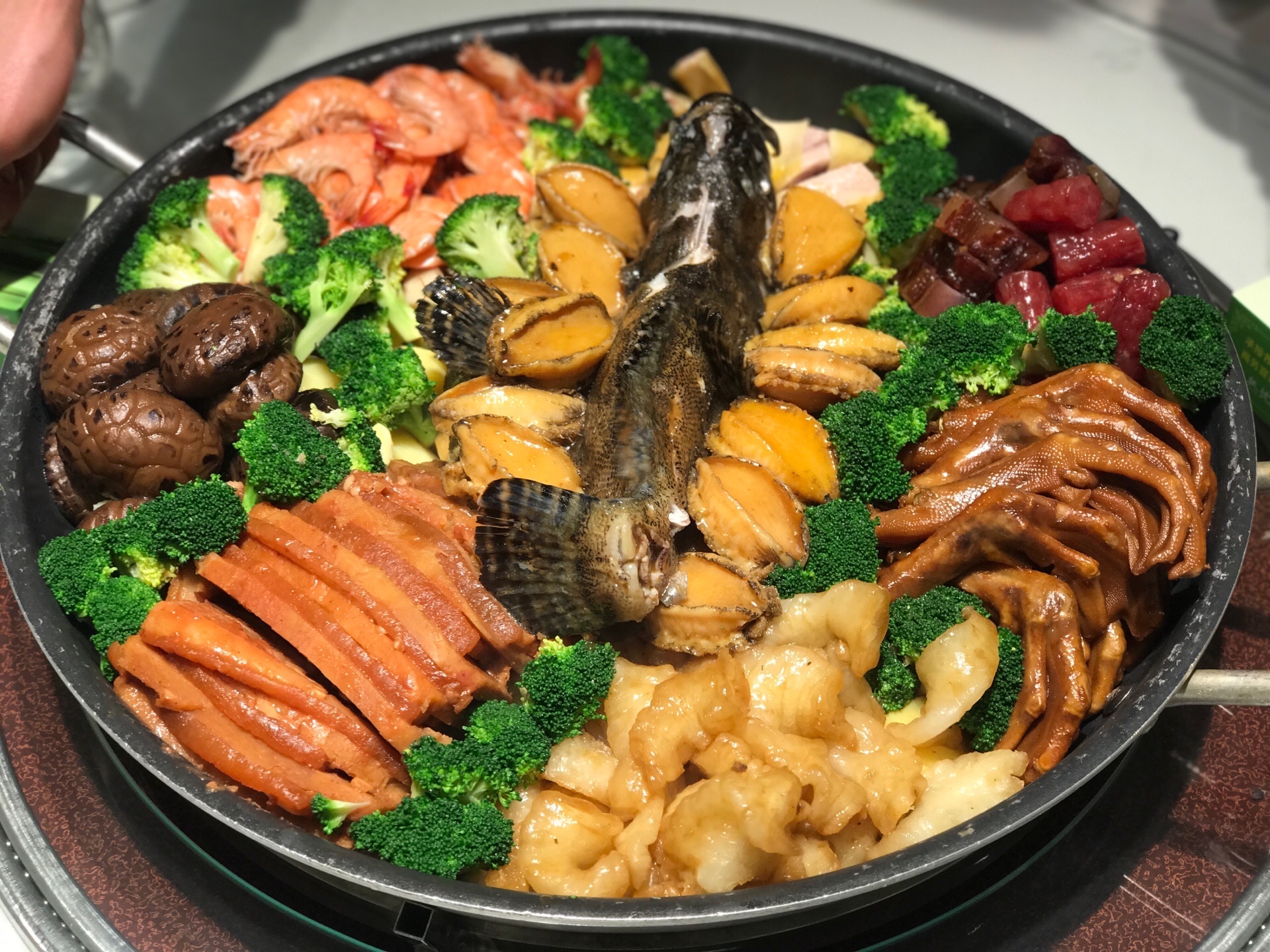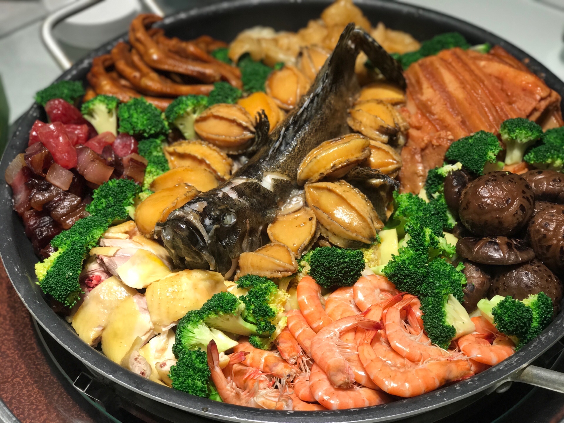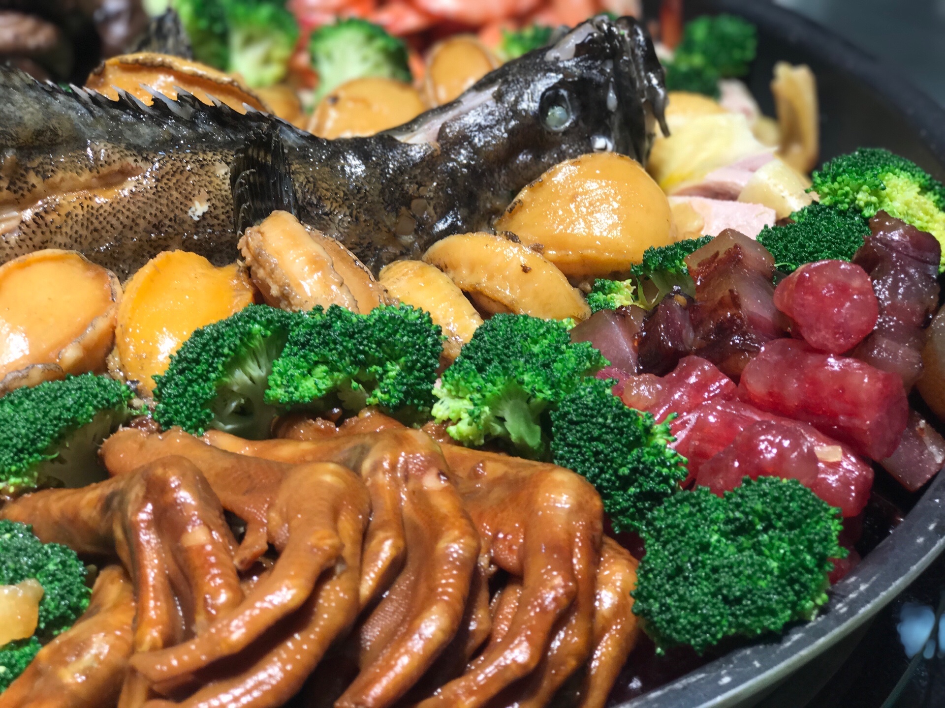 鲍鱼、石斑鱼、节虾、鱼胶、白切鸡、广东腊肉香肠、香芋扣肉、花菇、西兰花、杏鲍菇、鸭掌、辽参、洋芋等十几种材料分门别类的制作,再有序的按照食材的特性放置,每一种食材各自为阵却又鱼水交融。