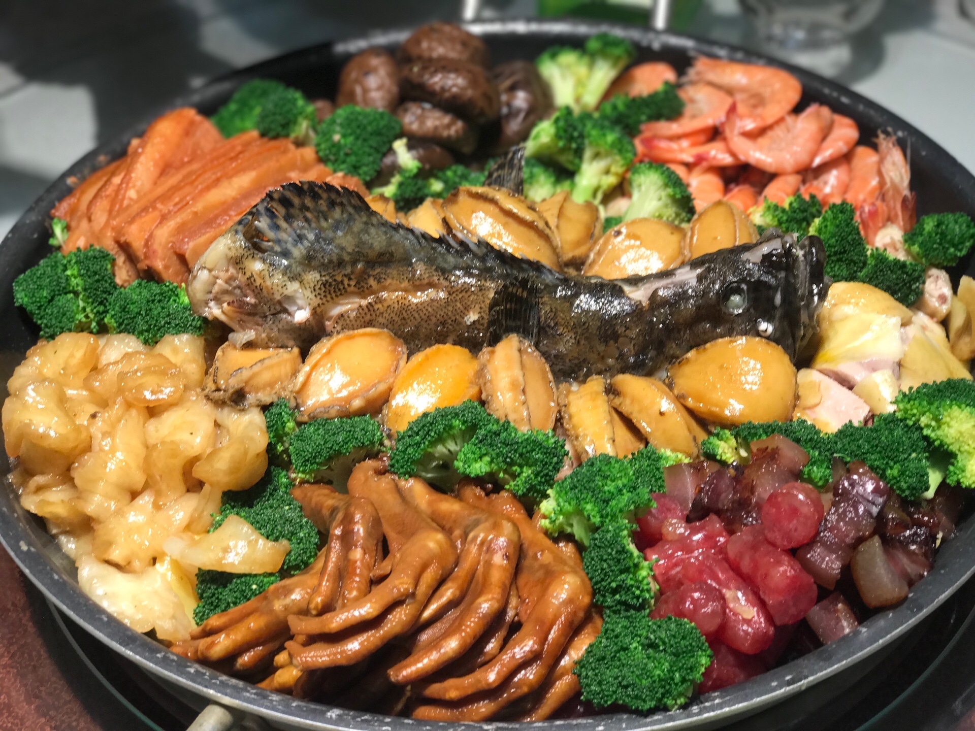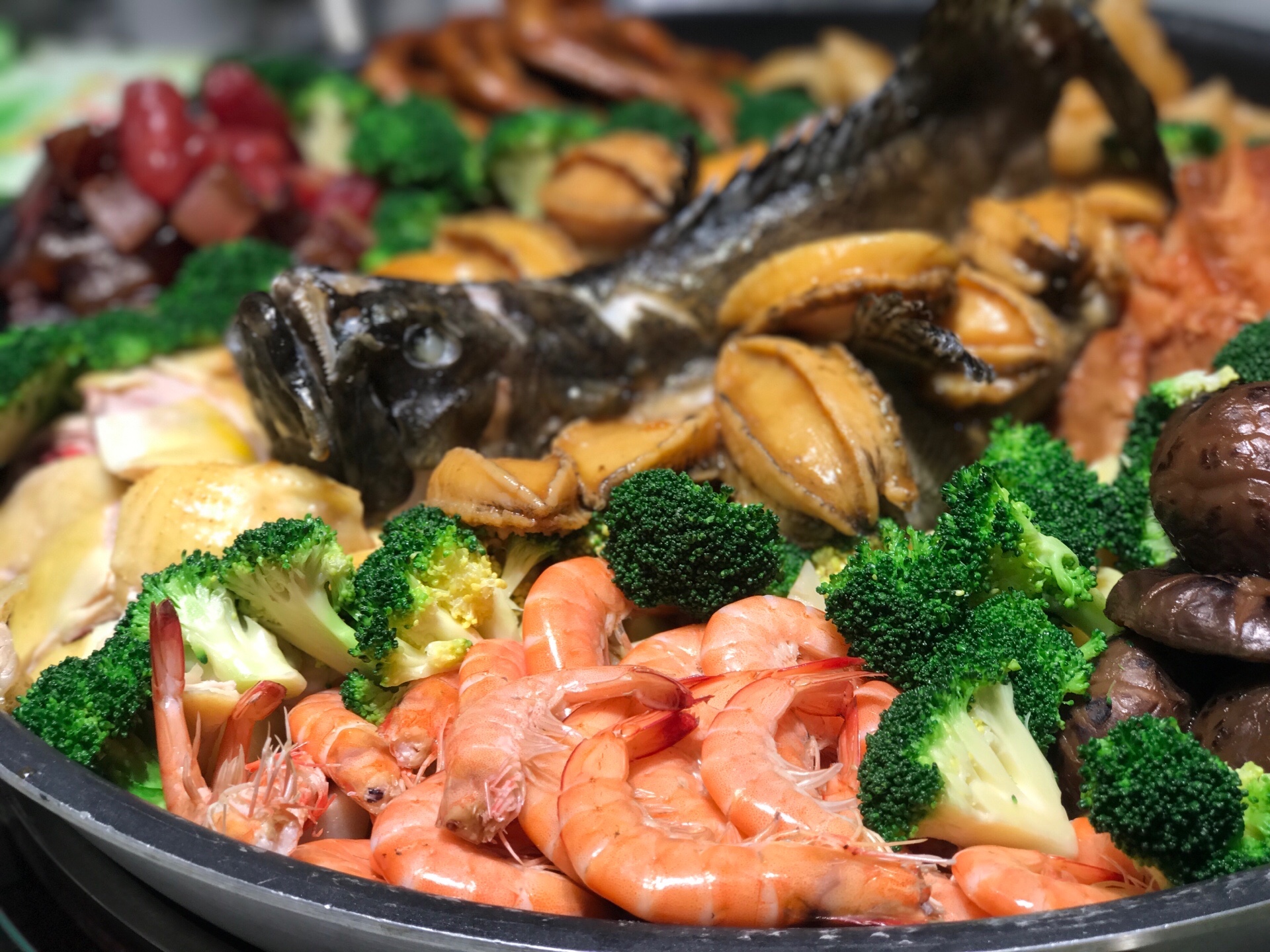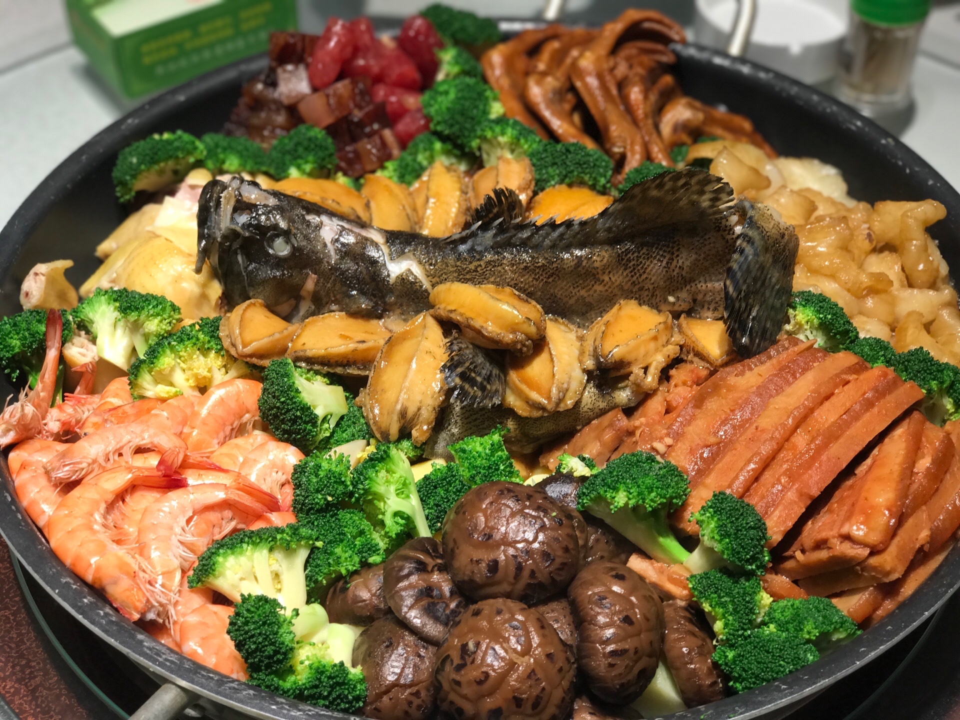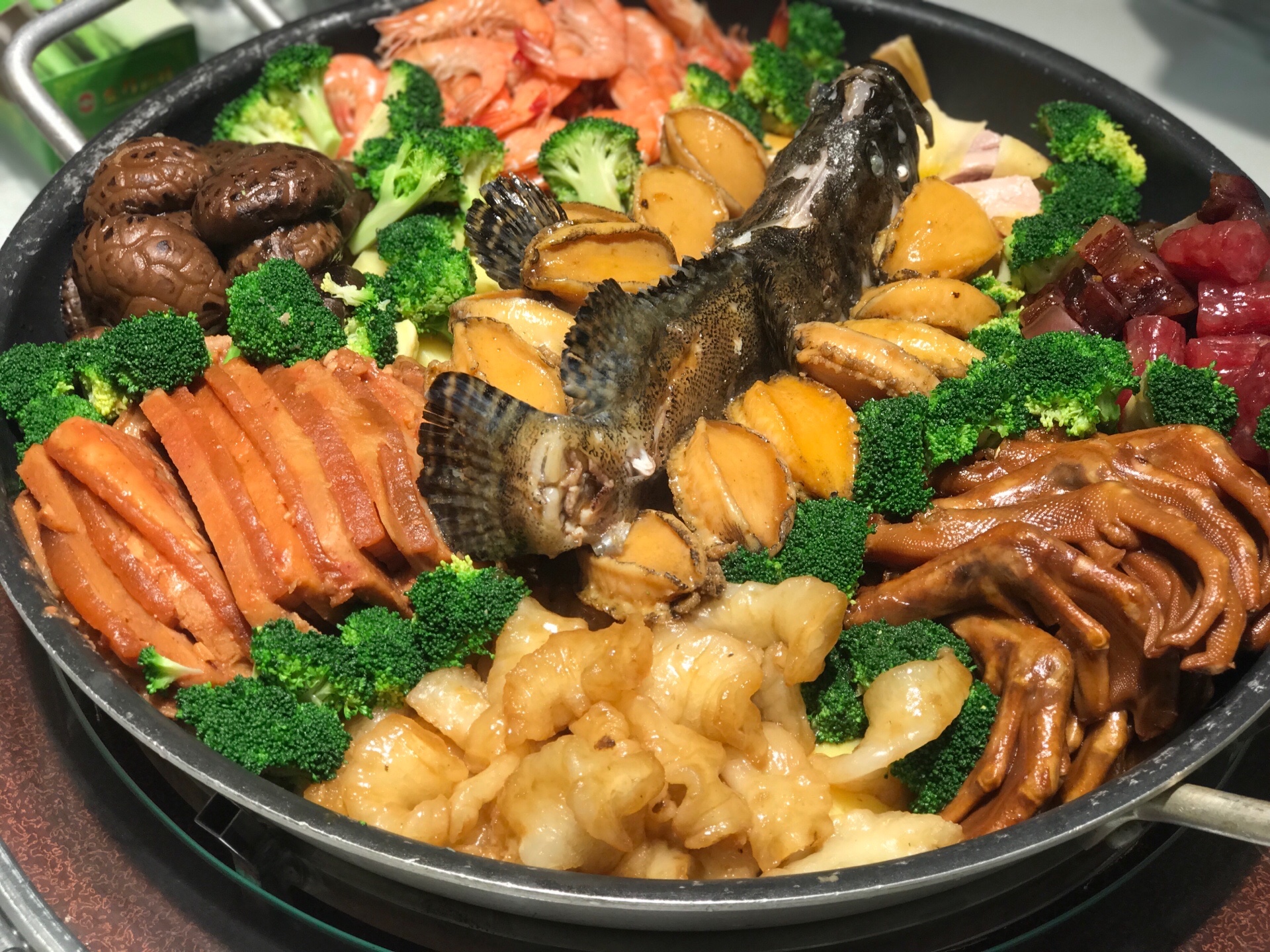鲍鱼、石斑鱼、节虾、鱼胶、白切鸡、广东腊肉香肠、香芋扣肉、花菇、西兰花、杏鲍菇、鸭掌、辽参、洋芋等十几种材料分门别类的制作,再有序的按照食材的特性放置,每一种食材各自为阵却又鱼水交融。