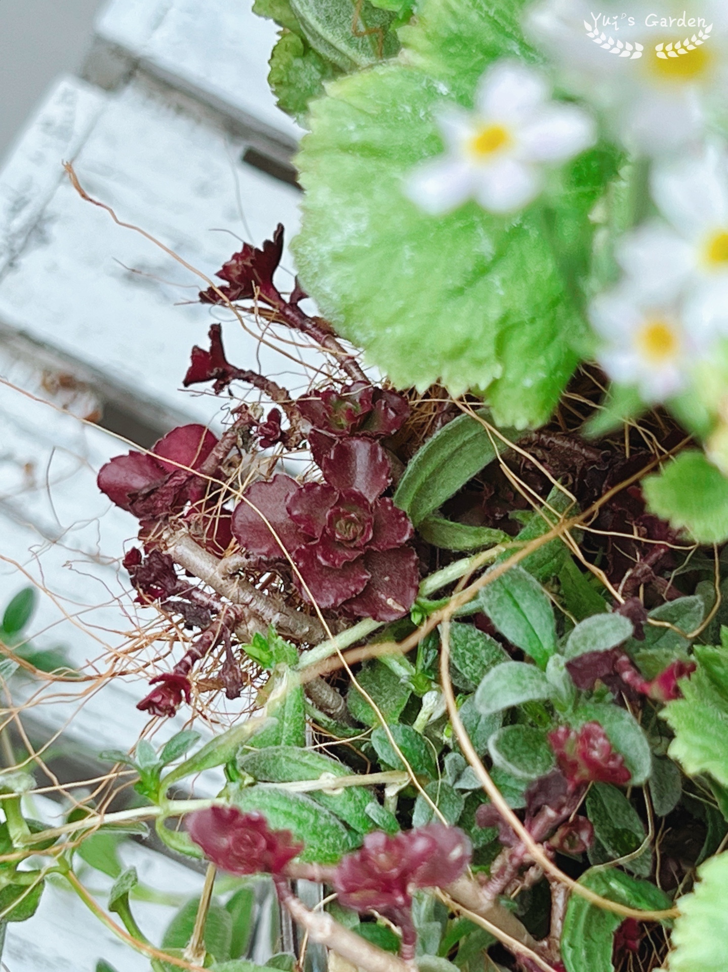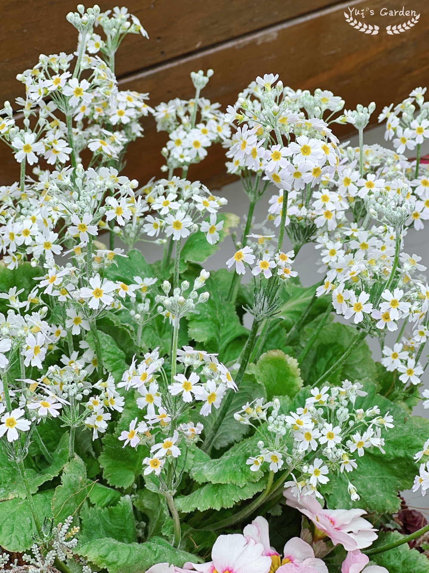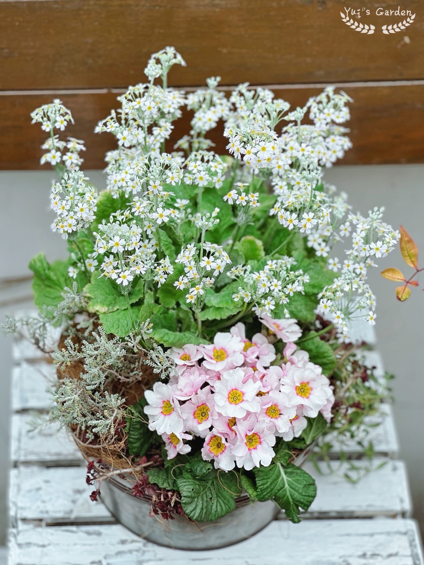 新做的组合盆栽,用了四季樱草,报春,绵衫菊,夏雪草和小球玫瑰。