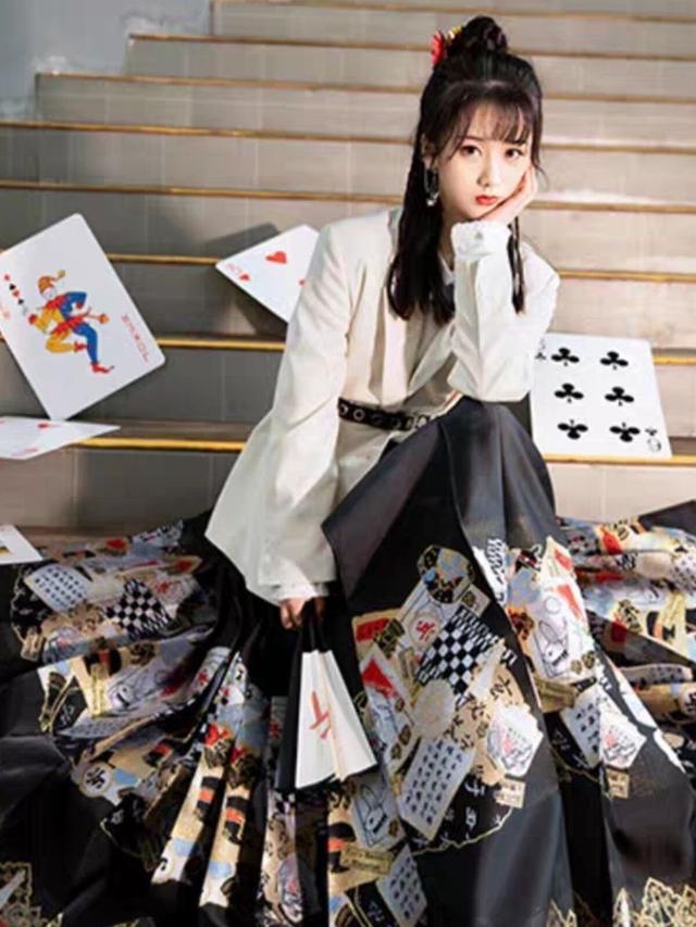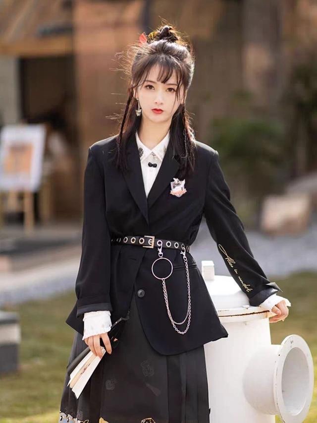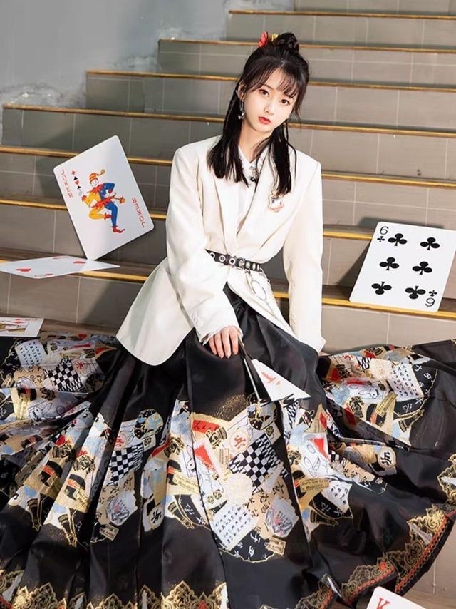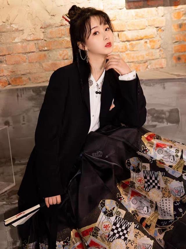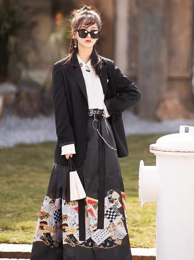 如果大家想要把“西装+汉服”的混搭穿出减龄洋气感,那么需要掌握的第一个技巧就是搭配印花衬衫。印花衬衫和西装搭配在一起,既可以中和西装服饰本身的单一感,同时也可以避免整身穿搭显得太过无趣。印花的点缀可以让穿搭更为俏皮,减龄效果也会更为明显。