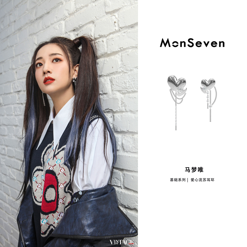 #沉睡花园 珊珊来了!演员马梦唯 佩戴MonSeven<基础>系列 爱心流苏耳环 拍摄大片,身着学院风针织衫搭个性皮衣和短裙,佩戴个性的金属色流苏耳环,搭配双马尾辫造型,又甜又酷!