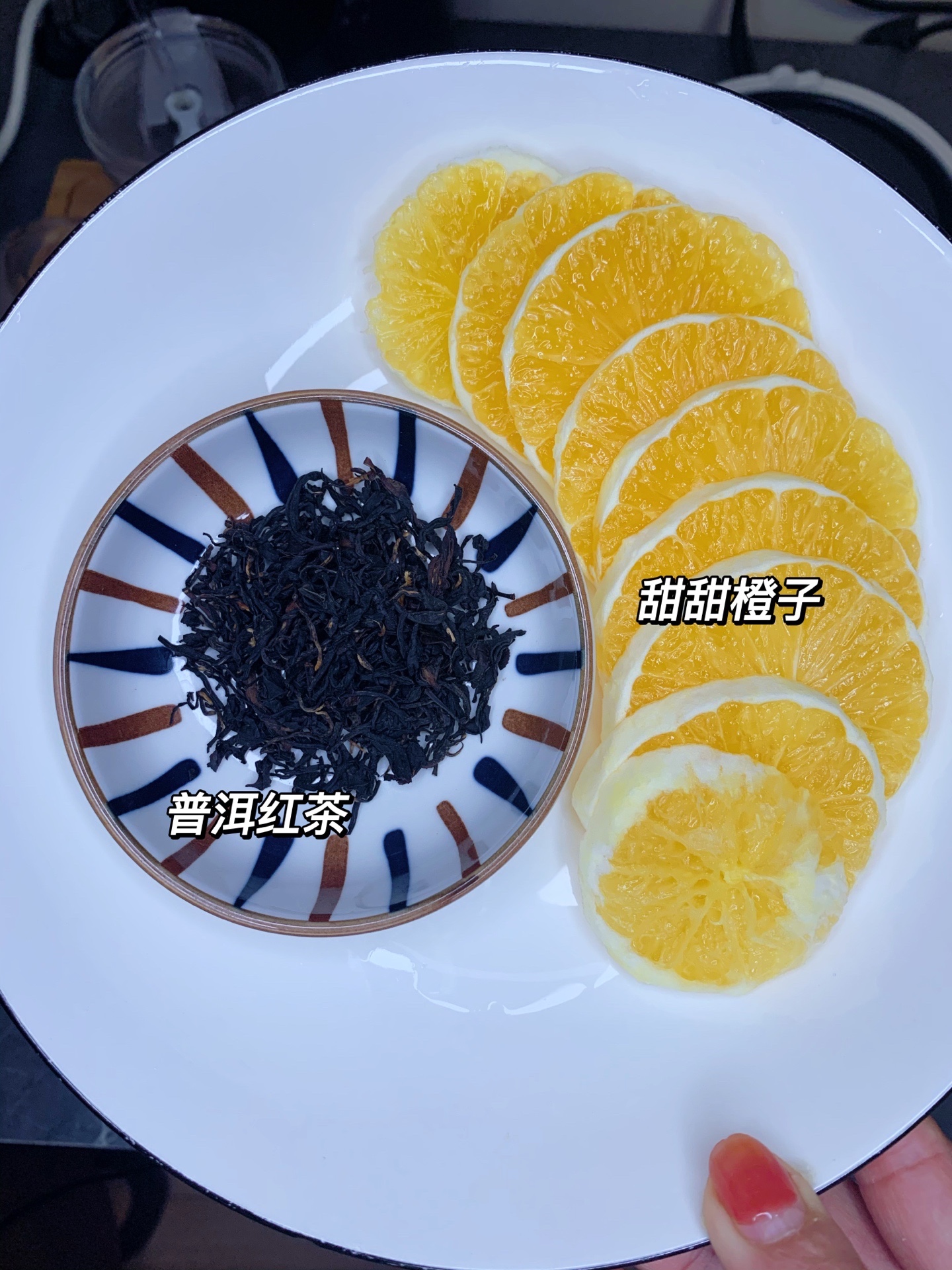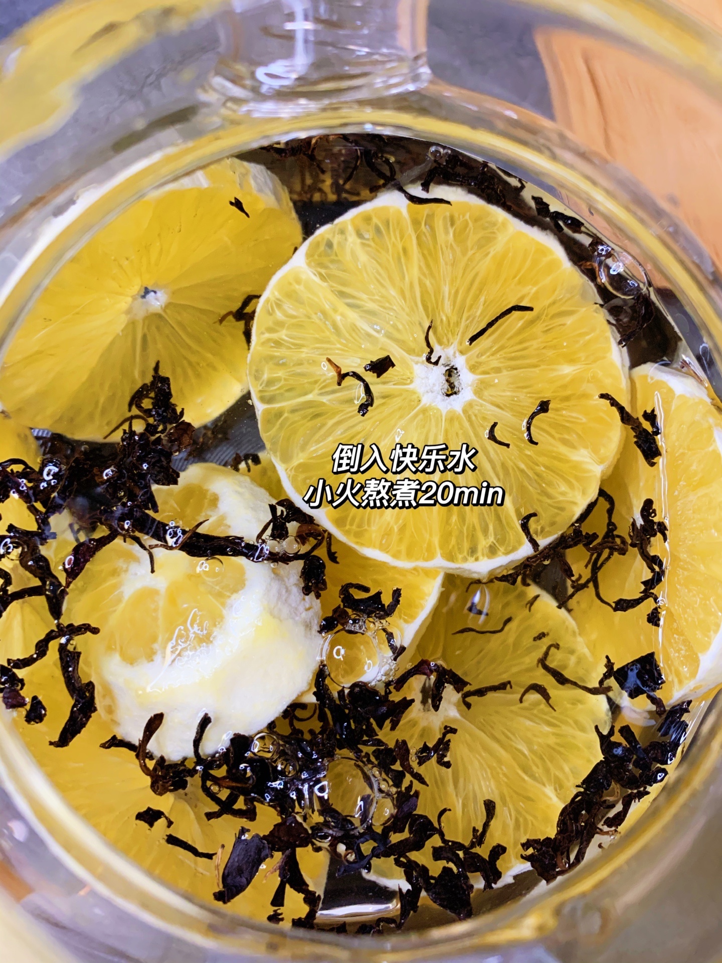一个香橙切片和适量普洱红茶,在一起熬煮20分钟