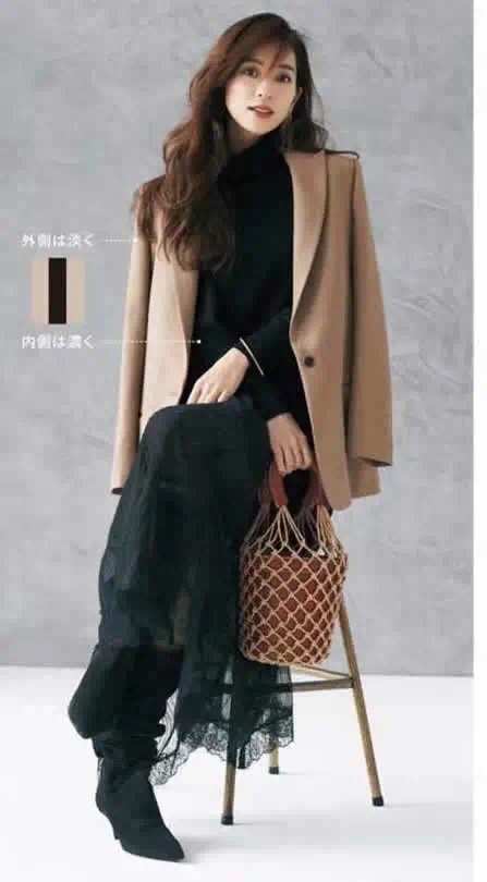 要点:全身驼黑配,对肤色不利,学会用妆容和发型制造精致亮点,驼与黑的大气才会稳重发挥,切忌素颜与邋遢。