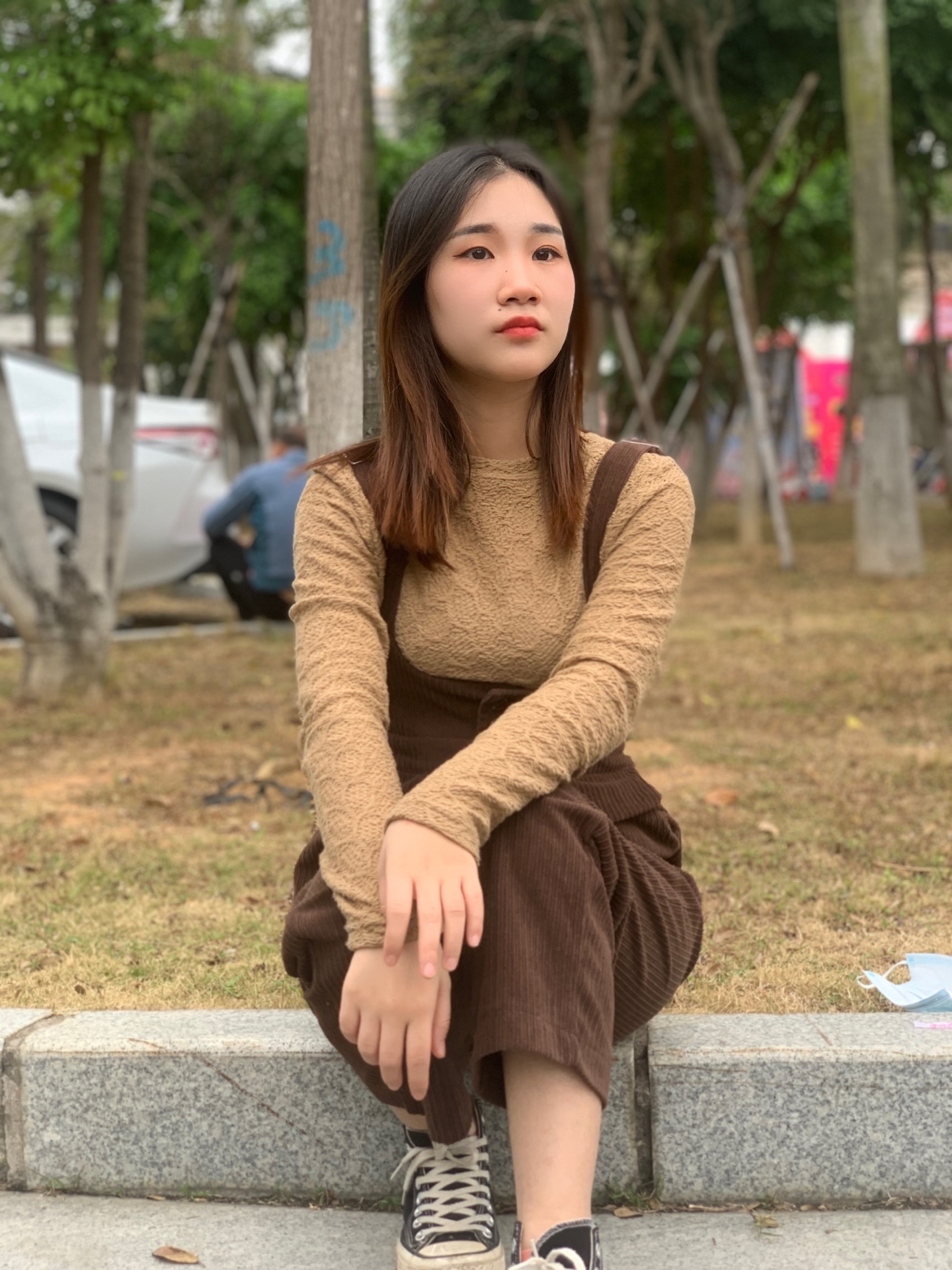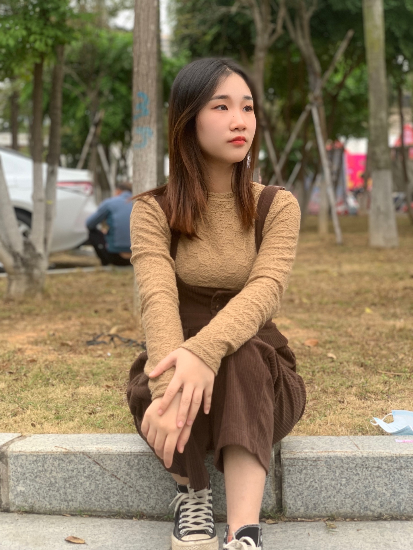 2.搭配的是一件纯棕色吊带连衣裤很有设计感!!