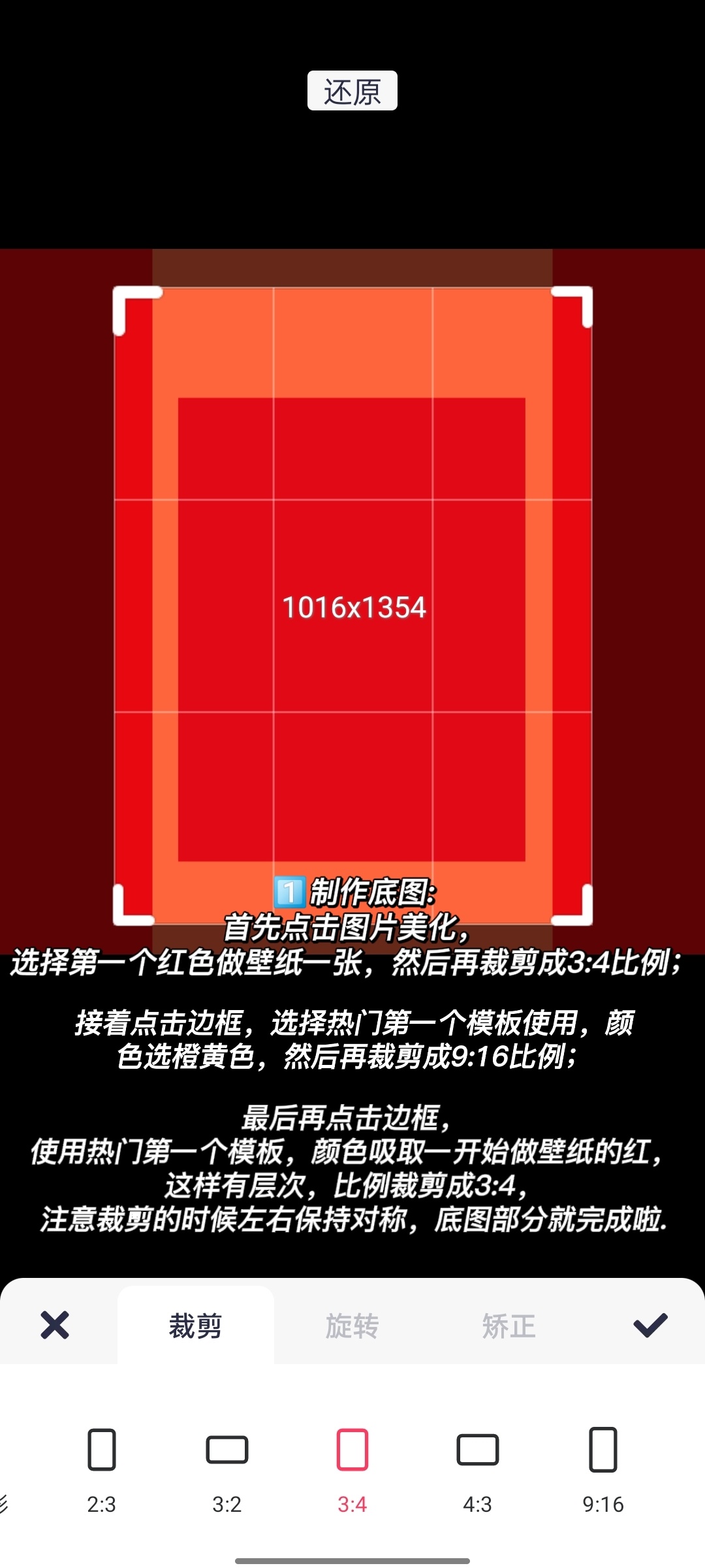 最后再点击边框,使用热门第一个模板,颜色吸取一开始做壁纸的红,这样有层次,比例裁剪成3:4,注意裁剪的时候左右保持对称,底图部分就完成啦.