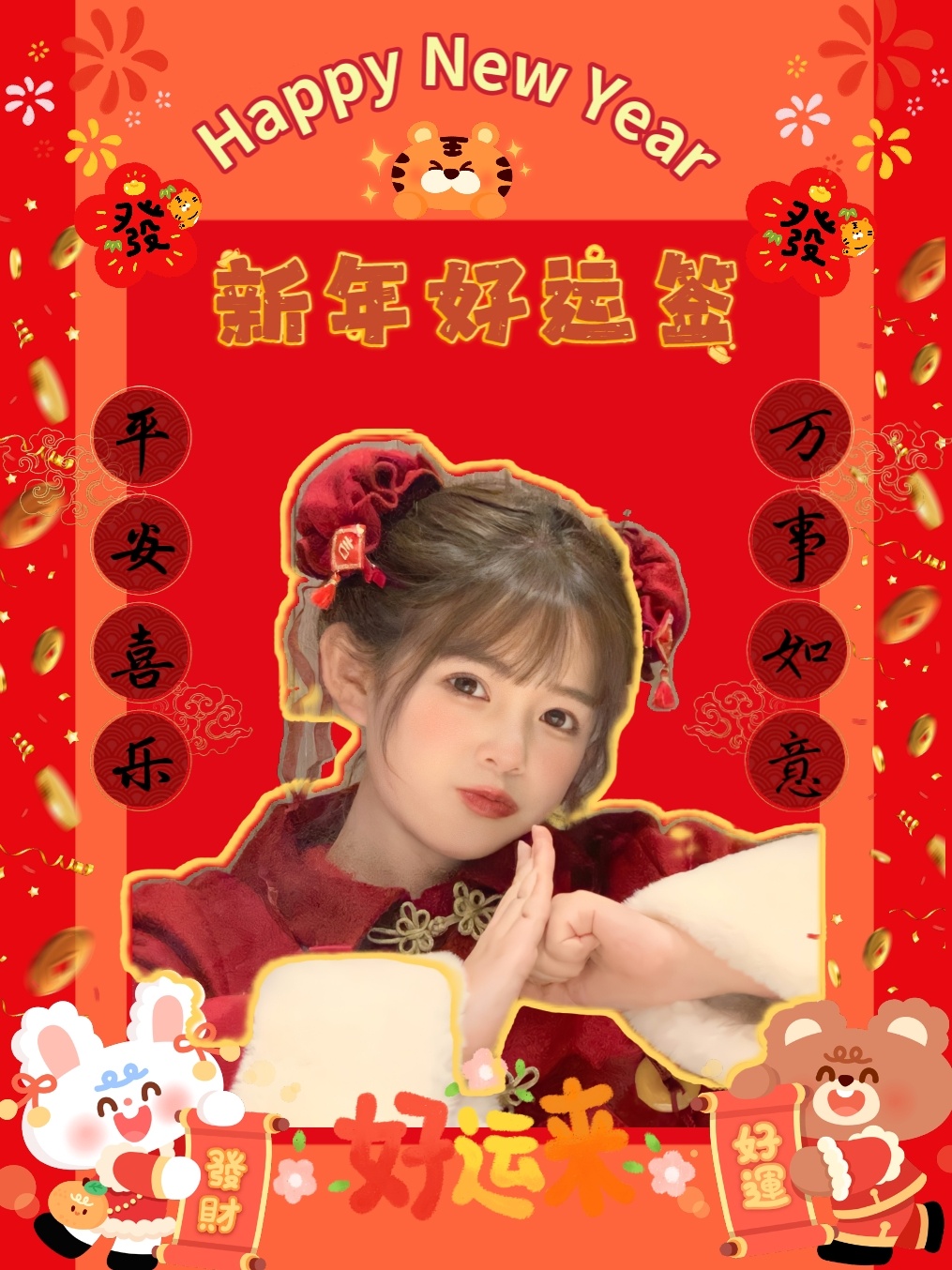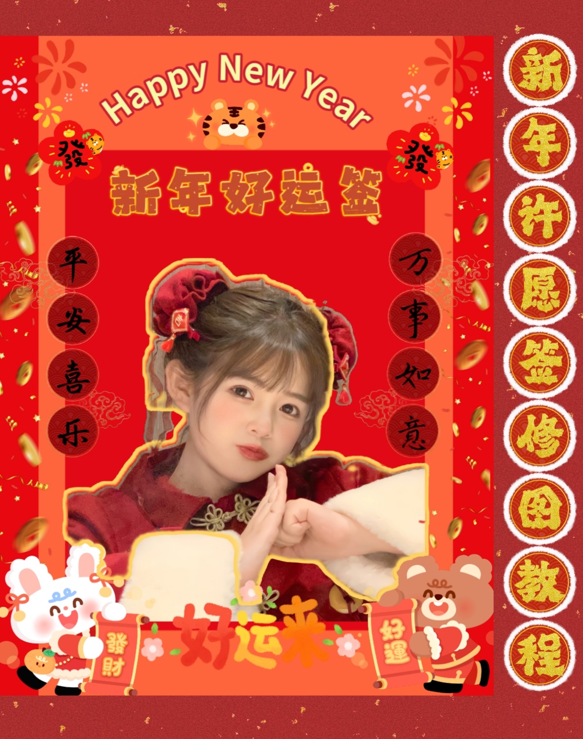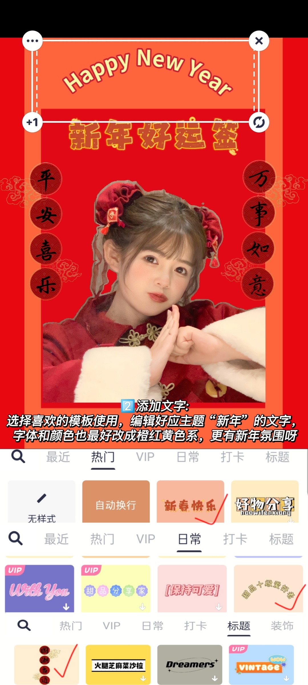 选择喜欢的模板使用,编辑好应主题“新年”的文字,字体和颜色也最好改成橙红黄色系,更有新年氛围.