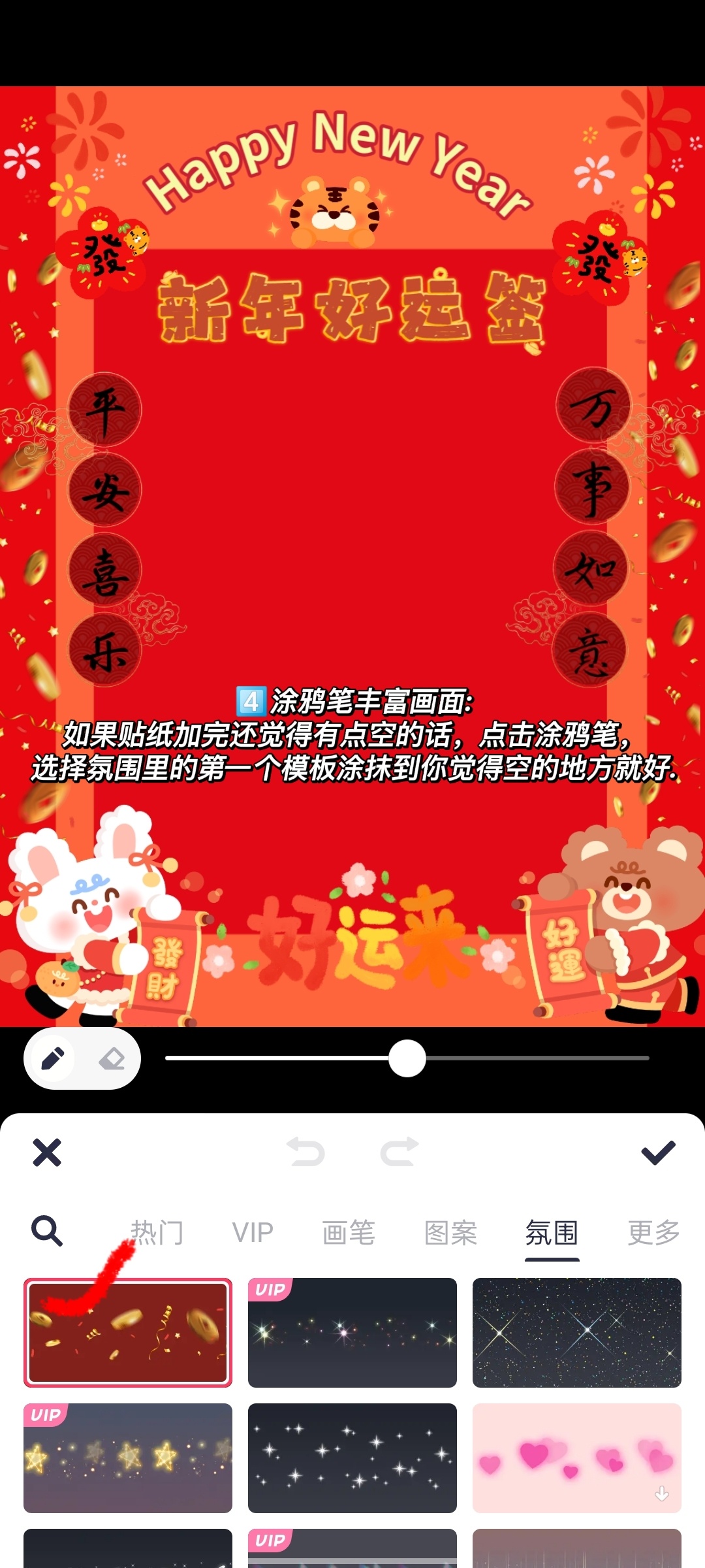 如果贴纸加完还觉得有点空的话,点击涂鸦笔,选择氛围里的第一个模板涂抹到你觉得空的地方就好.