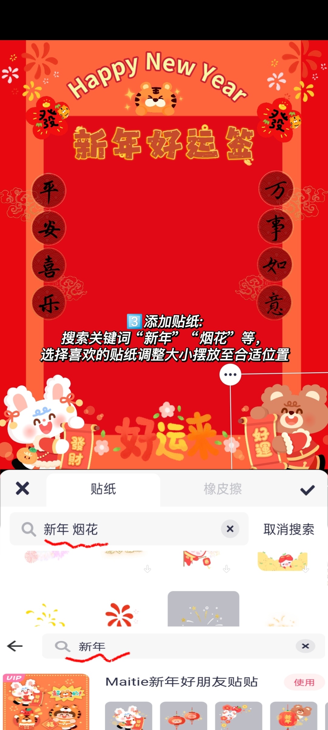 搜索关键词“新年”“烟花”等,选择喜欢的贴纸调整大小摆放至合适位置.