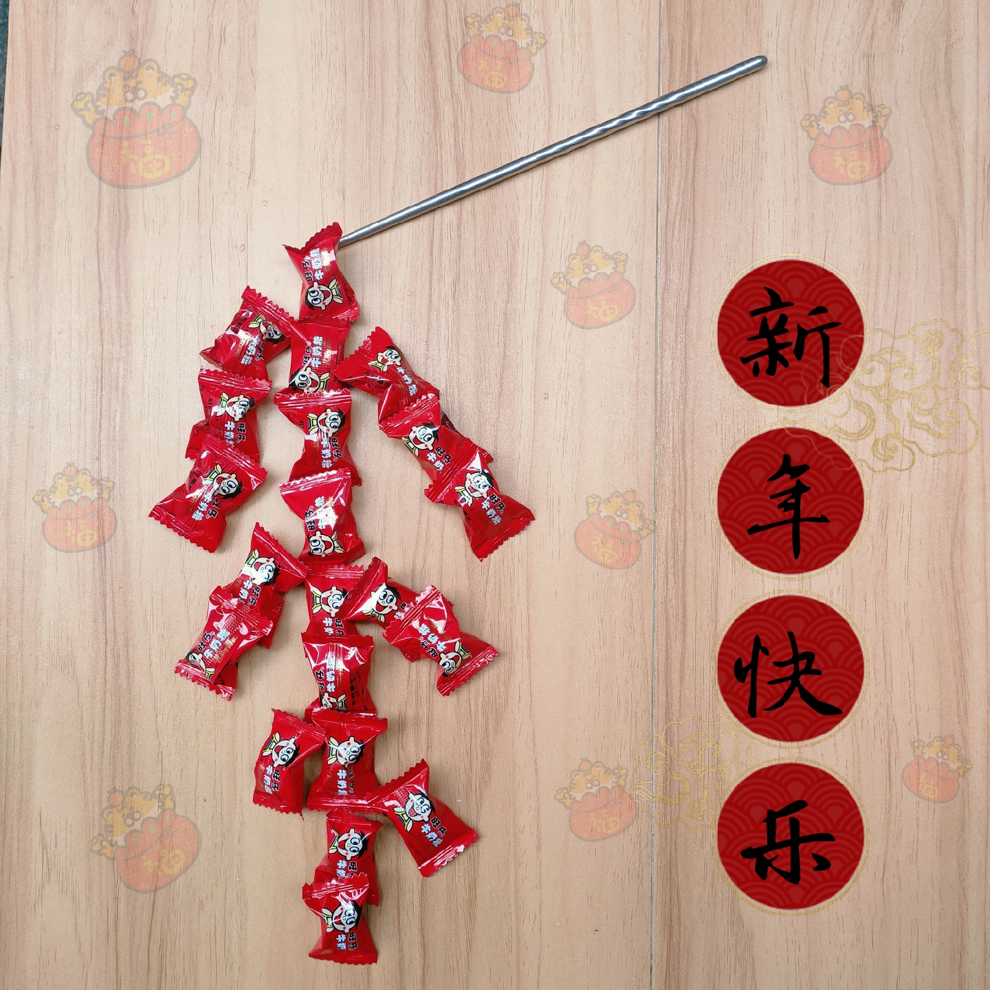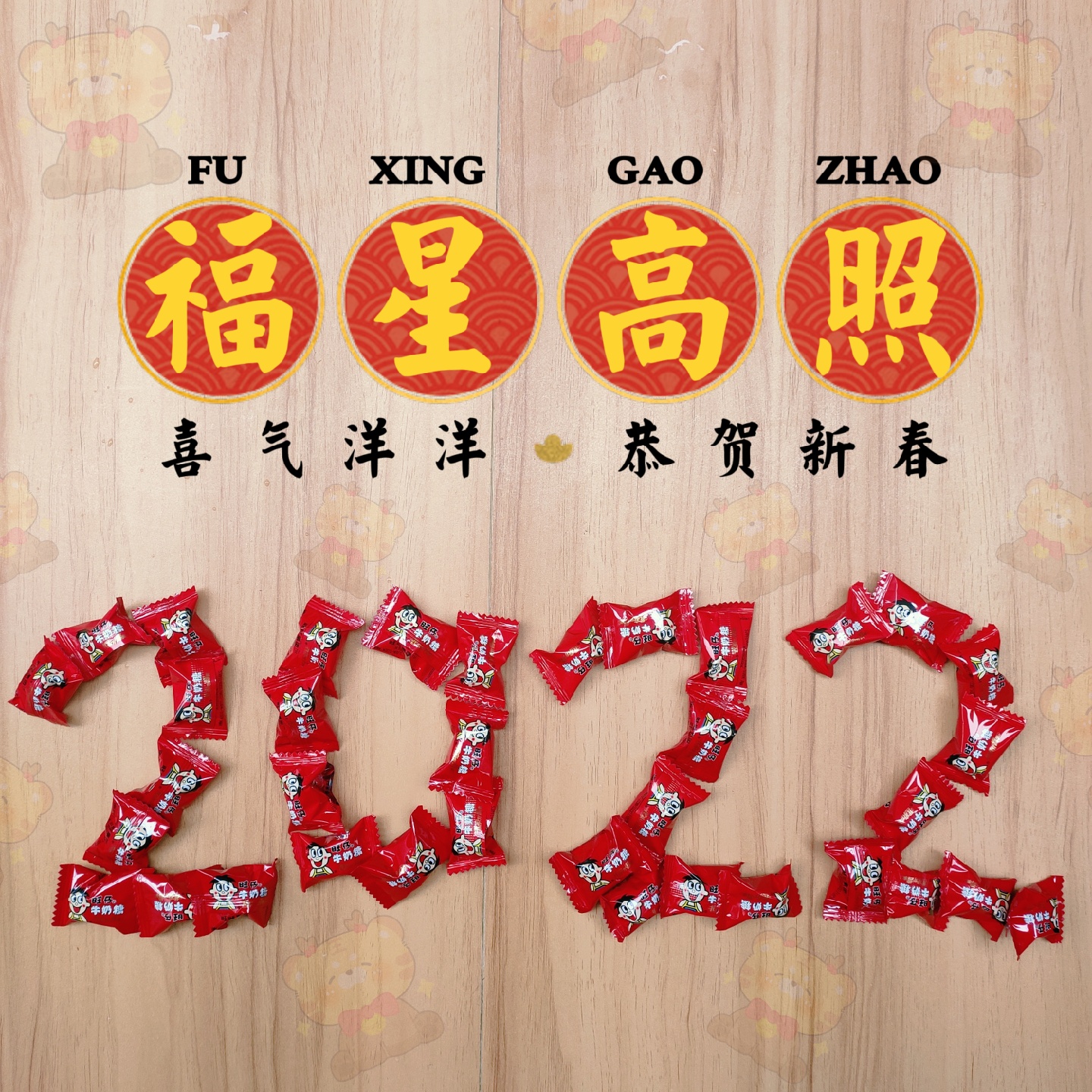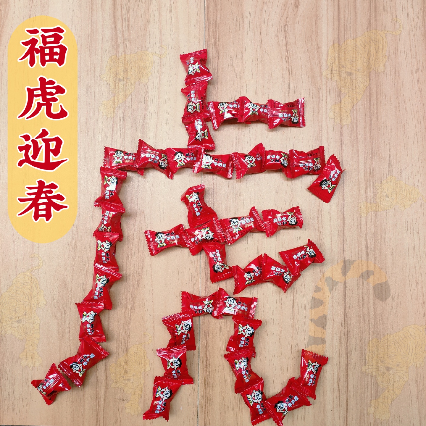 用旺仔牛奶糖,摆放出鞭炮和各种式样。拍好照片后使用美图秀秀修图。
