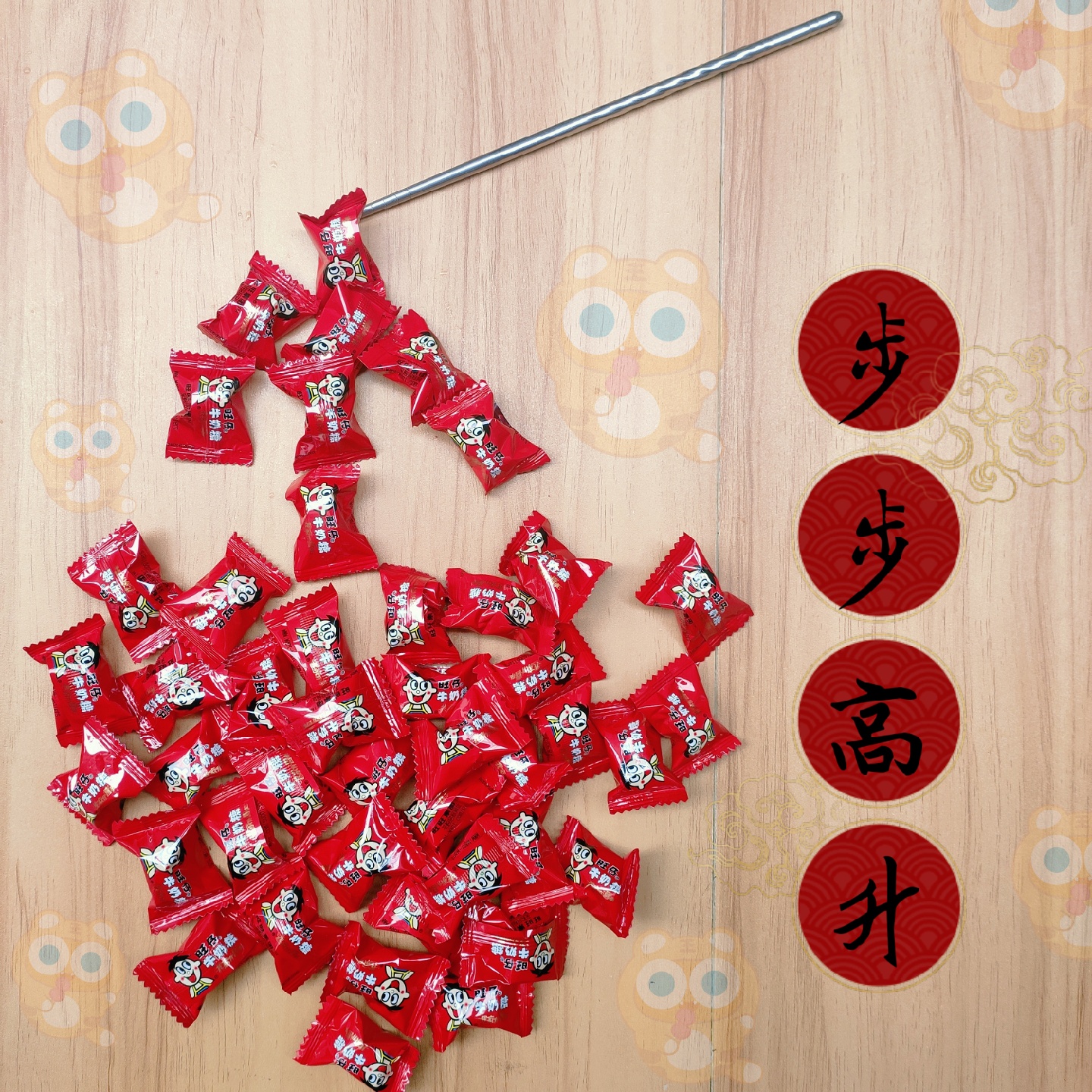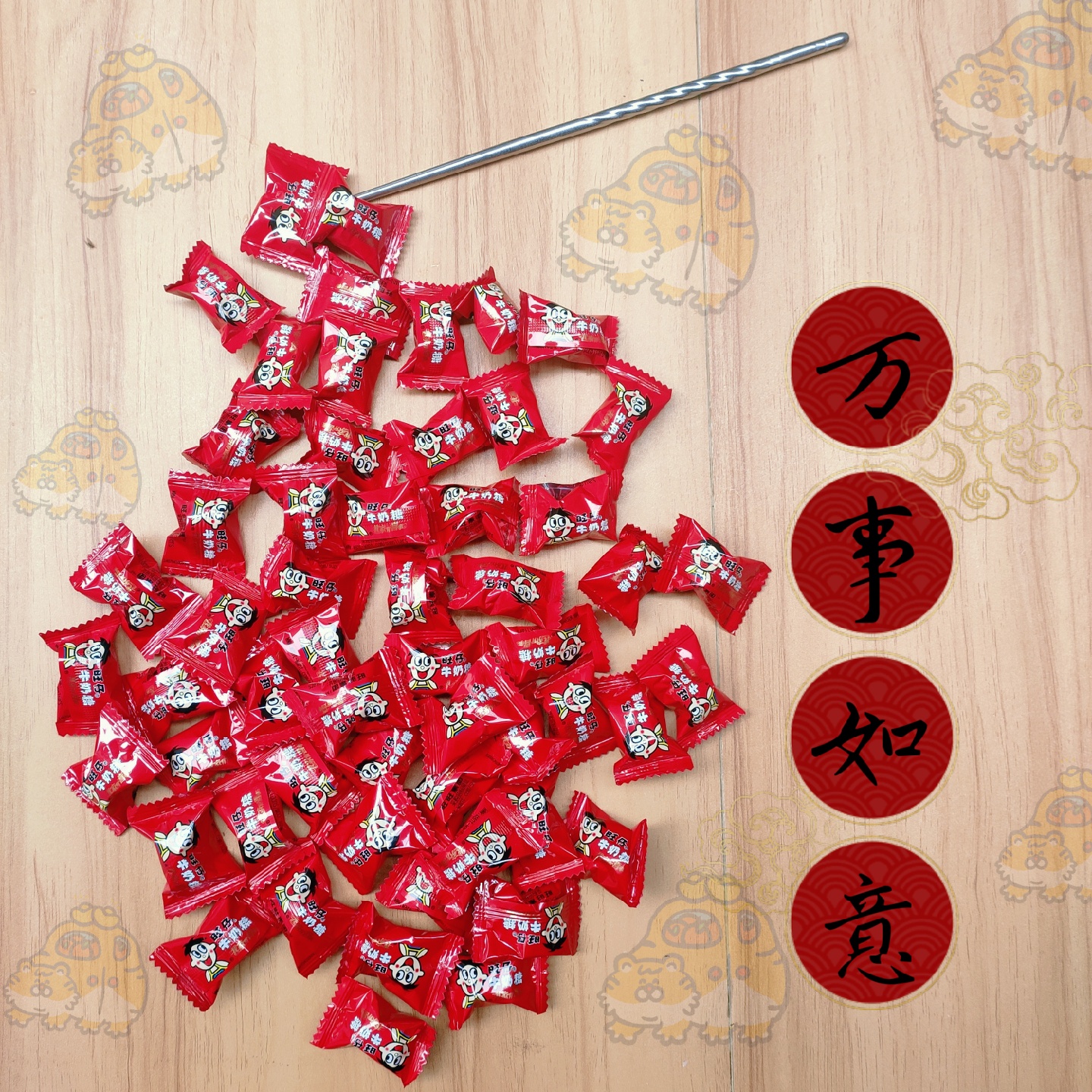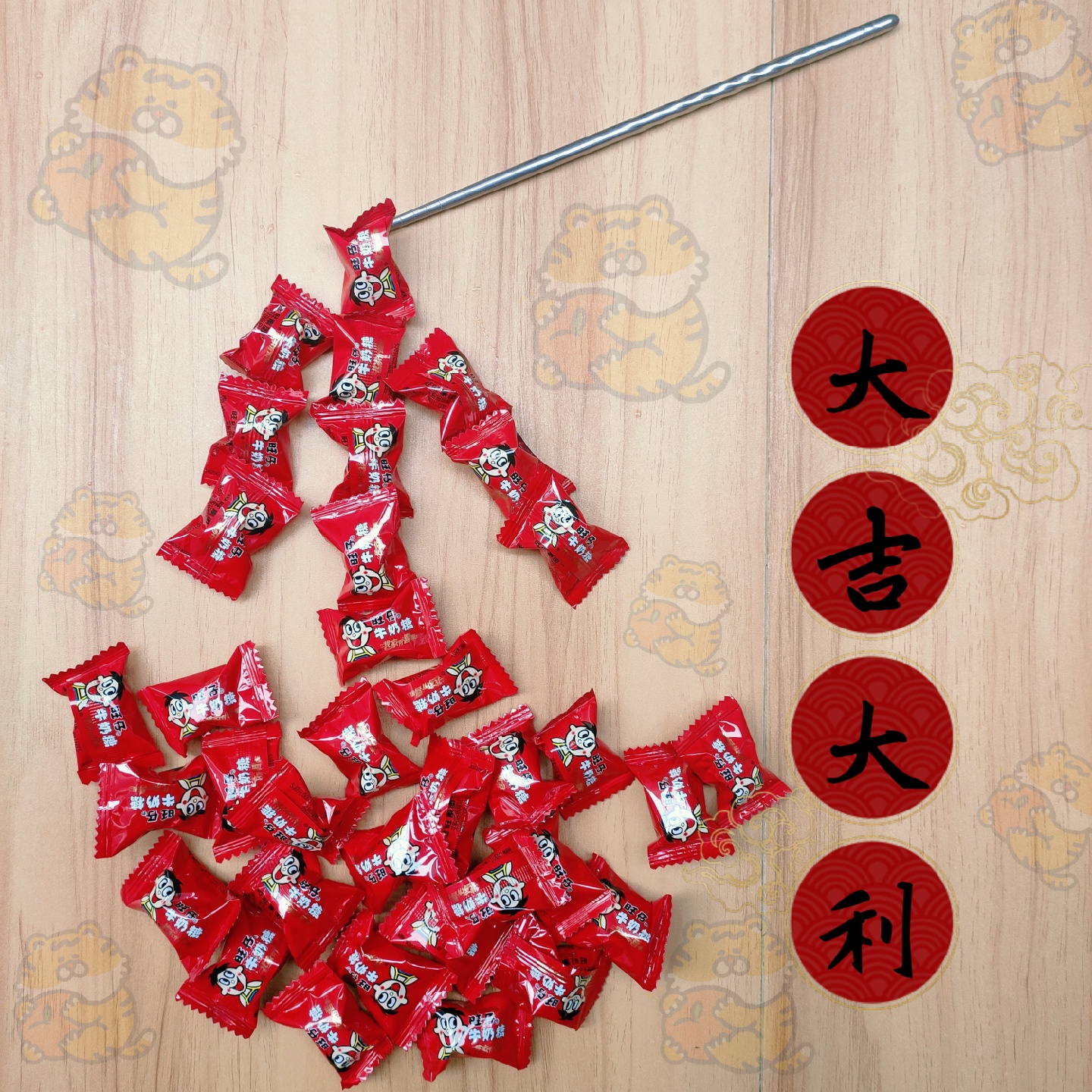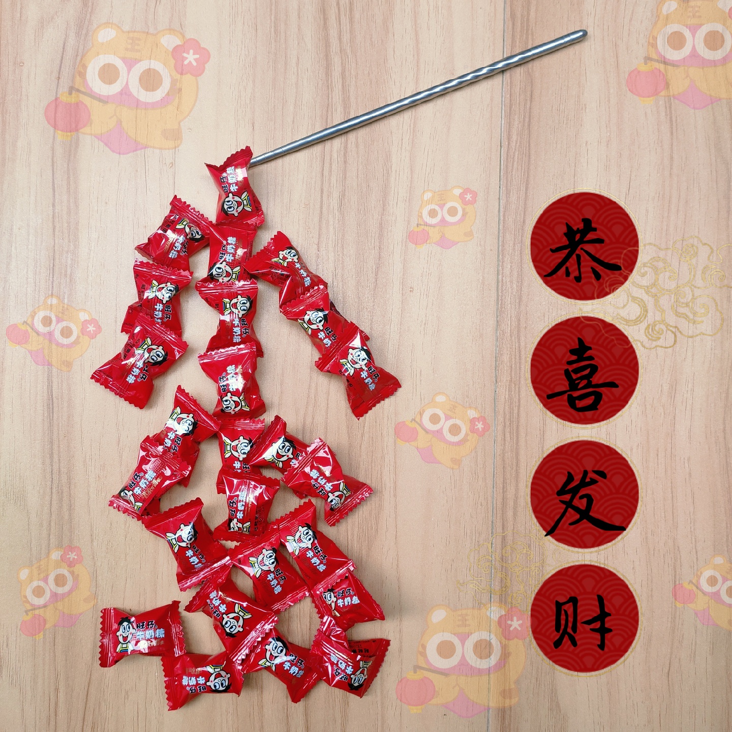 用旺仔牛奶糖,摆放出鞭炮和各种式样。拍好照片后使用美图秀秀修图。