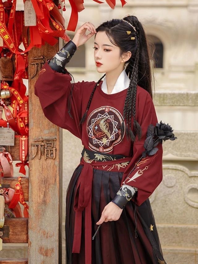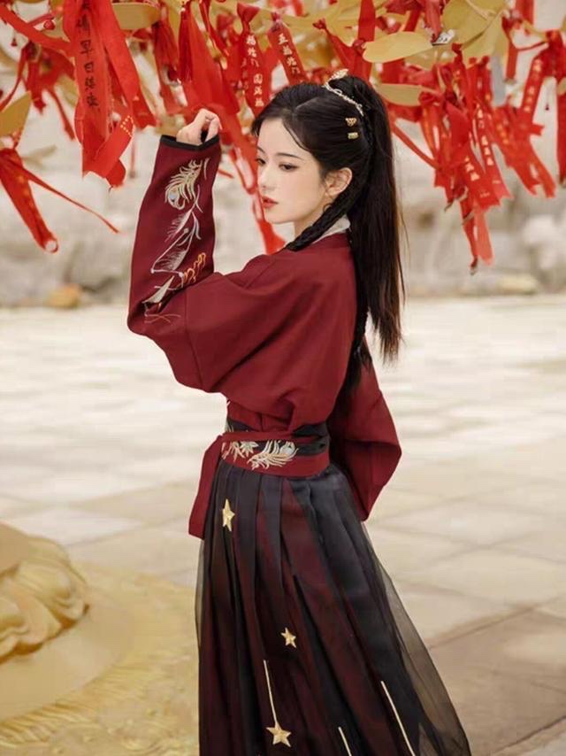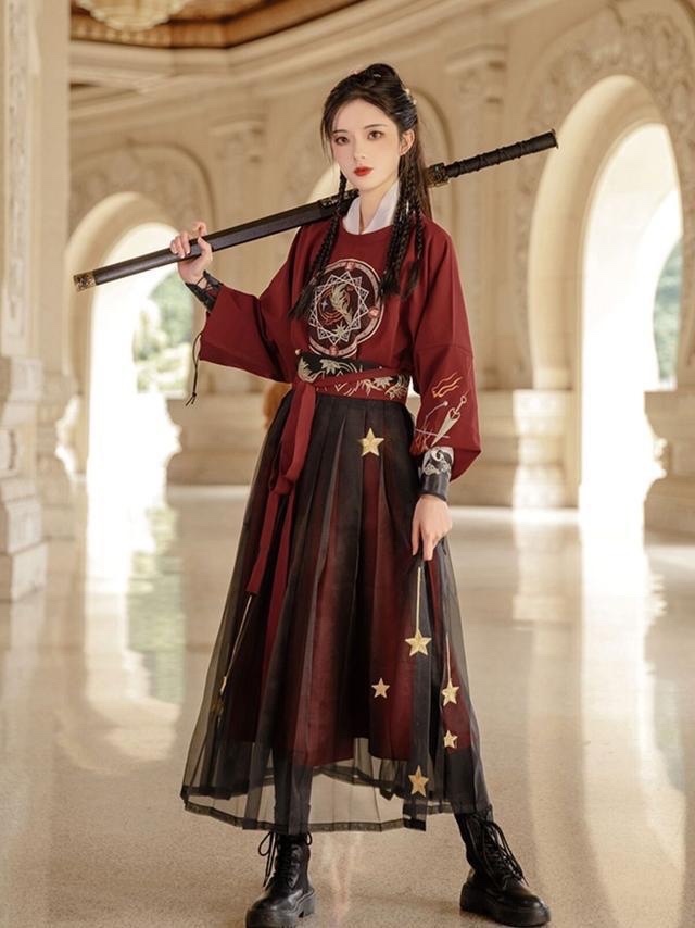 下裙的罩纱采用亮丝斜面料轻柔且灵动,其上绣有流星状的图案,飘逸出尘。这样一身搭配下来,让人像极了在江湖当中行走的侠女,十分帅气。