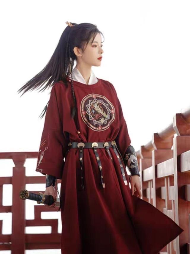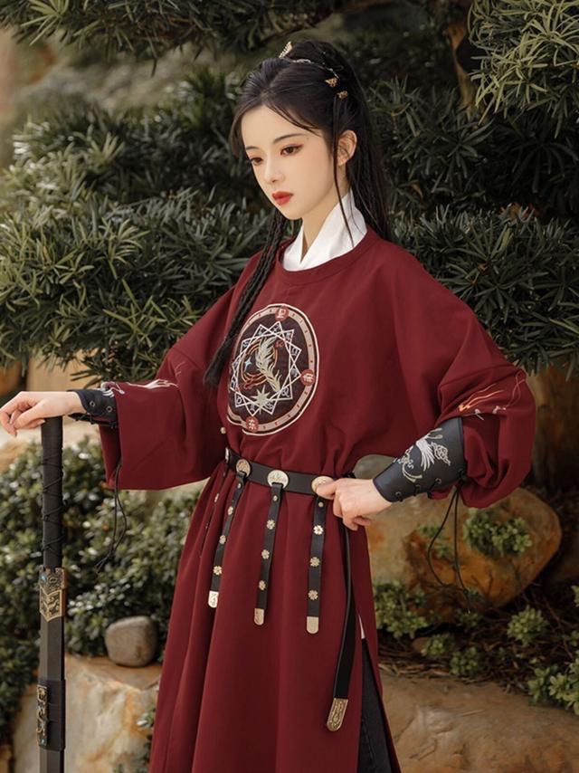 大部分的唐圆领袍或者是采用暗花布料,而这款唐圆领袍却采用了一种绣有星辰宫、罗盘、飞羽以及星辰等的绣花图样,让服装整体看起来既别致,而又富有新意。