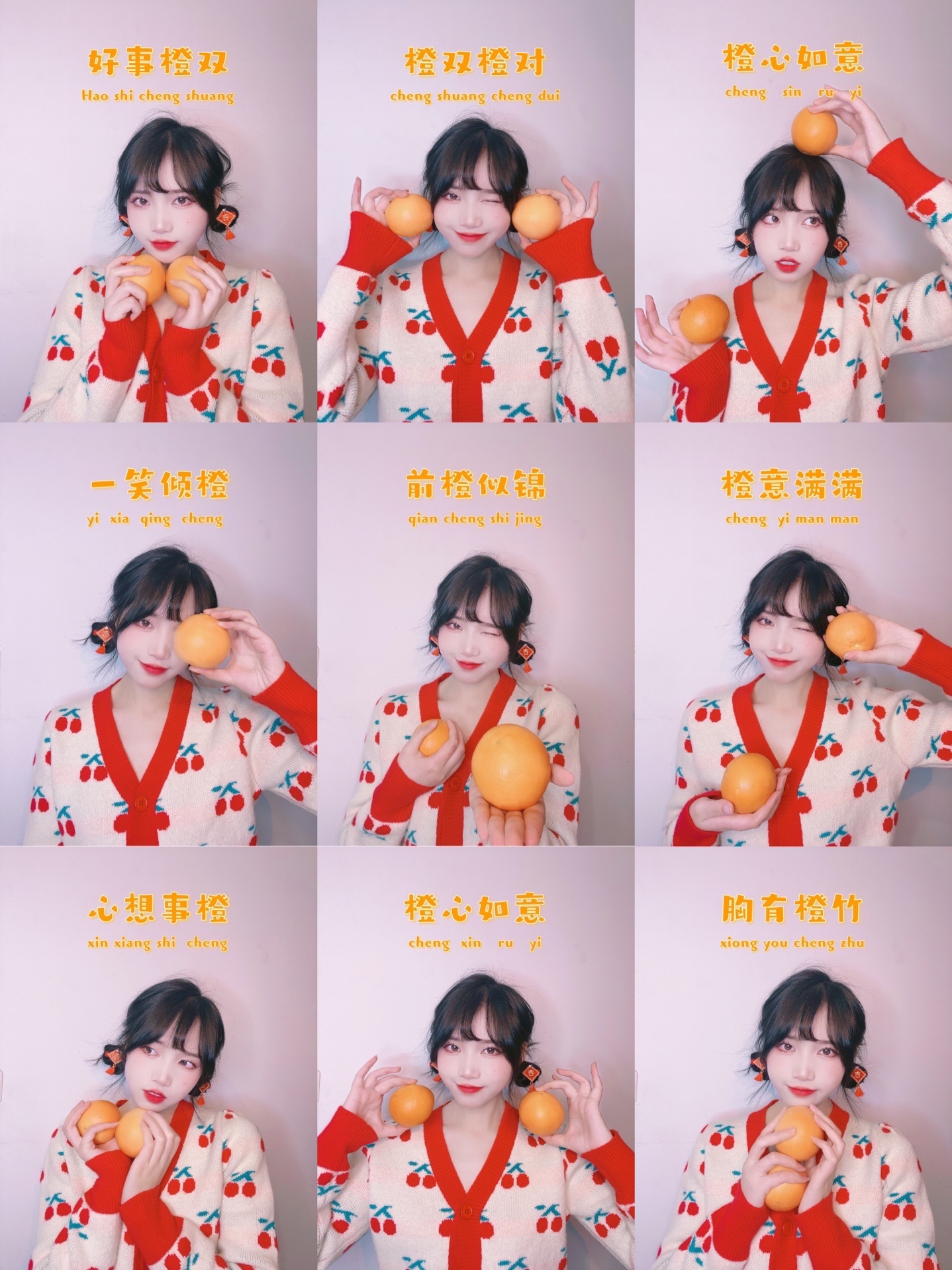 来分享一组超级好看的谐音梗九宫格自拍,非常适合新年发朋友圈,可以用橙子草莓柿子做为道具来自拍,真的很好看呀,拍上九张就可以了