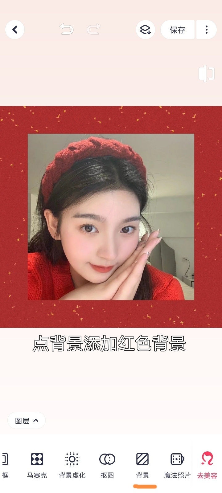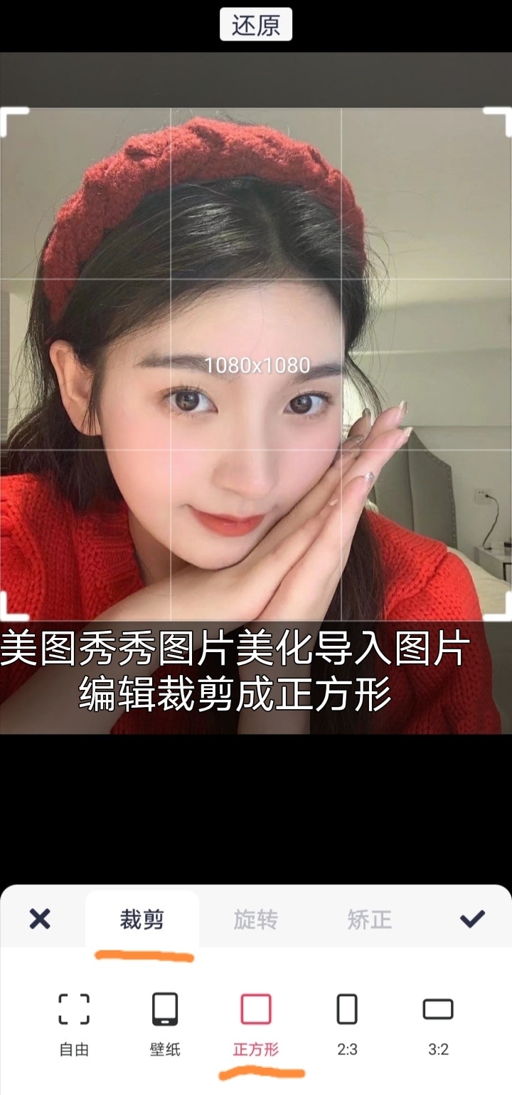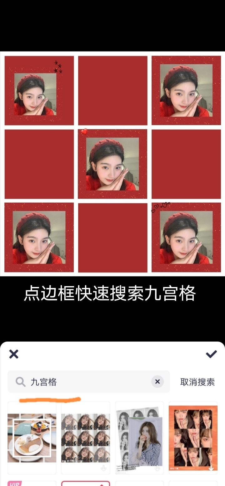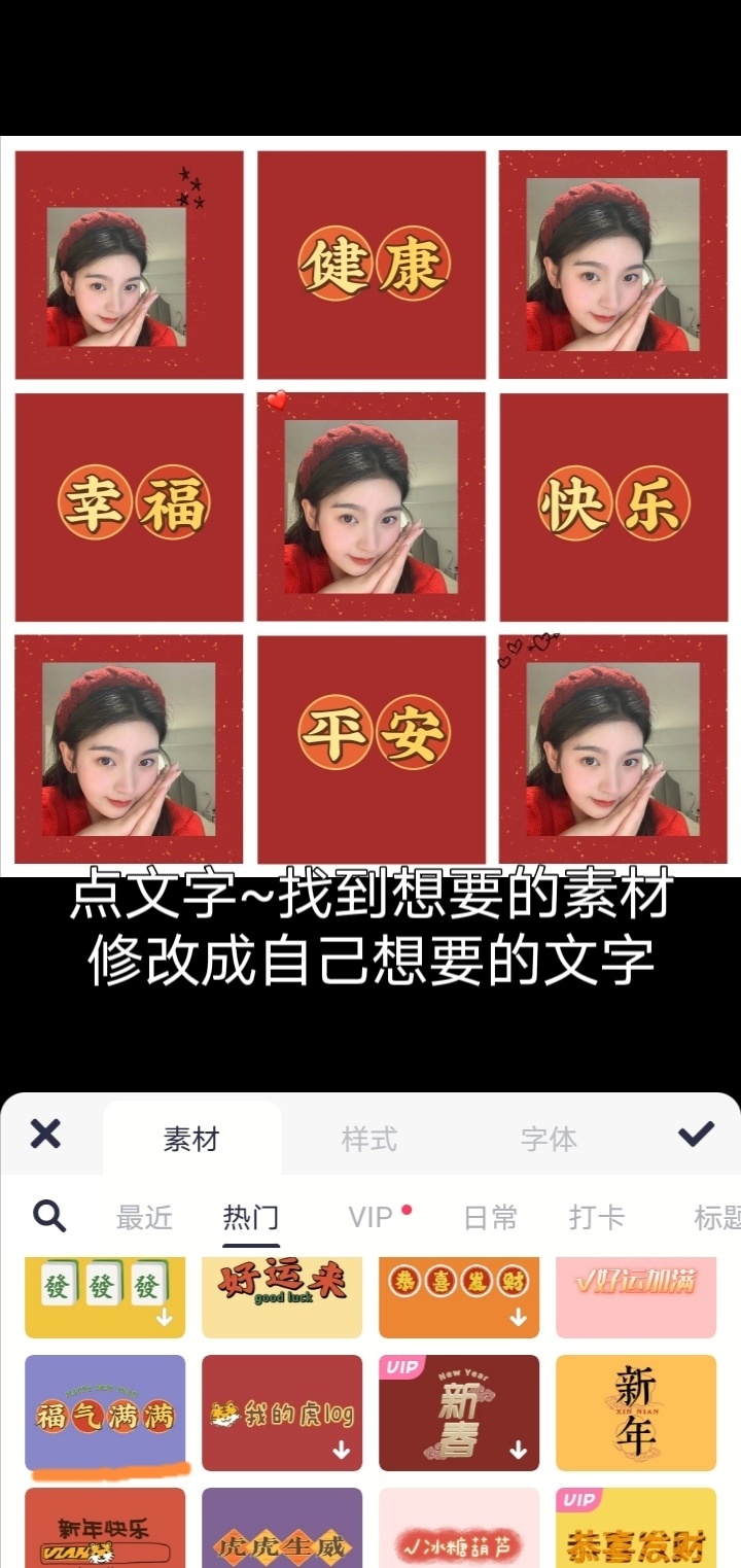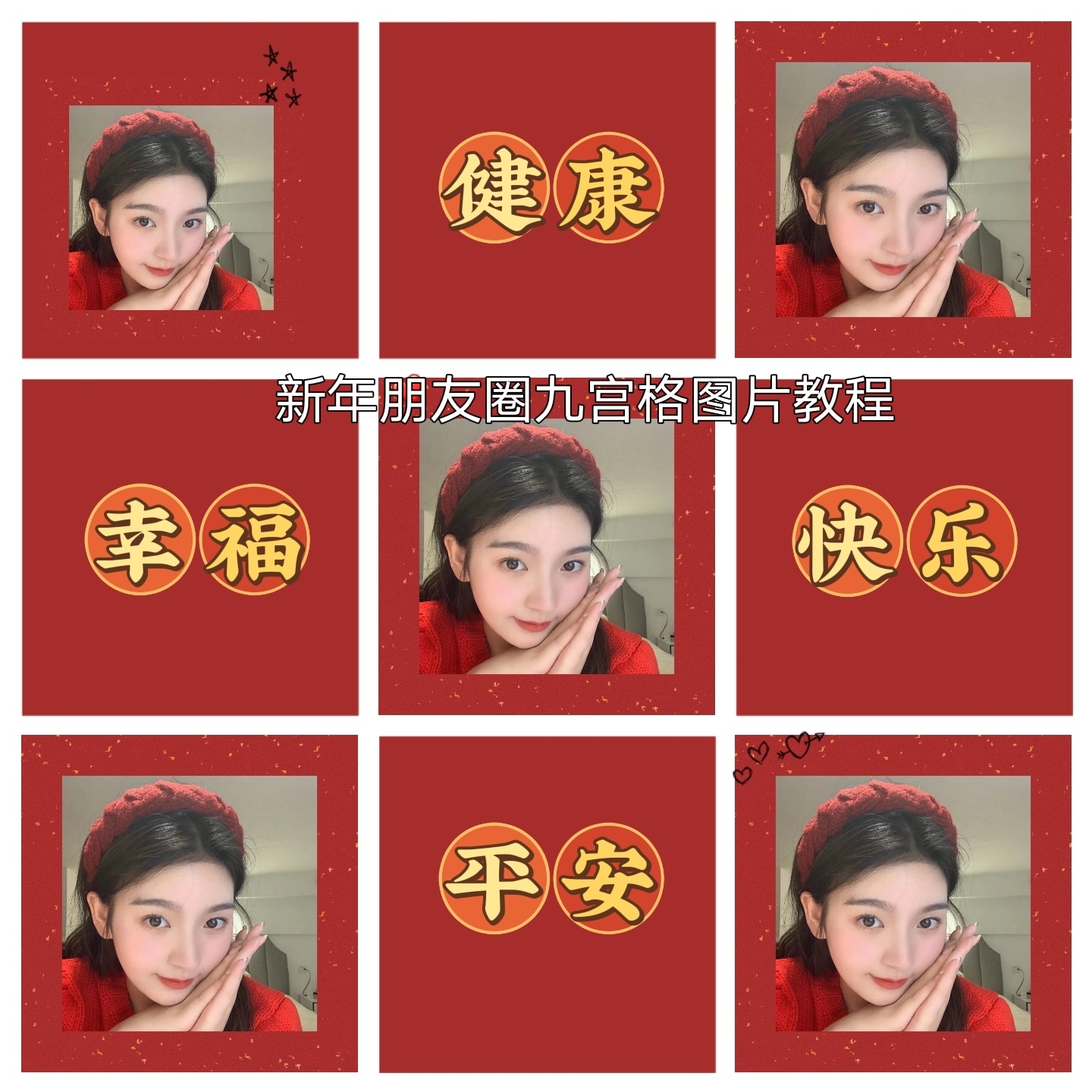 美图秀秀导入图片~编辑裁剪成正方形~添加红色背景~添加九宫格边框~添加文字健康平安幸福快乐