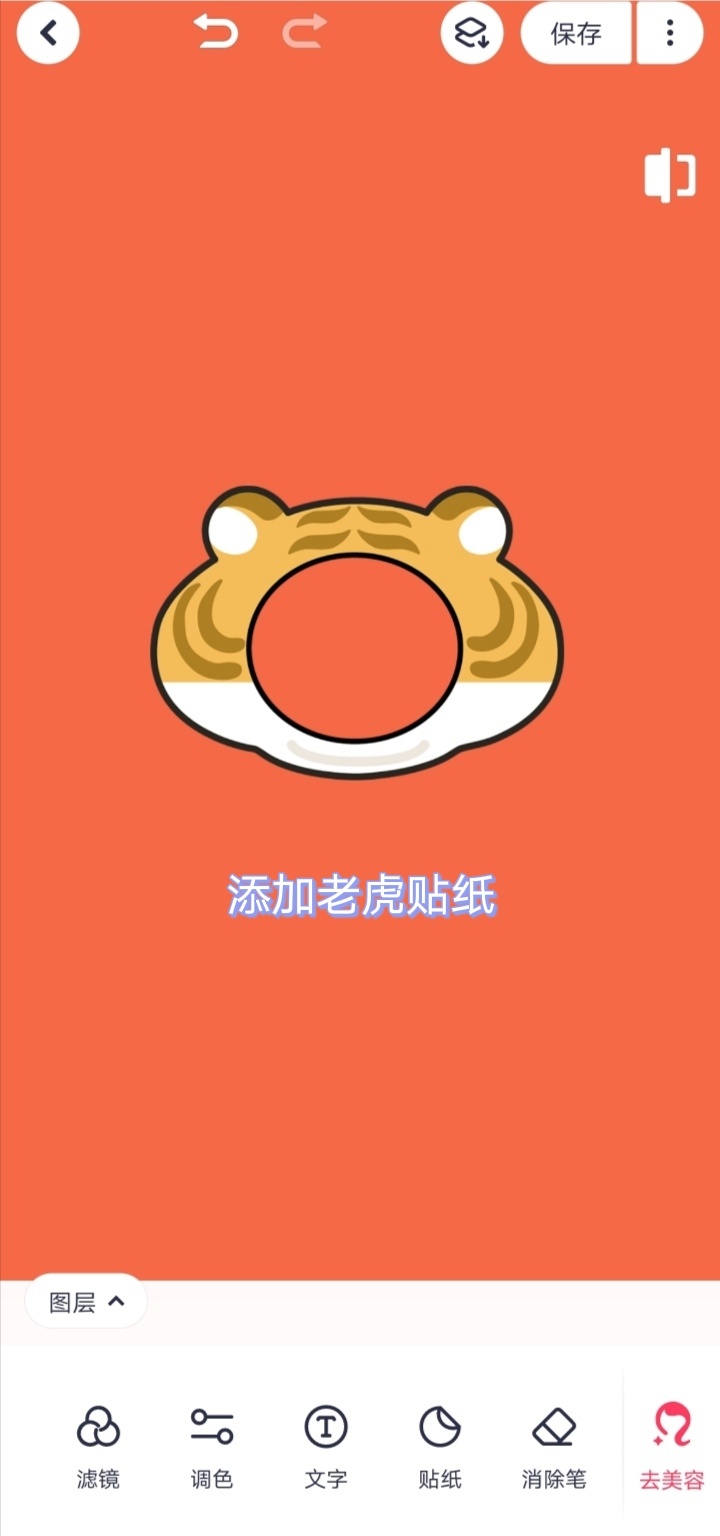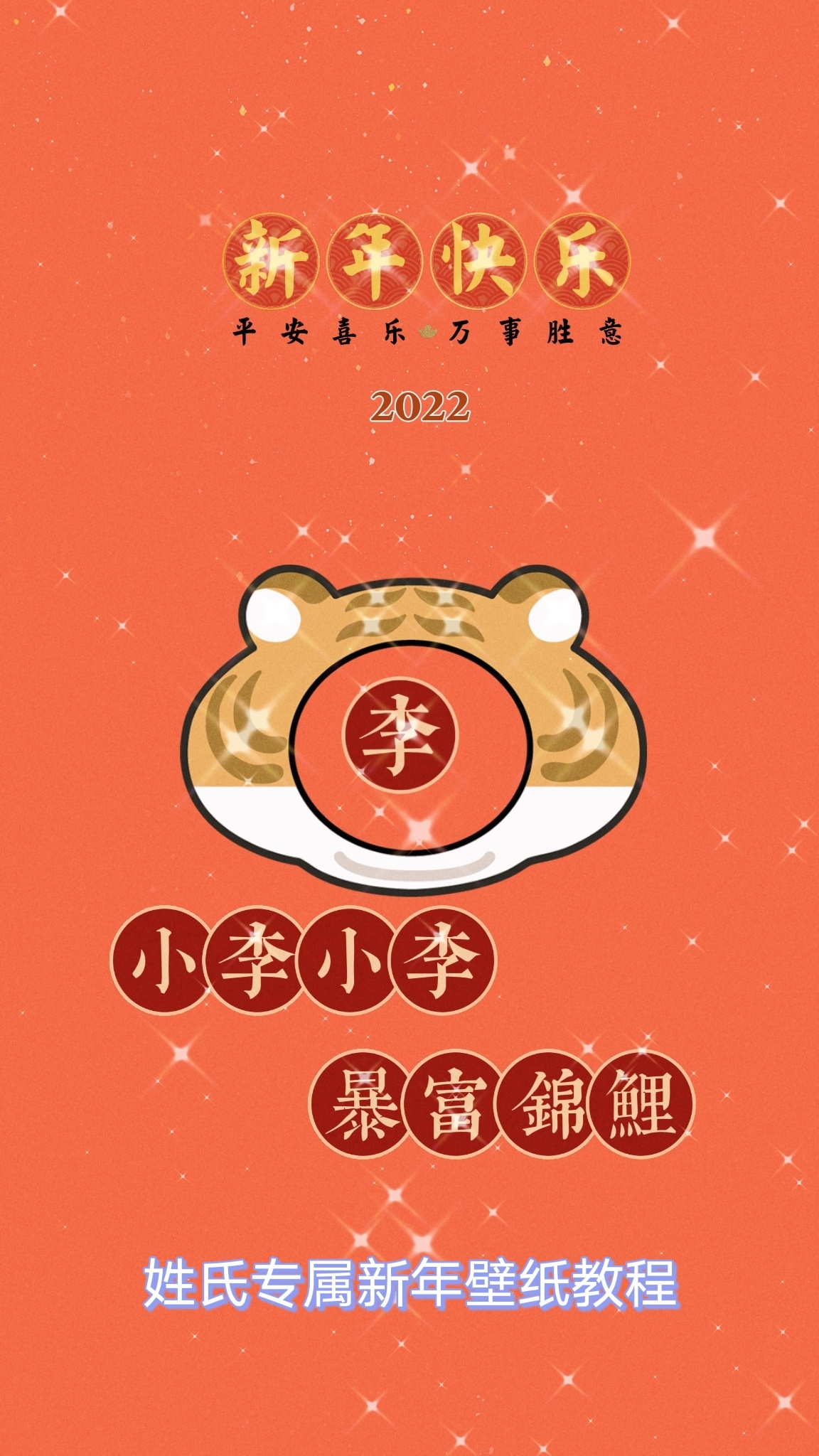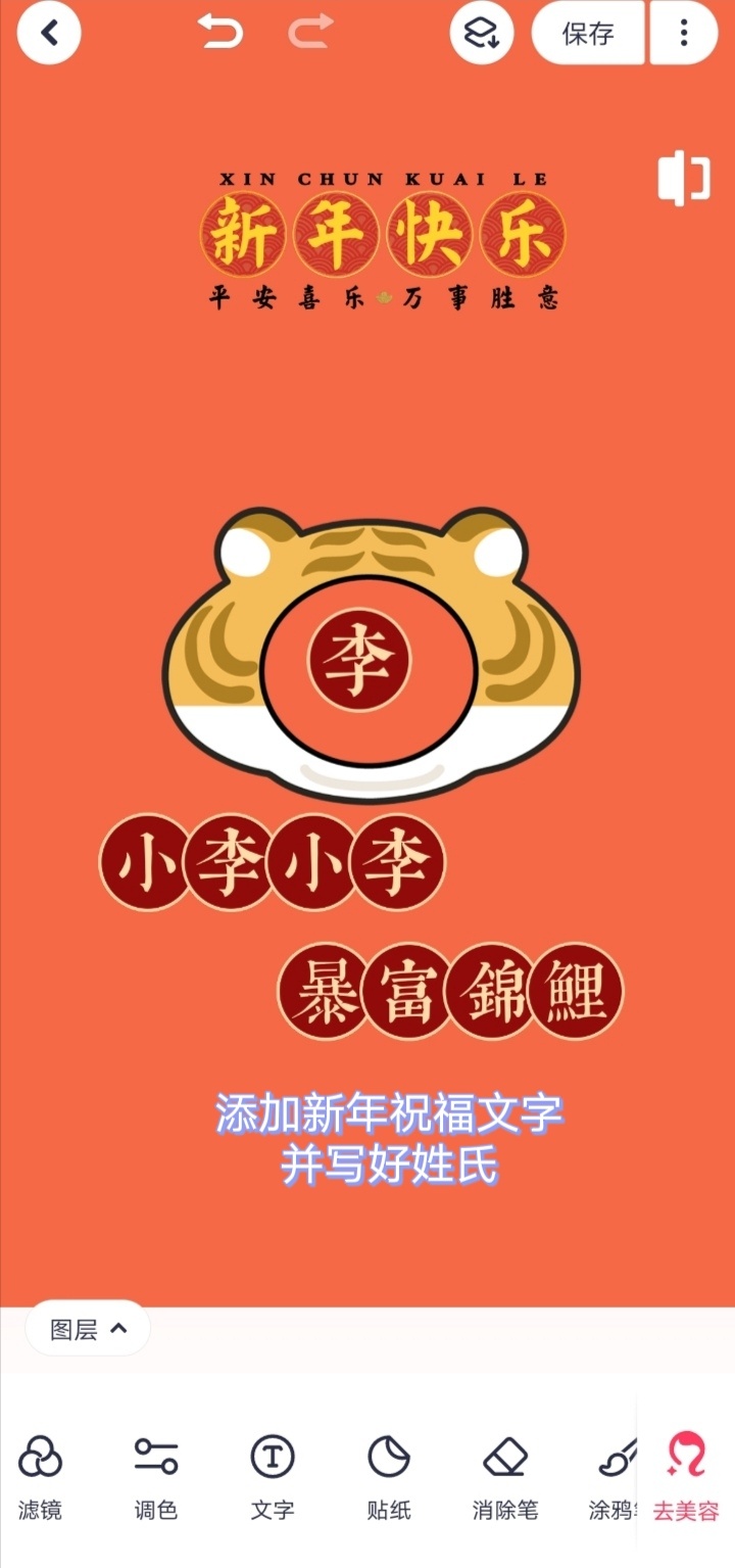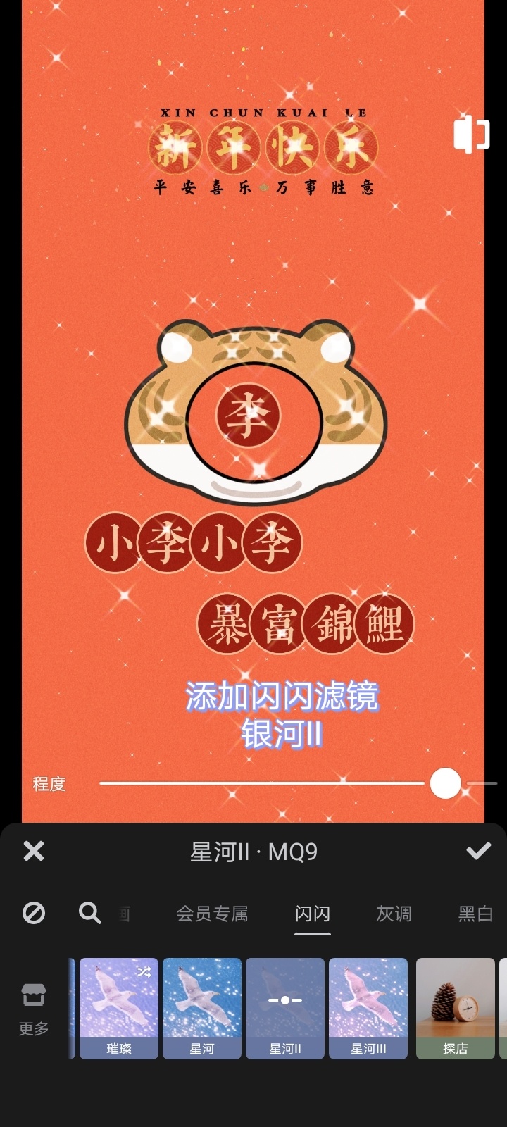 打开美图秀秀制作壁纸,选择一个喜庆的颜色~添加老虎贴纸~添加祝福文字和姓氏~添加闪闪银河Ⅱ滤镜。
