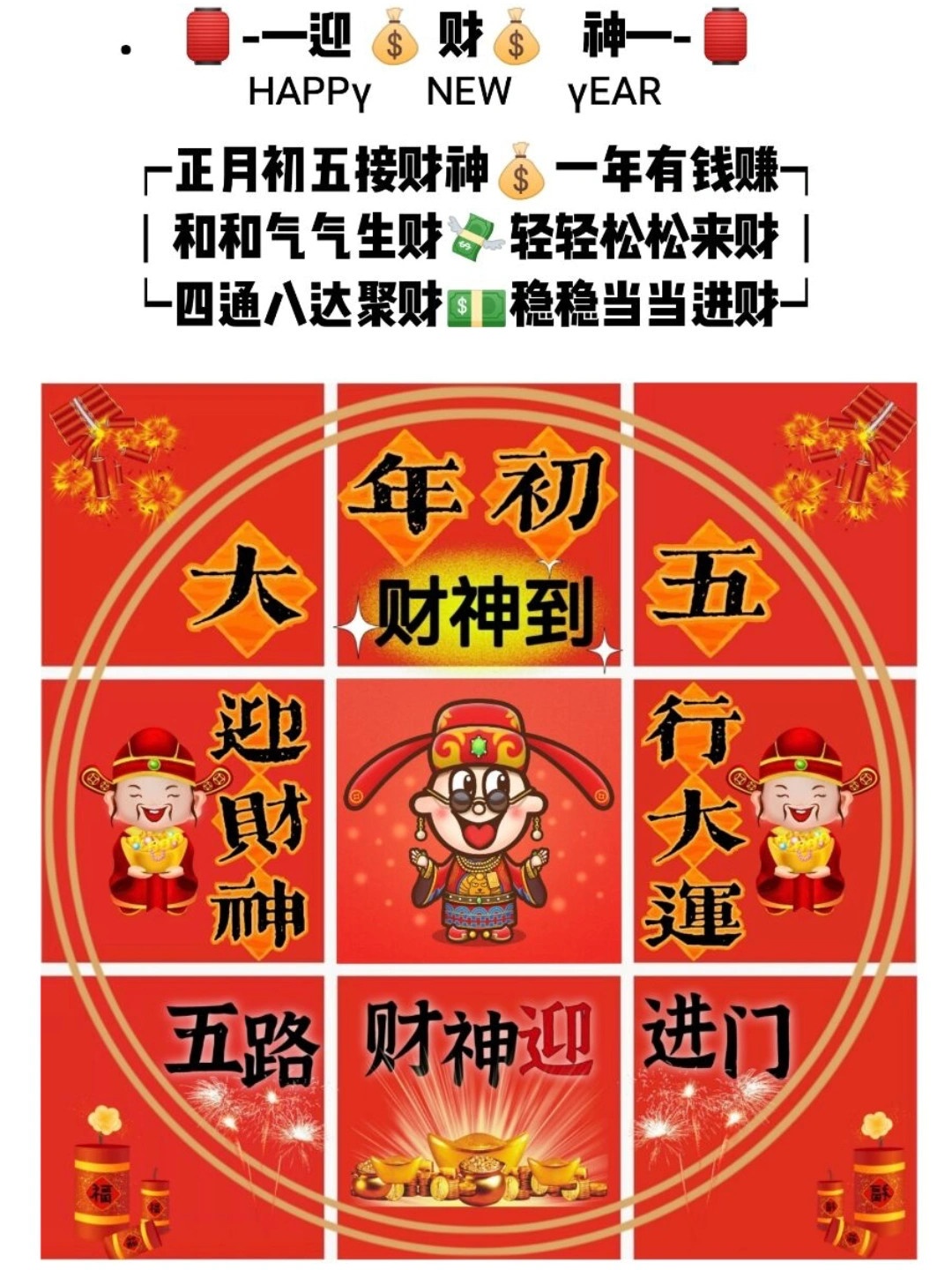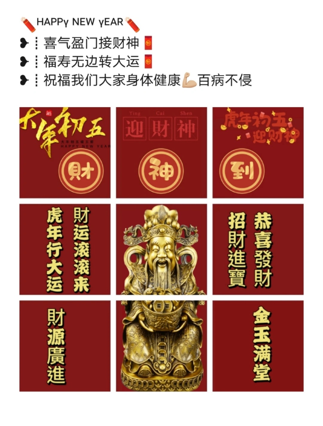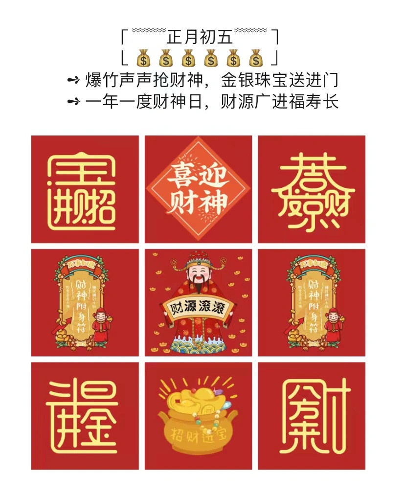 新年初五文案|朋友圈九宫格发圈配图素材文案|初五接财神 | 喜迎财神爷 | 文案素材配图|迎财神文案 | 九宫格素材 | 大年初五 | 迎财神 | 财神到 | 接财神 | 迎财神九宫格 | 恭喜发财