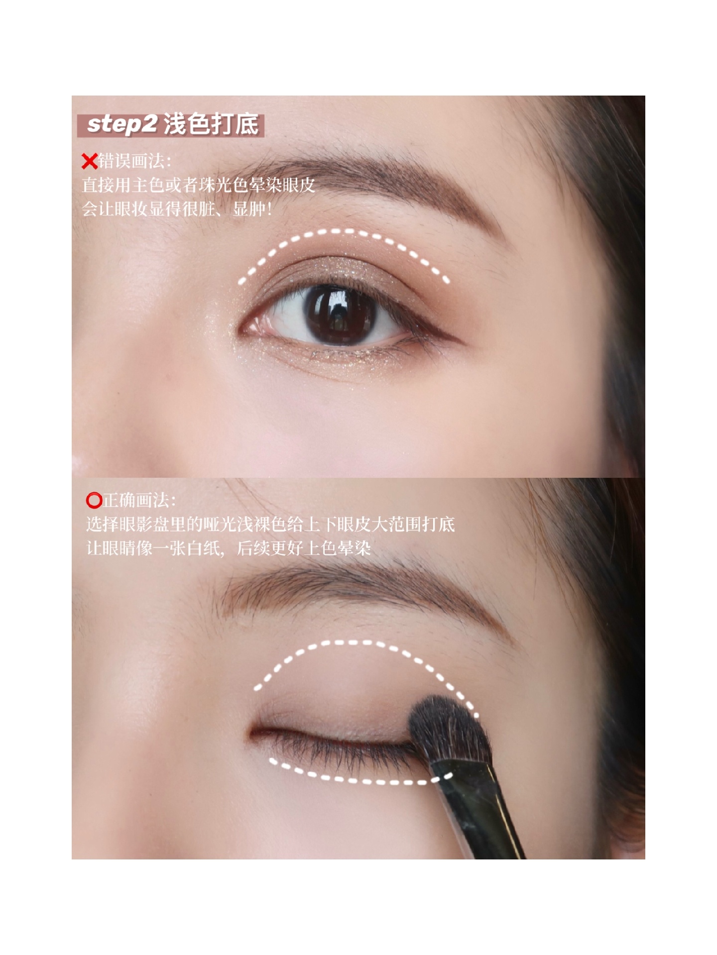 2⃣用眼影盘中最浅的近肉肤色给眼皮打底,让眼皮变成一张干净的白纸