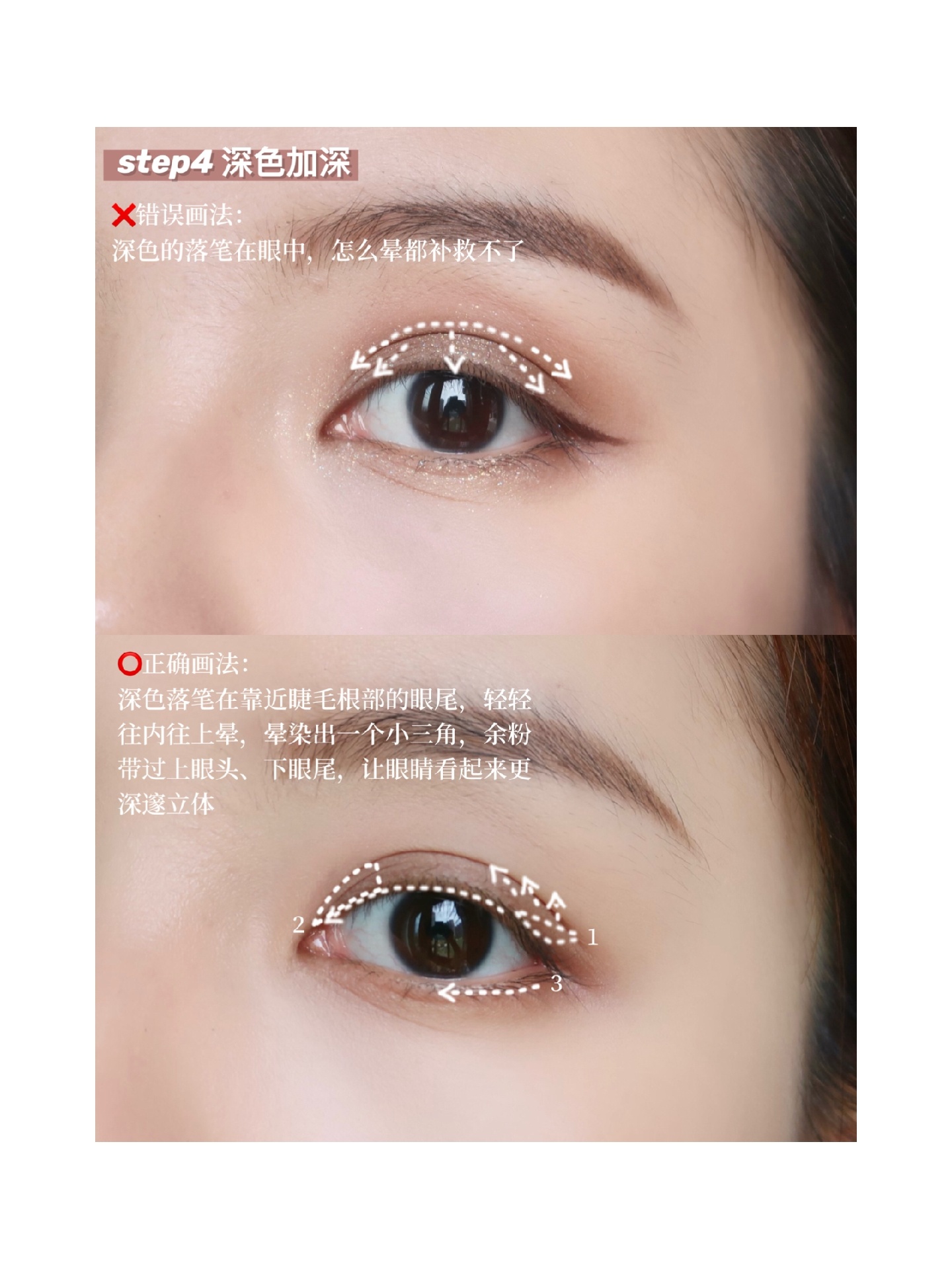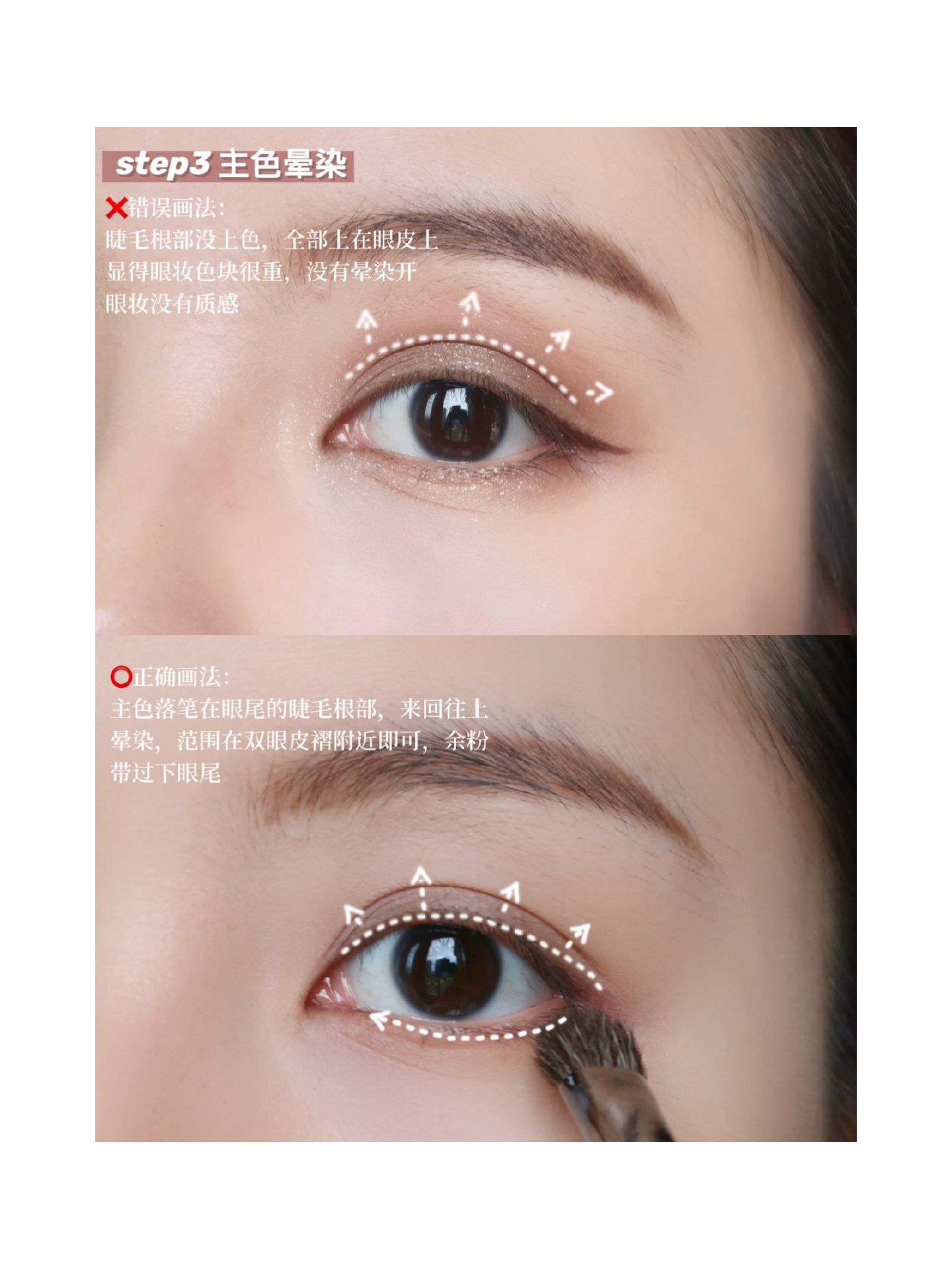 3⃣注意主色、加深色落笔都在眼尾靠近睫毛根部,不要在眼皮上直接晕染
