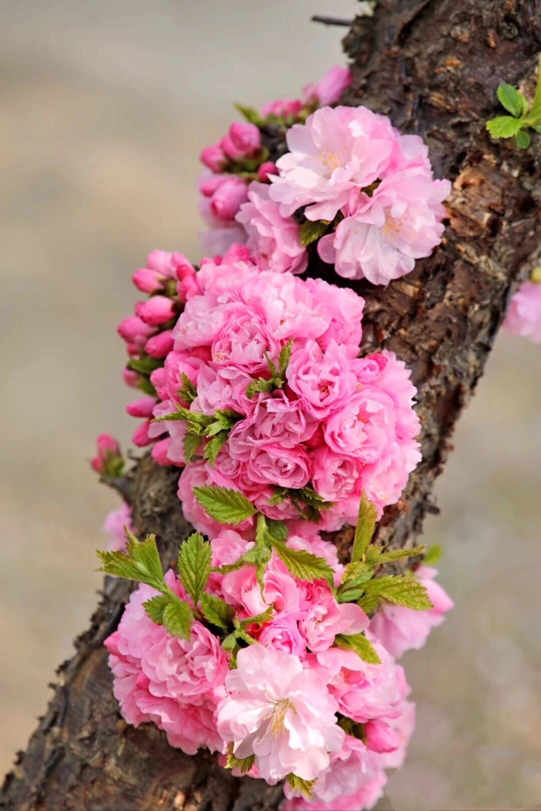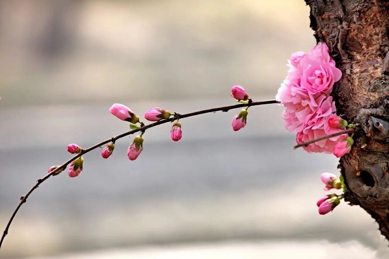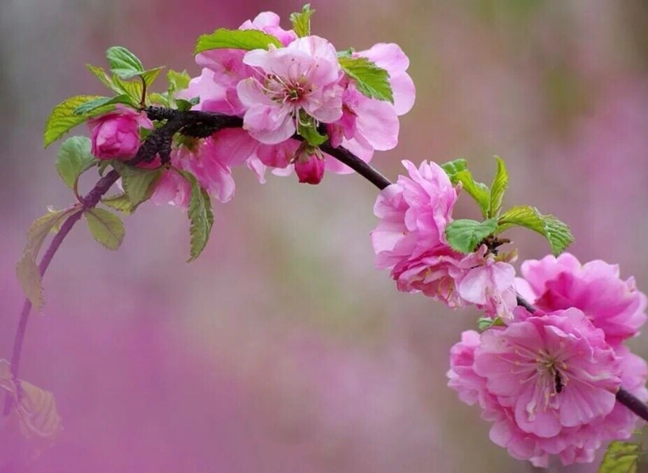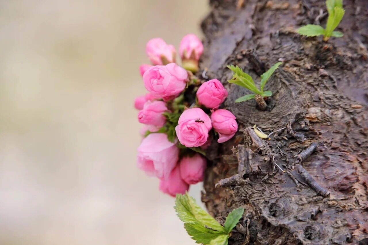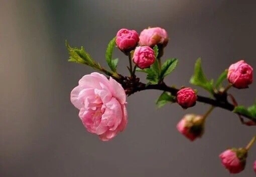 似梅非梅小桃红,榆树叶子重瓣浓,淡淡清香甜甜味,不畏寒春绿海中。