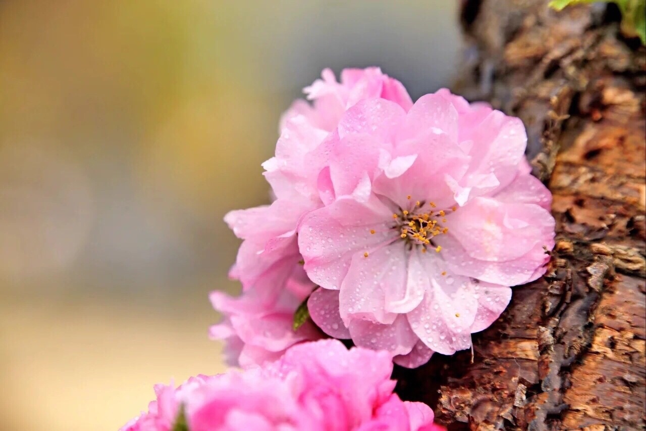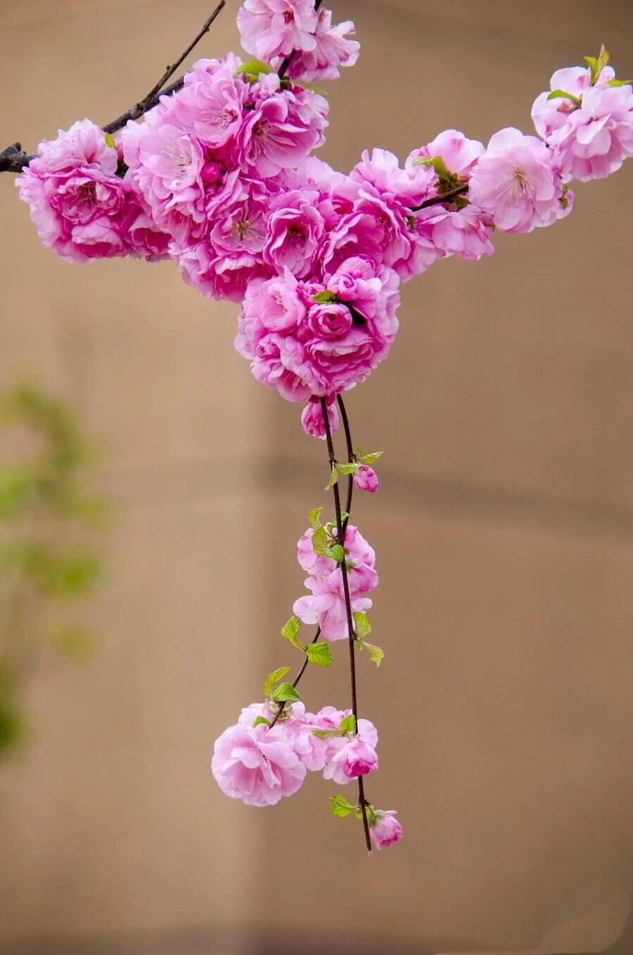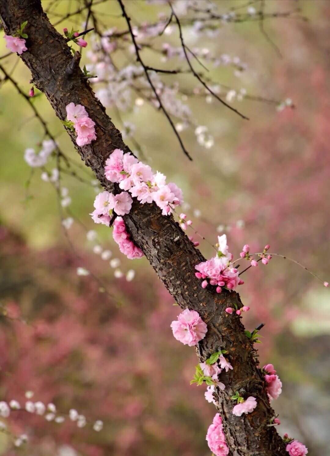 似梅非梅小桃红,榆树叶子重瓣浓,淡淡清香甜甜味,不畏寒春绿海中。