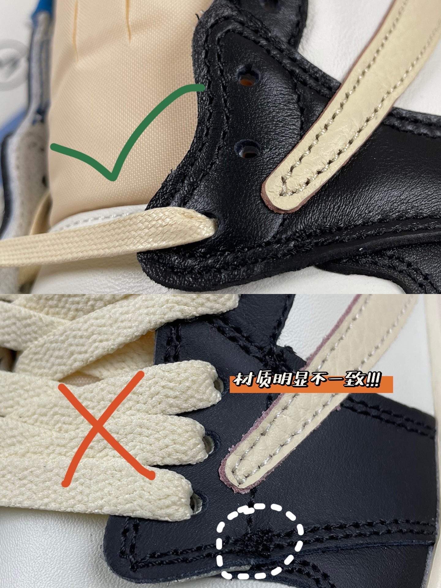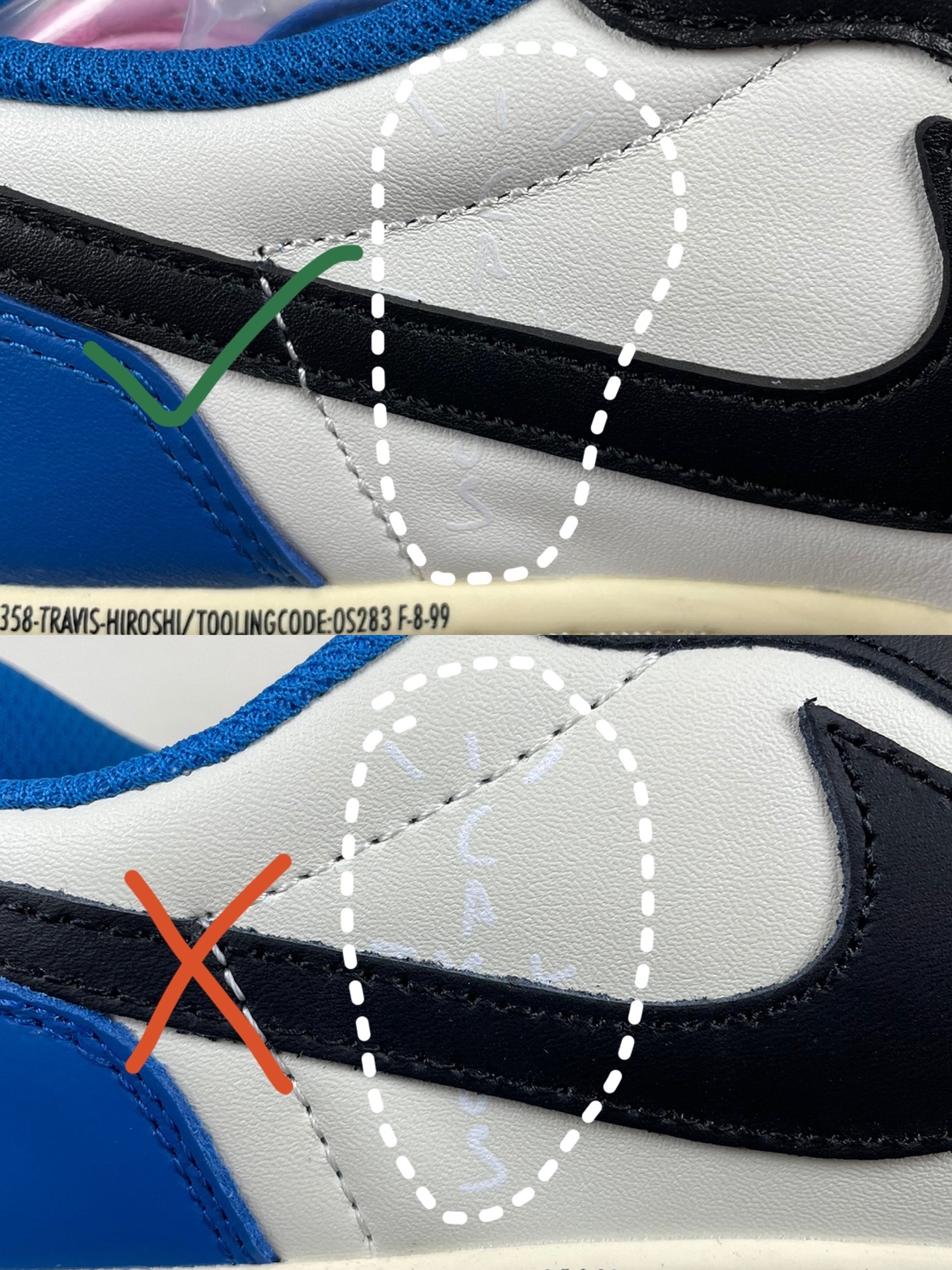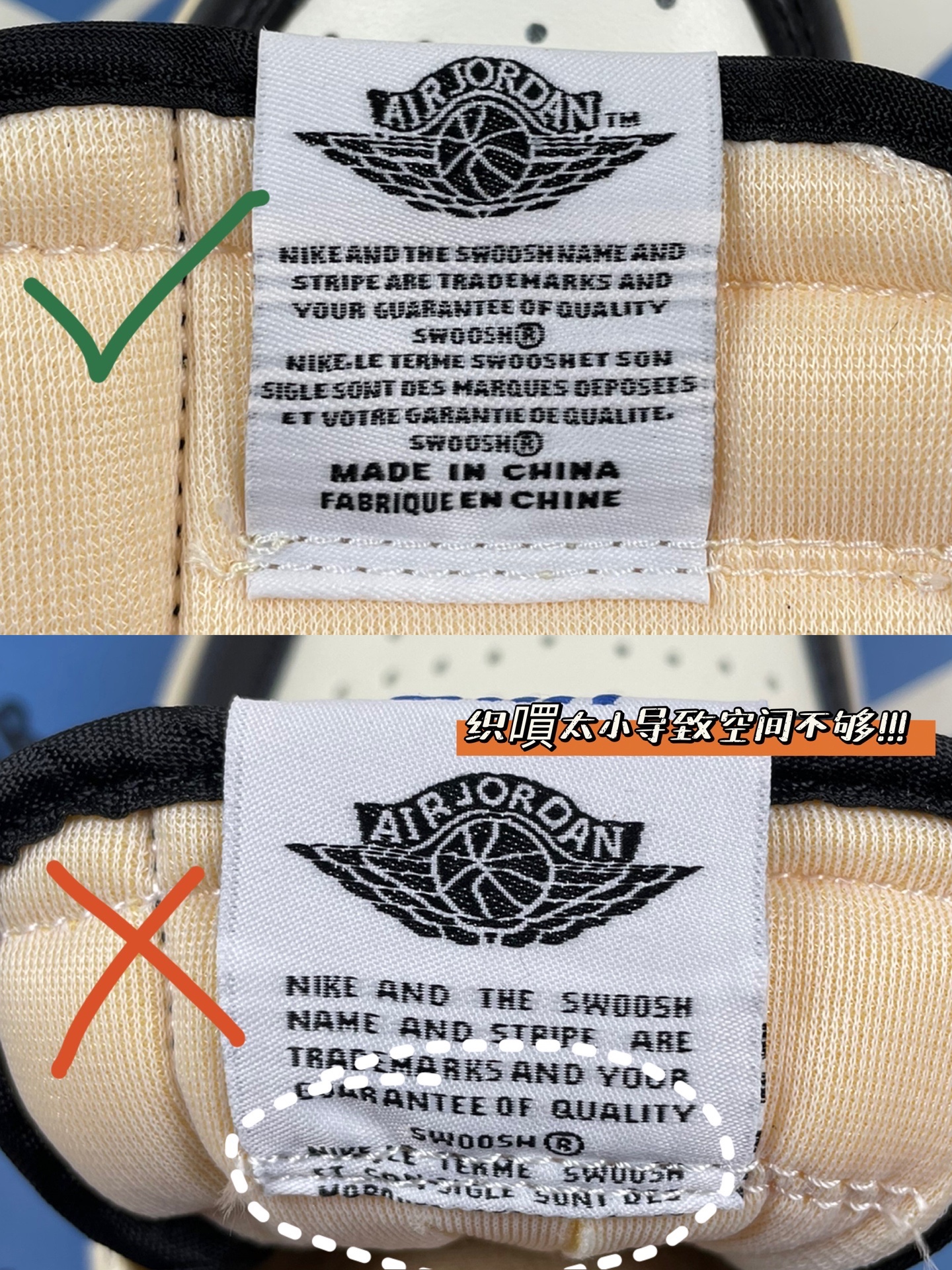 Aj1倒钩的倒钩前段到鞋孔的距离是一样的,而且每个距离都会有变化,走线也不会有多余线头瑕疵