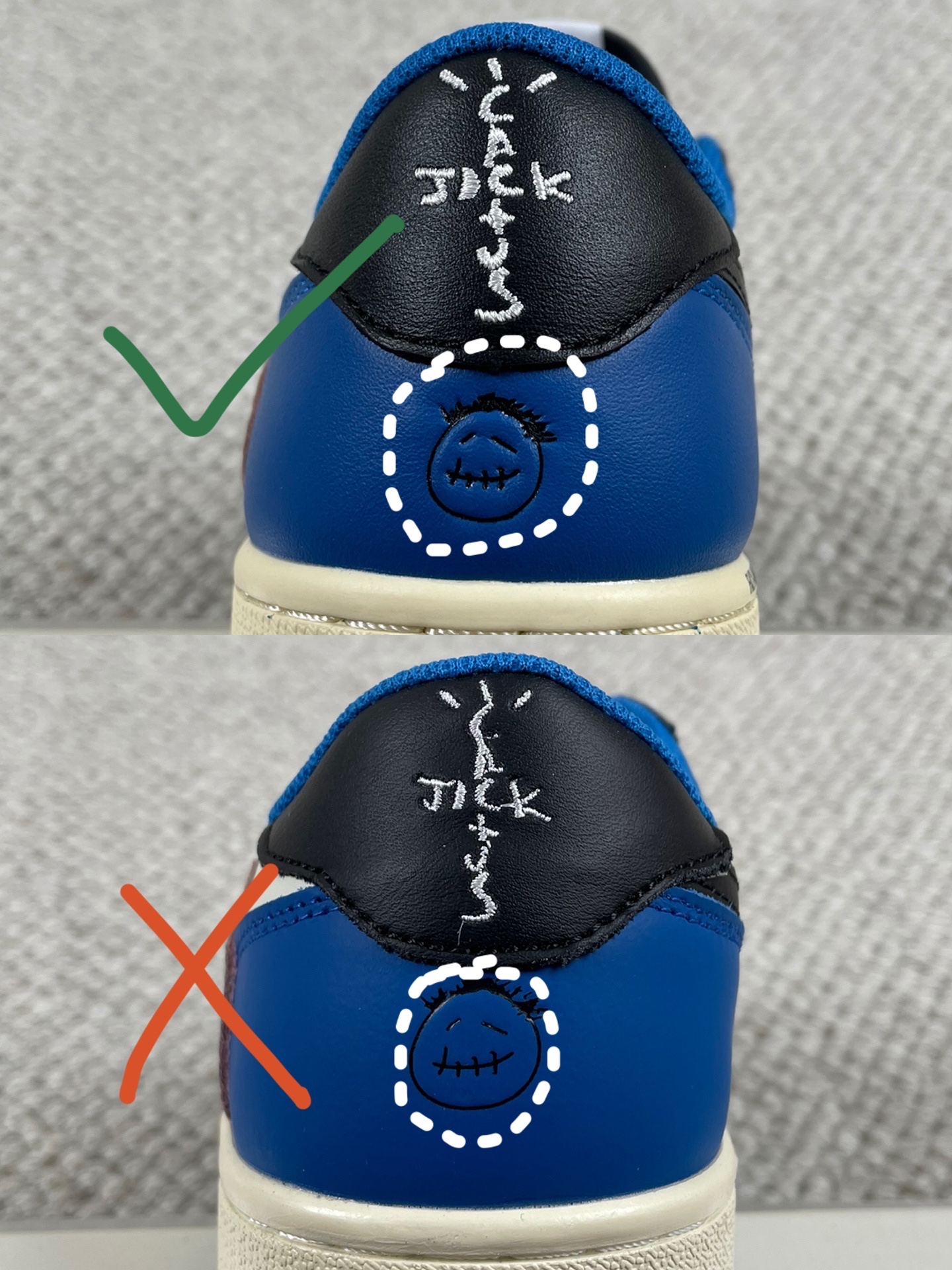 Aj1倒钩后跟是宽版,鬼脸的脸轮廓清晰,头发依稀可见