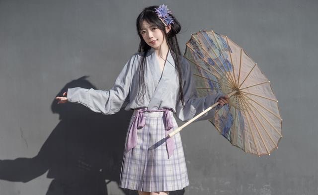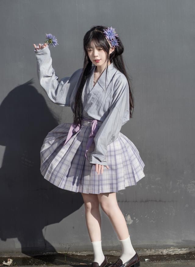 [汉服混搭] 灰色汉服+紫白格JK裙
