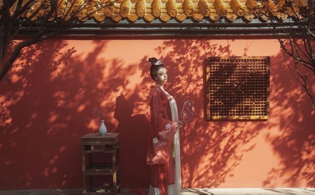 从颜色的搭配和图案的设计上,酒红色的汉服外搭给人一种高贵优雅的感觉,而且这个小姐姐本来就白,这种颜色刚好能够称托出小姐姐白皙的肤色。