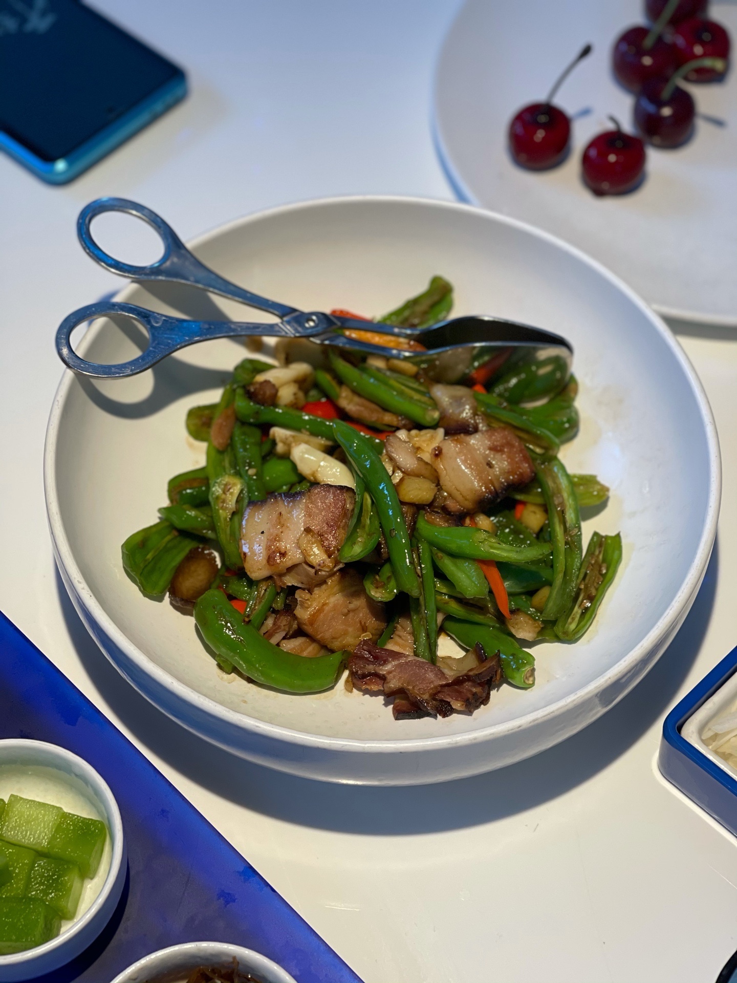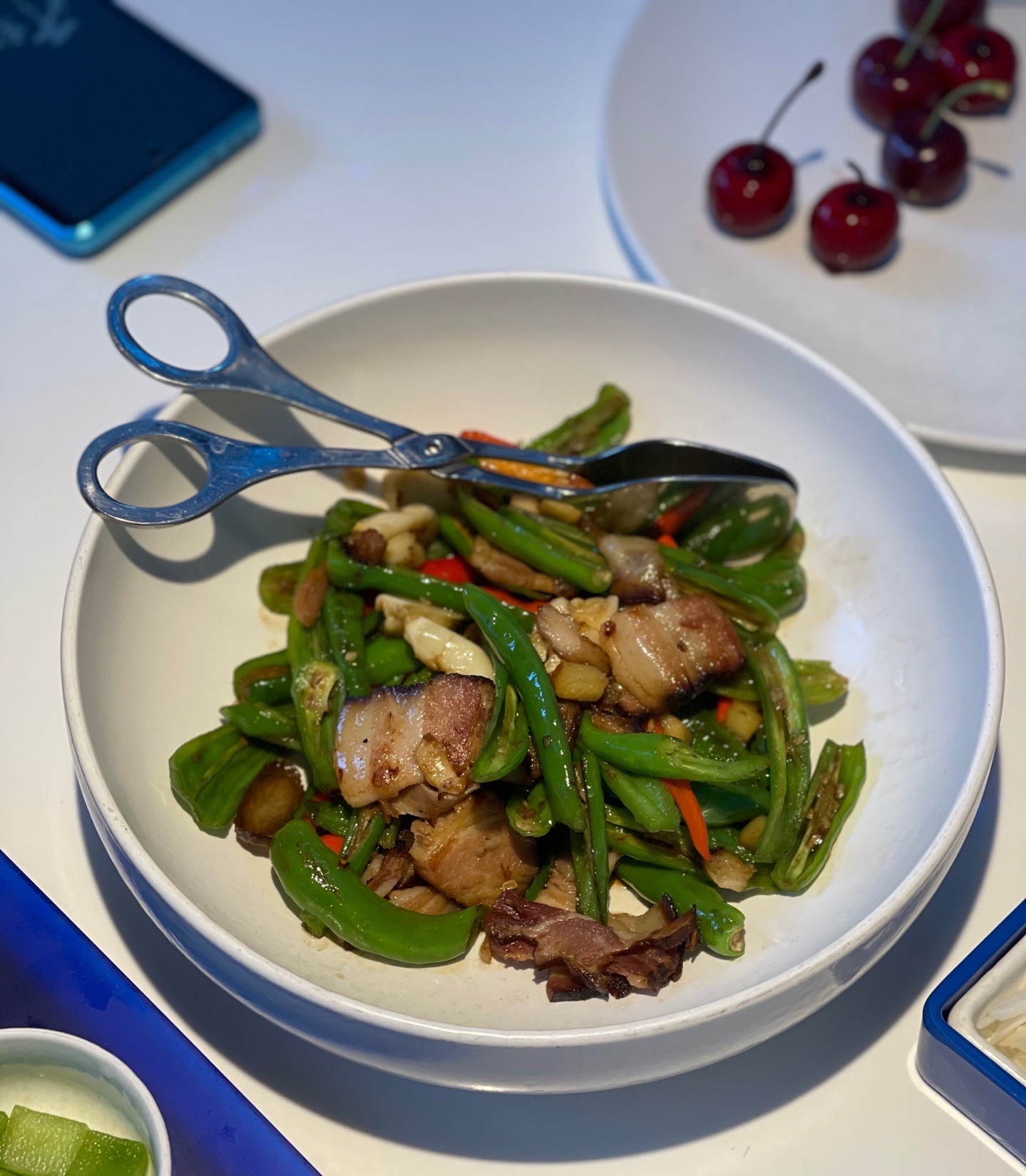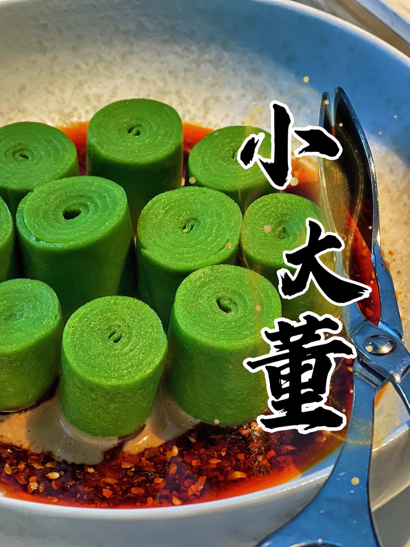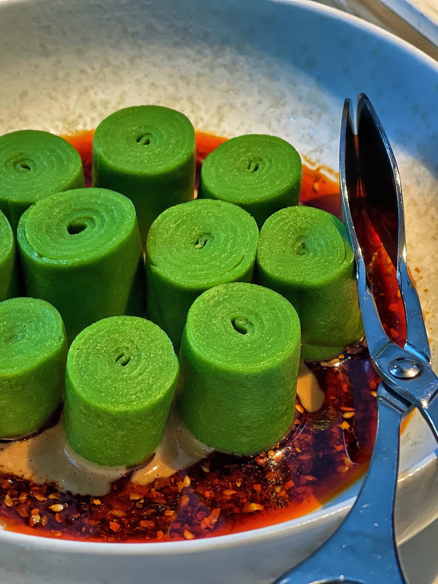 绿色的凉皮是卷成一卷的,底下是辣椒油和麻酱,我居然新奇的以为要把凉皮打开拌了吃,询问了服务员才知道就是这么直接蘸着吃的。味道不错,也确实解锁了凉皮新吃法。
