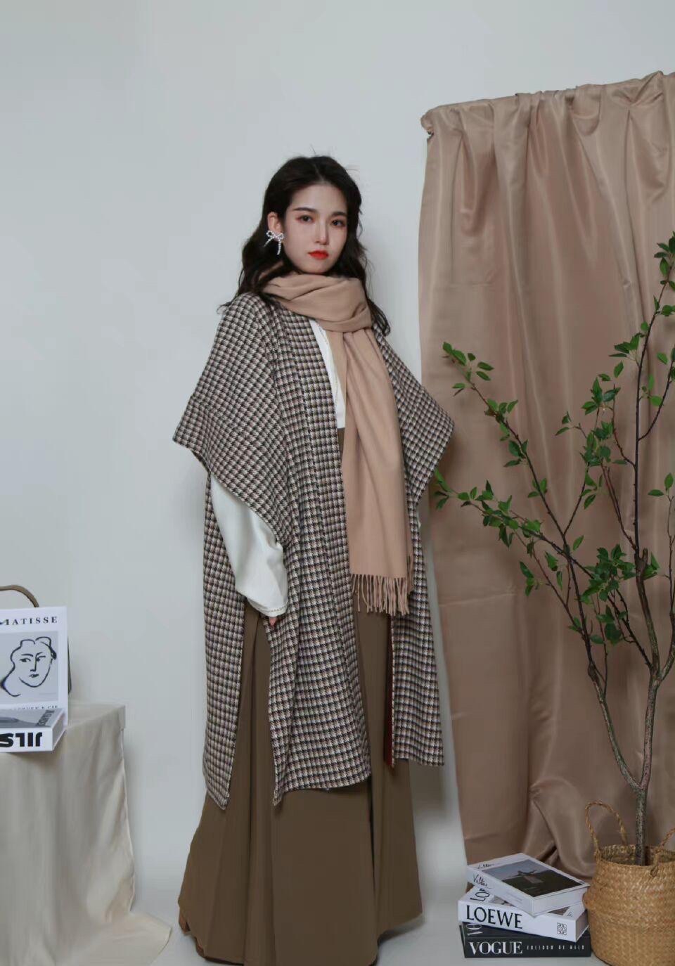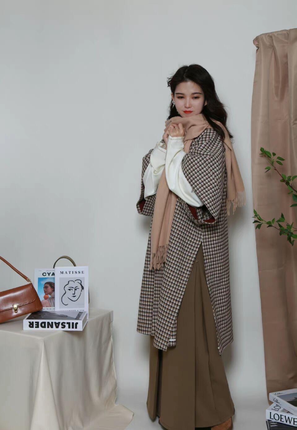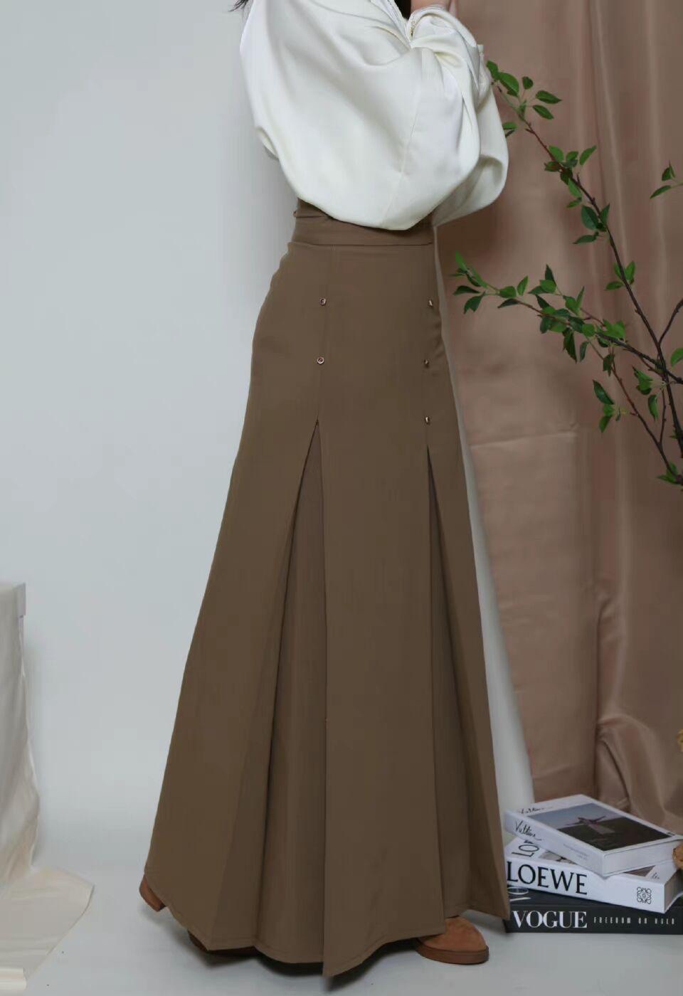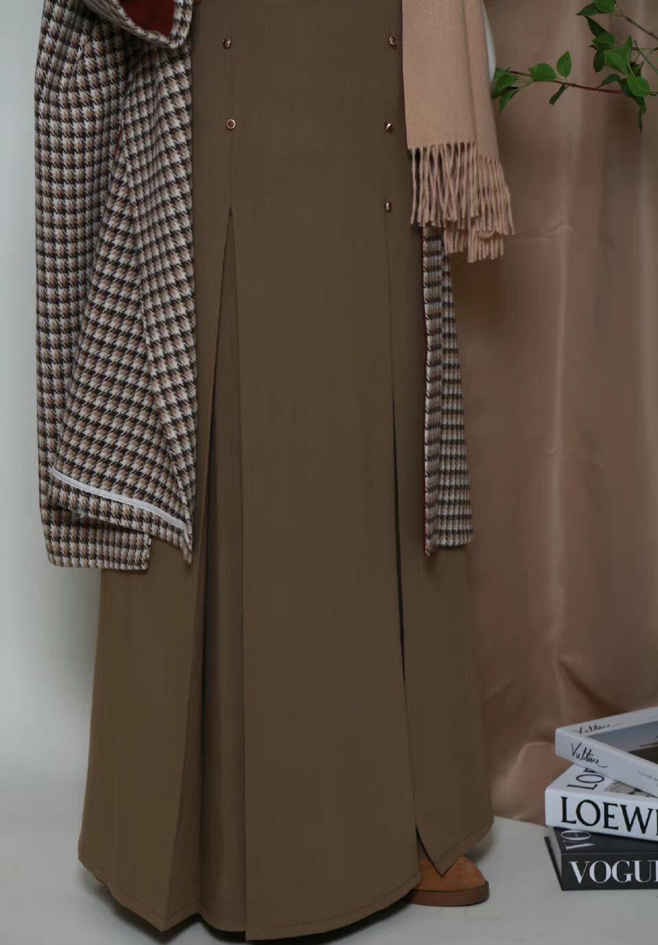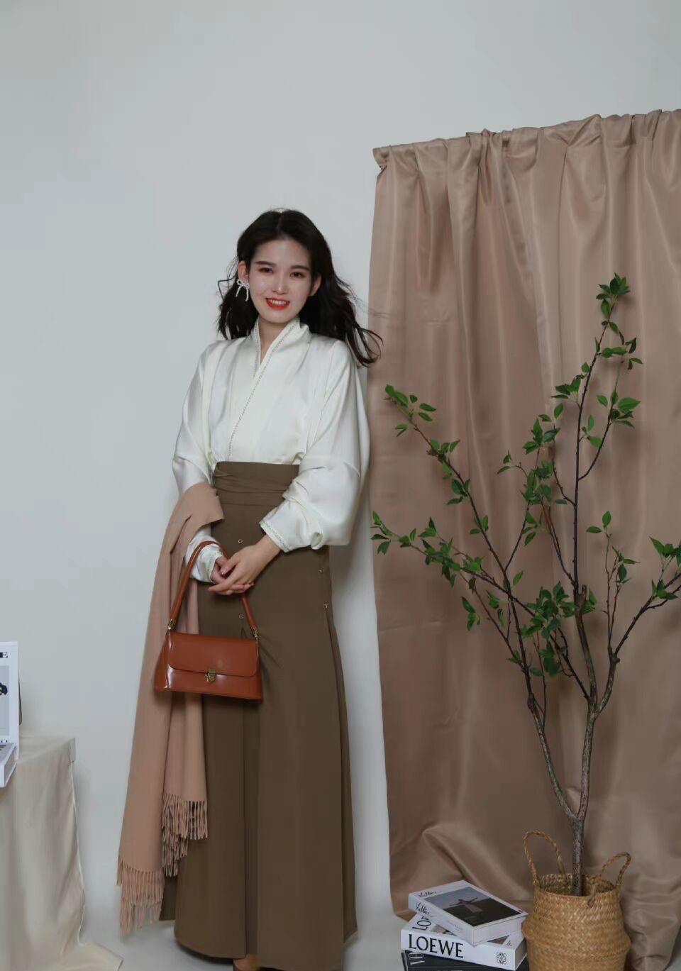 下半身选择的是一条深棕色的三裥裙,高腰的设计加上飘逸垂顺的长裙摆,两侧以及前侧都带有褶皱设计,既像阔腿裤又像裤裙,实穿又时髦。整体造型简约又不失古典美。