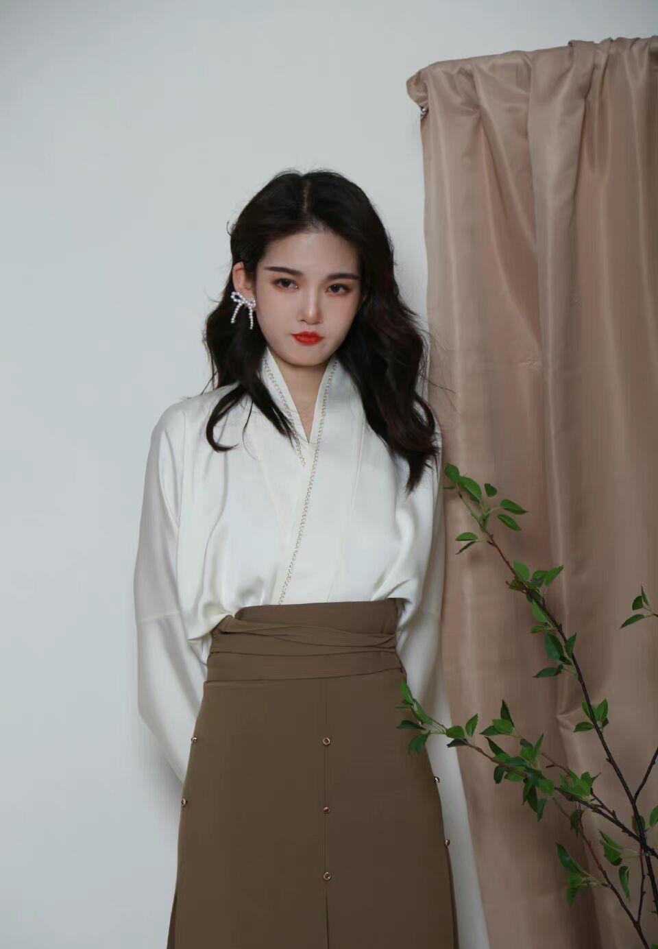 图片中的小姐姐选择了一件白色的衬衫,形制类似于交领短袄,袖口以及肩部的设计沿用的是现代衬衫的剪裁,面料光滑垂顺,袖口以及领口的位置还增加了银色的刺绣。