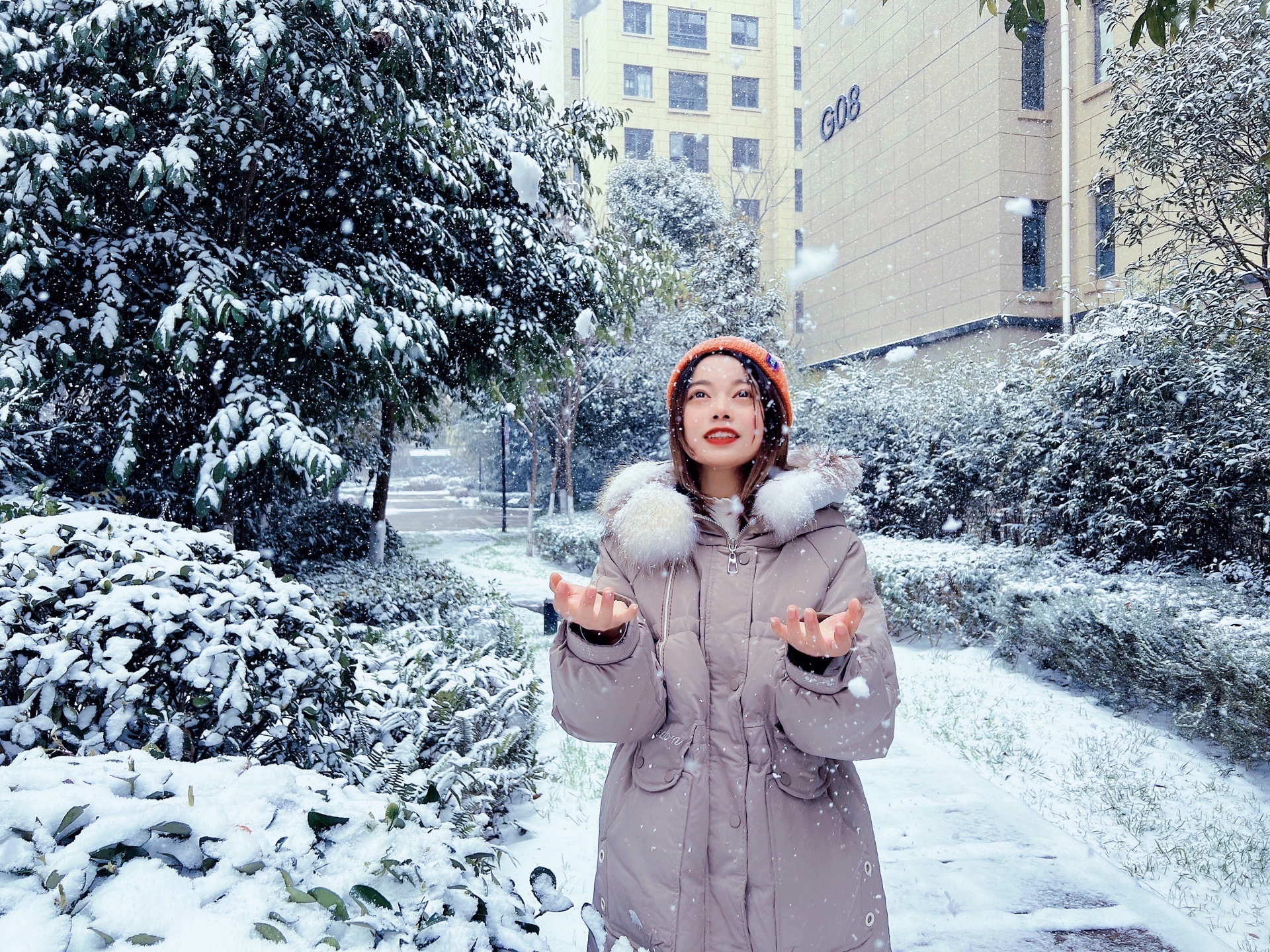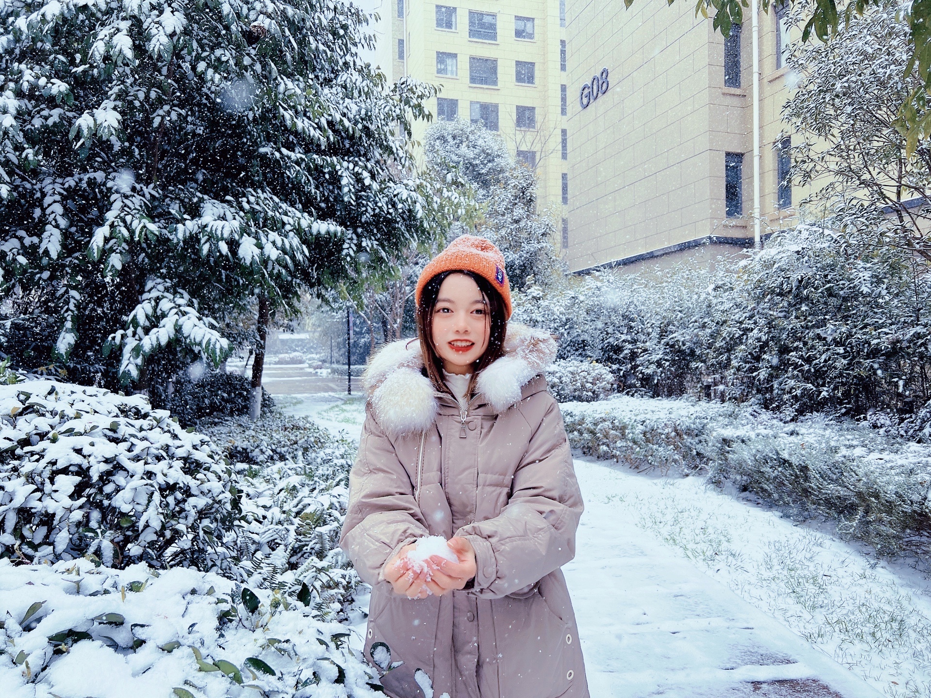 3.拢一团雪对着镜头笑,纷纷扬扬的雪花落下,真的超级美✨