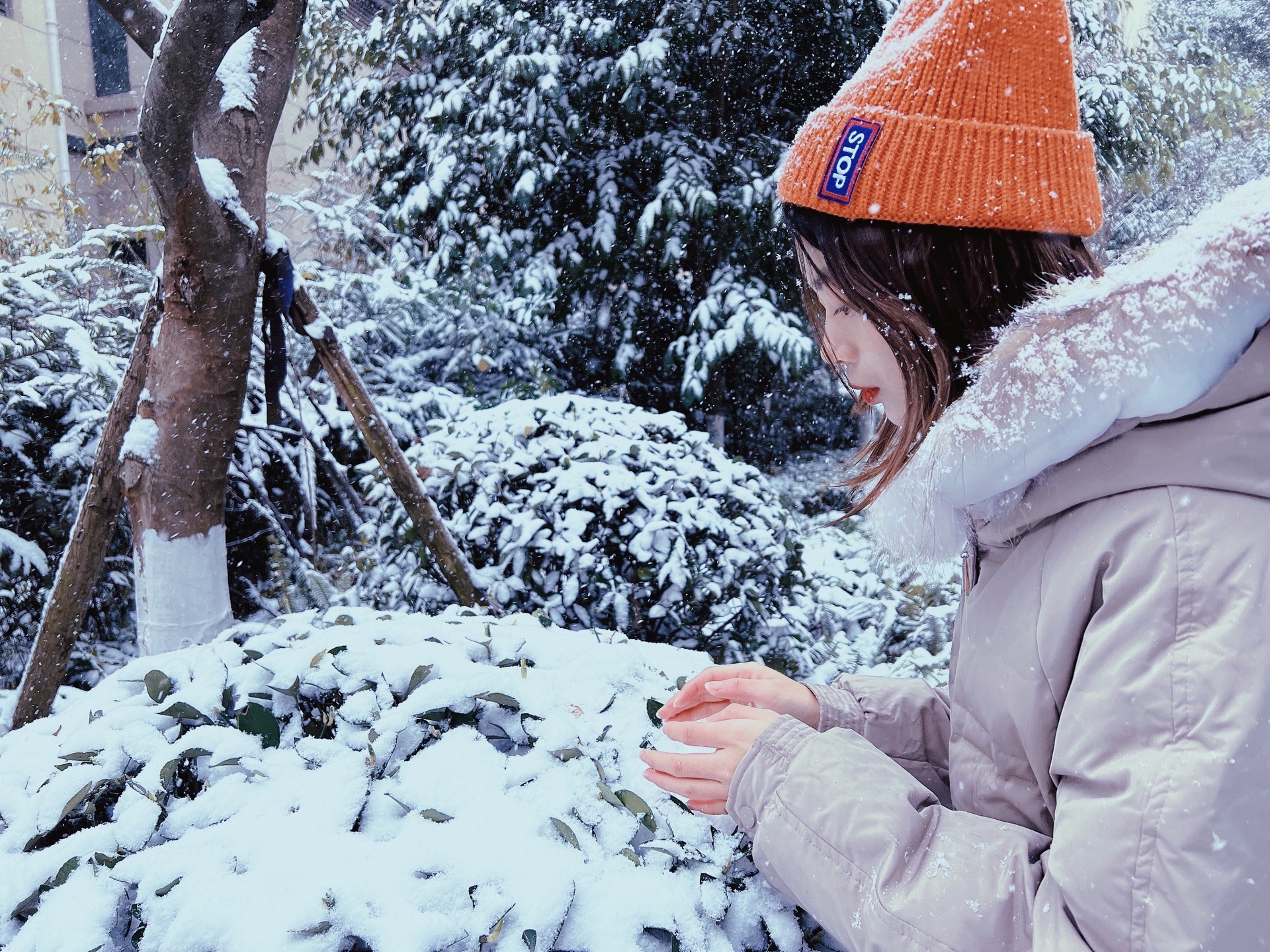 1.找一棵落了雪的树,侧身站,垂眸微笑,一定要拍到局部垂下的树枝哦🌿