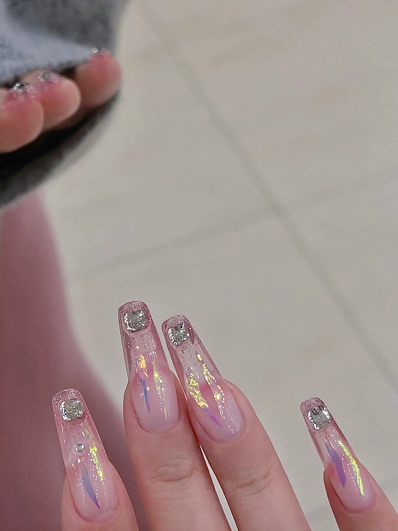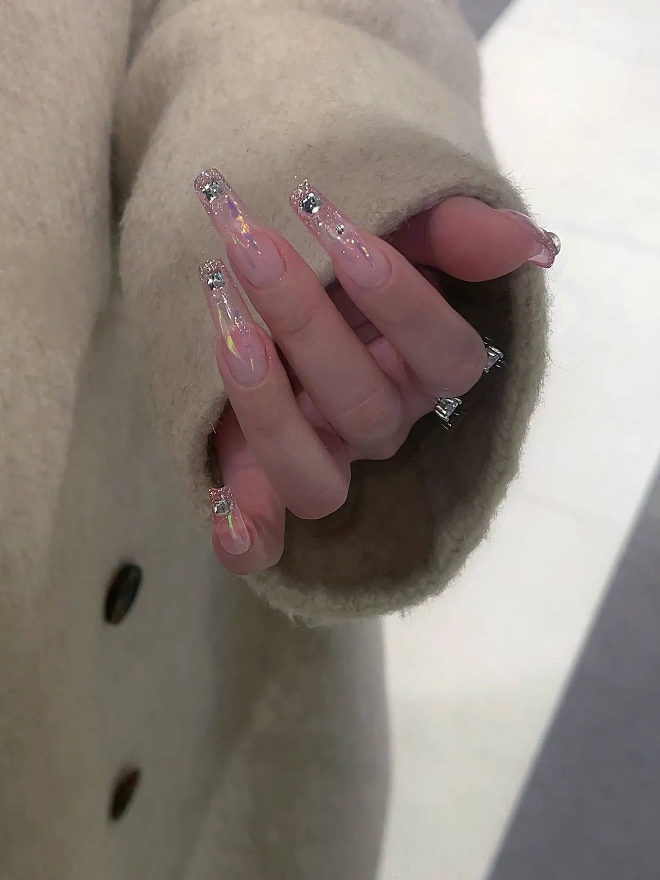 🎈做法:冰透粉渐变打底一层就可以👉粉色碎钻胶指尖渐变刷一层👉贴玻璃纸 一定要细细长长的 不要宽👉贴一个正方形的钻